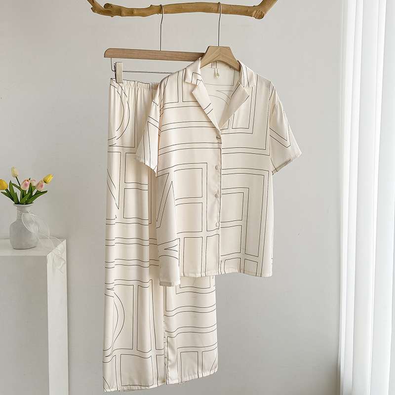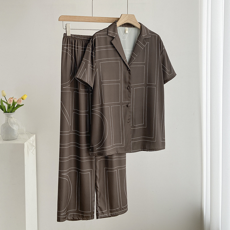 잠옷 여성의 여름 게으른 하이 엔드 아이스 실크 카디건 긴팔 니치 라이트 럭셔리 여성용 프린트 세트 홈 의류