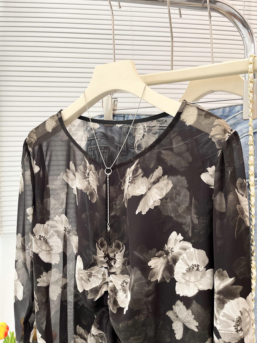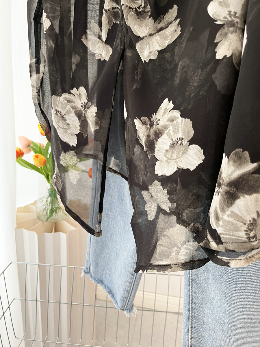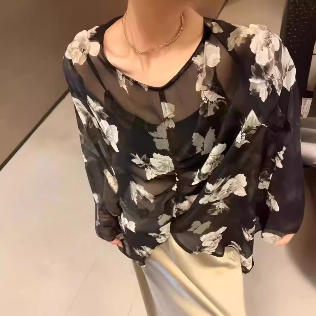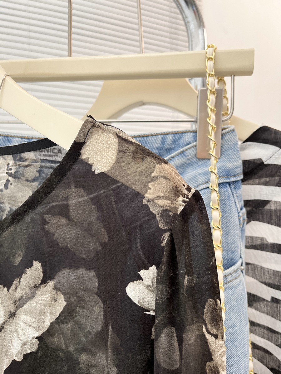 유럽산 디자인 센스 플로럴 쉬폰 탑 여성 여름 2024 새로운 한국식 틈새 슬리밍 V 넥 마이크로 투명 선 스크린 의류스토어 가기