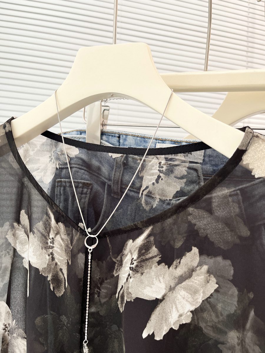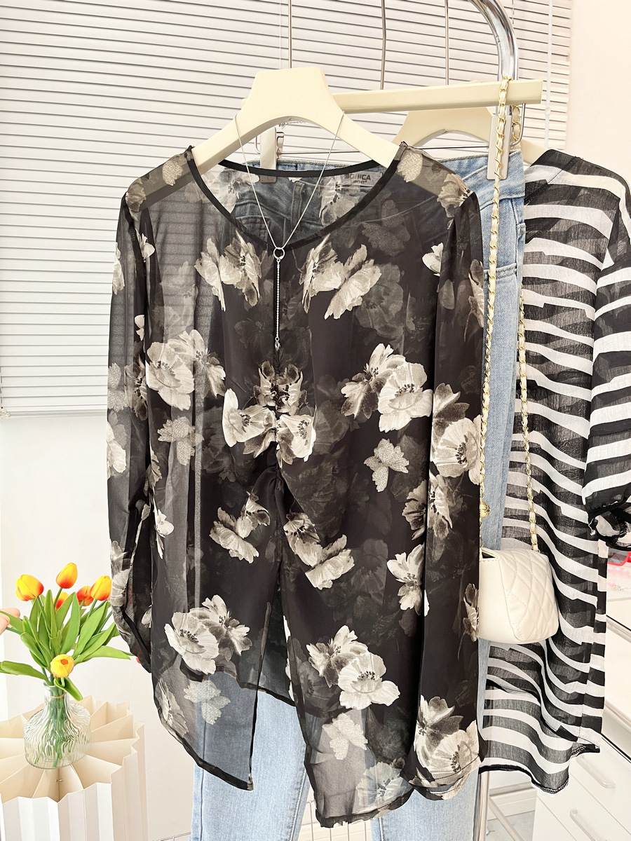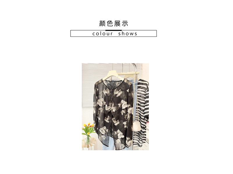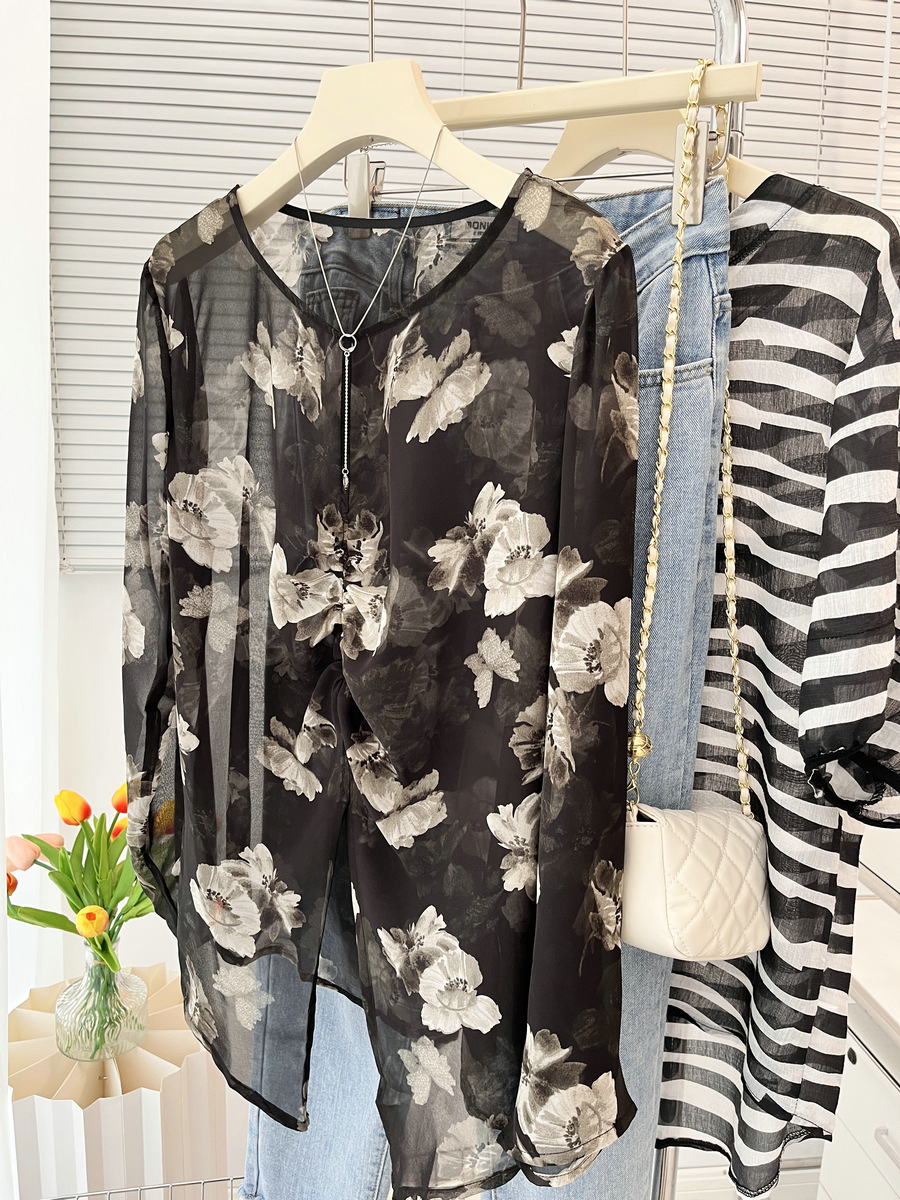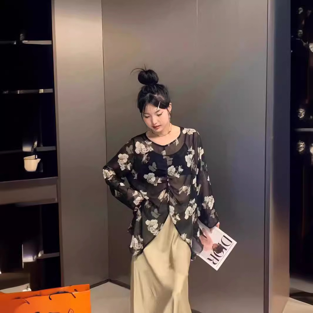 유럽산 디자인 센스 플로럴 쉬폰 탑 여성 여름 2024 새로운 한국식 틈새 슬리밍 V 넥 마이크로 투명 선 스크린 의류스토어 가기