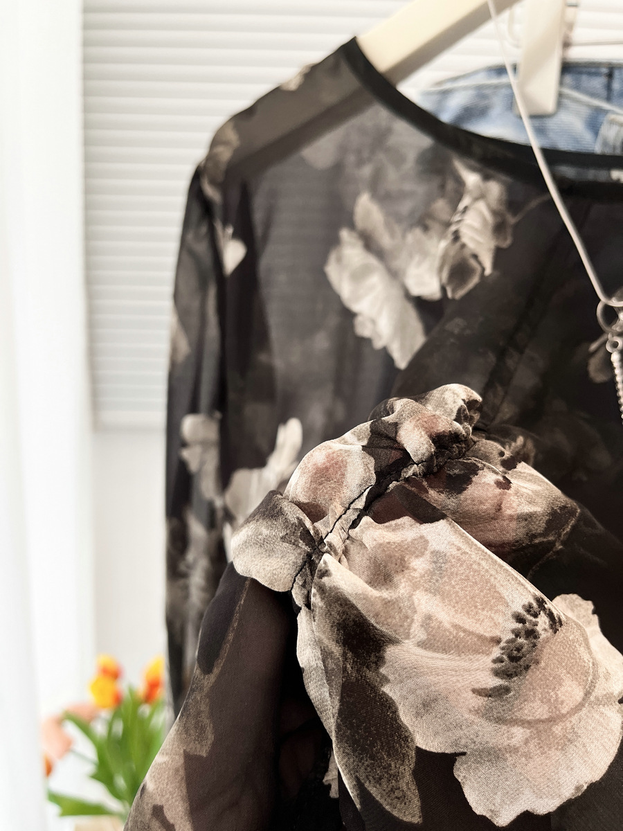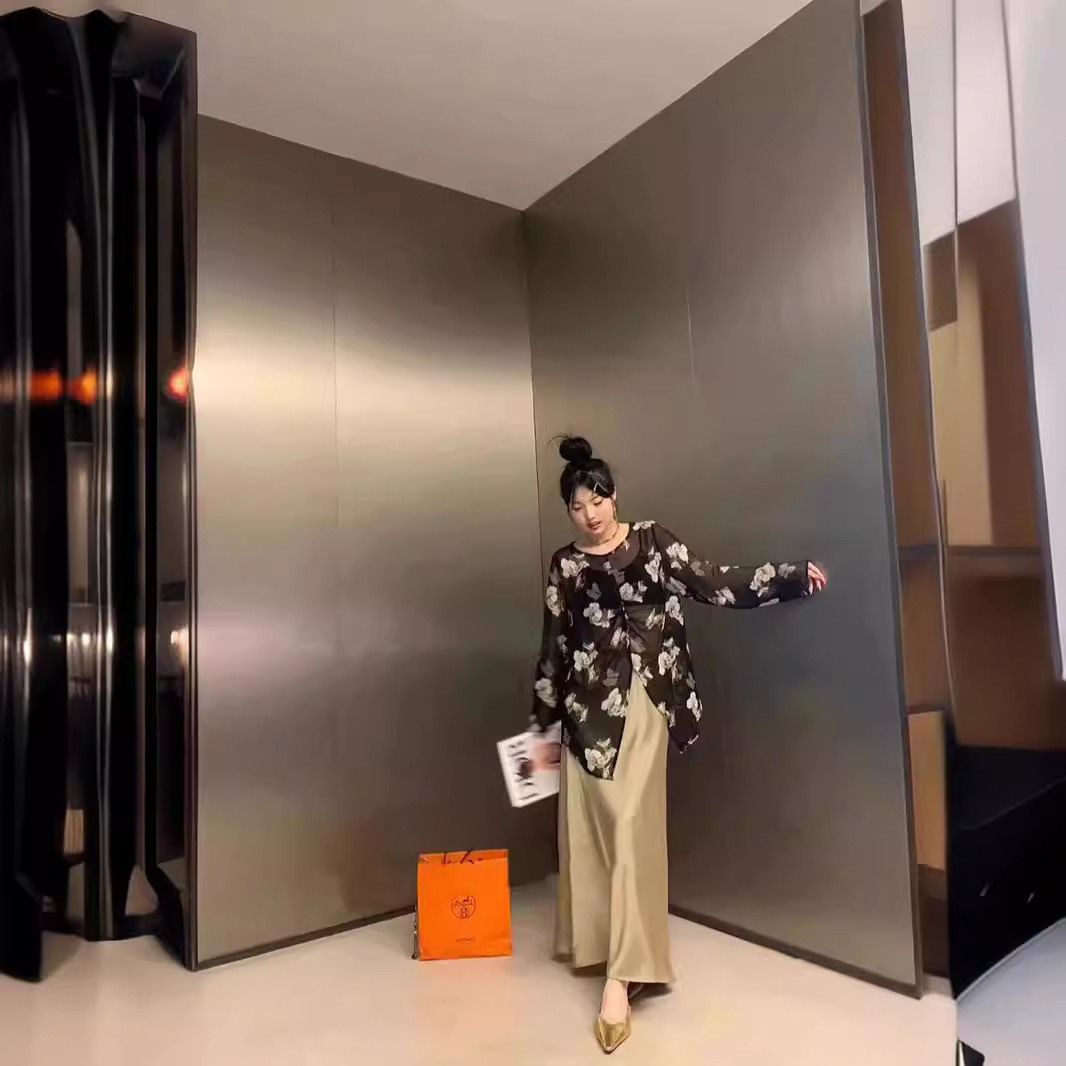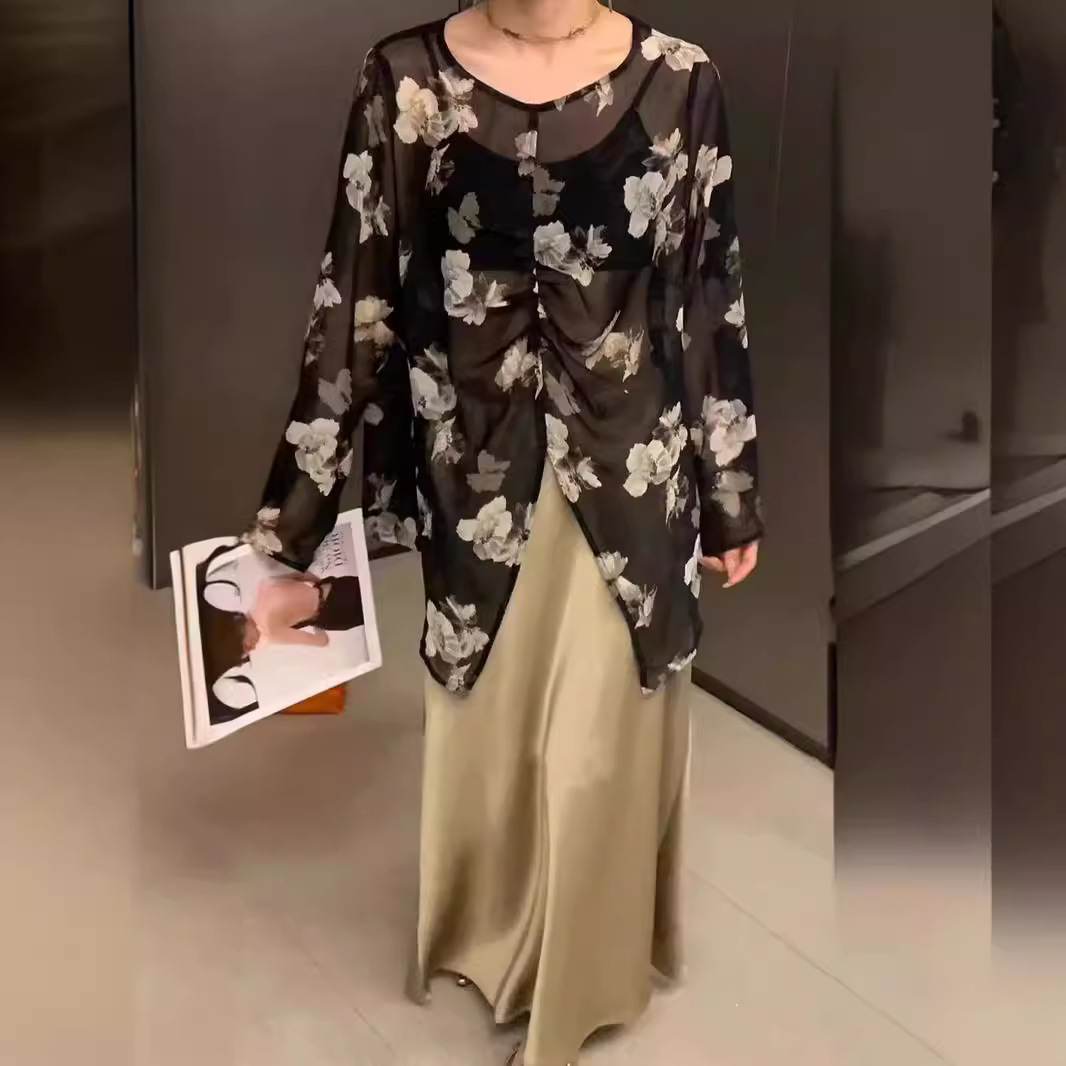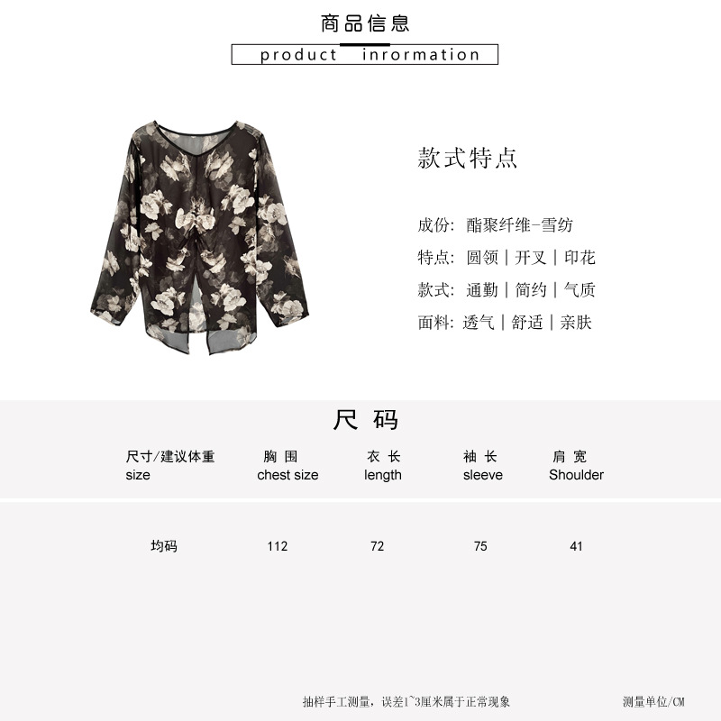 유럽산 디자인 센스 플로럴 쉬폰 탑 여성 여름 2024 새로운 한국식 틈새 슬리밍 V 넥 마이크로 투명 선 스크린 의류스토어 가기