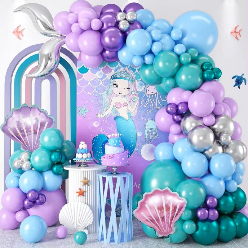 117PCS 인어 퍼플 워터 블루 실버 풍선 세트 바다 바닥 주의 파티 배경 장식스토어 가기