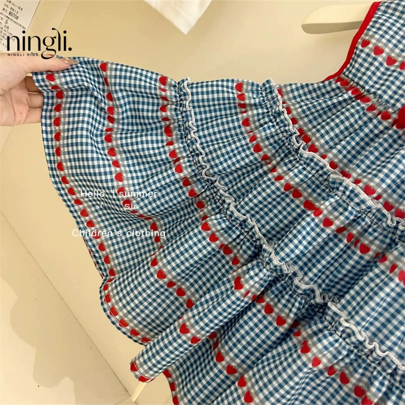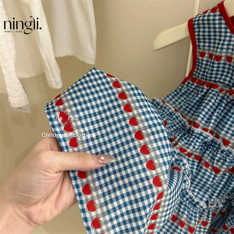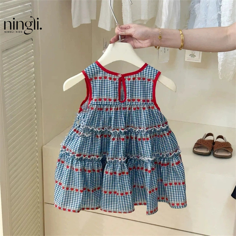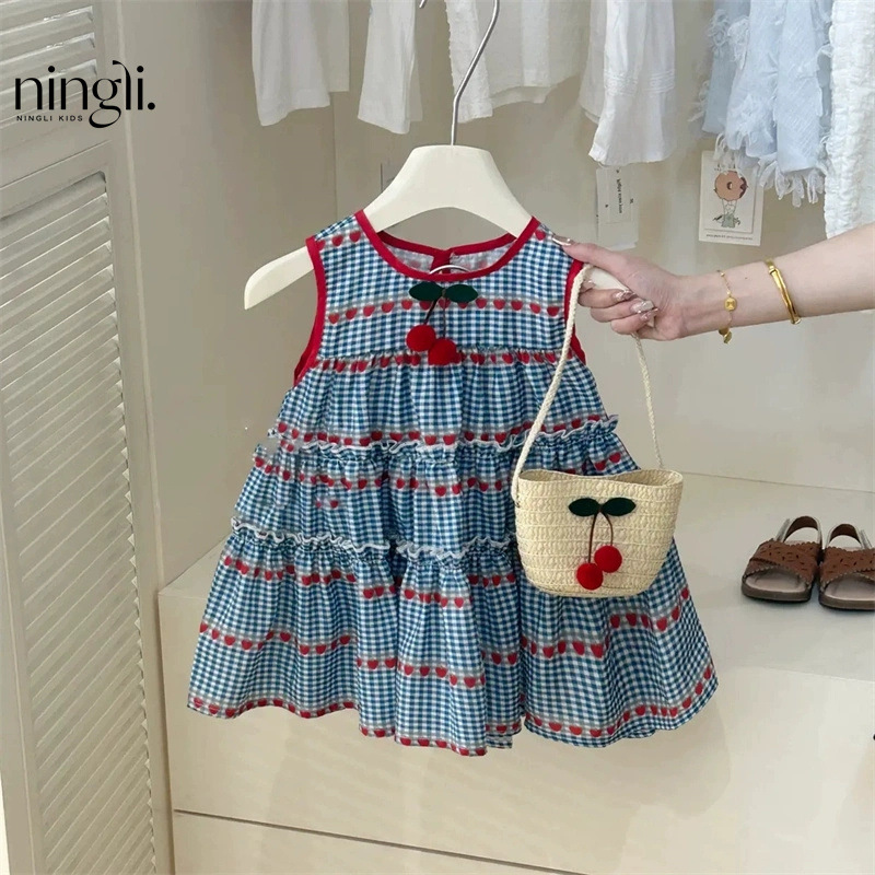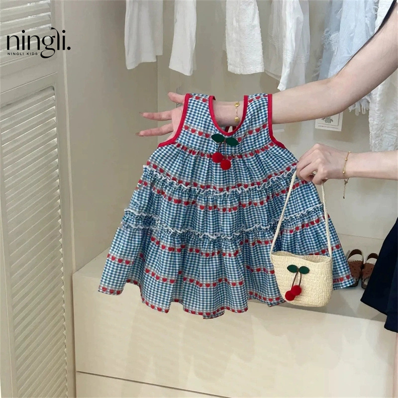 라임 아동복 여름 새 소녀 스위트 블루 체크 민소매 원피스 소녀 아기 체리 조끼 원피스 트렌디스토어 가기