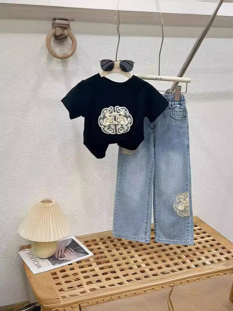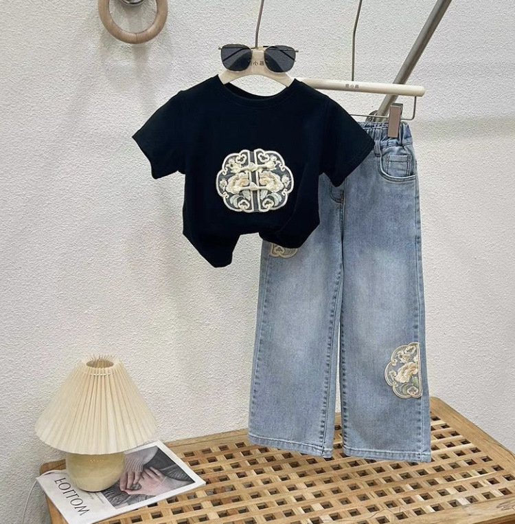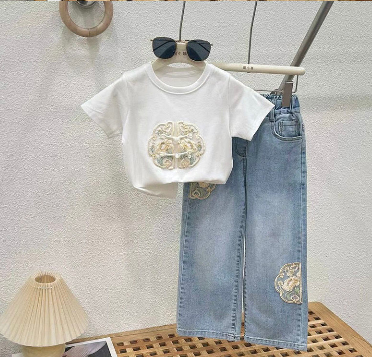 소녀의 새로운 중국 스타일 세트 여름 2024 새로운 어린이 중국 스타일 티셔츠 청바지 국가 스타일 투피스 여름 원피스