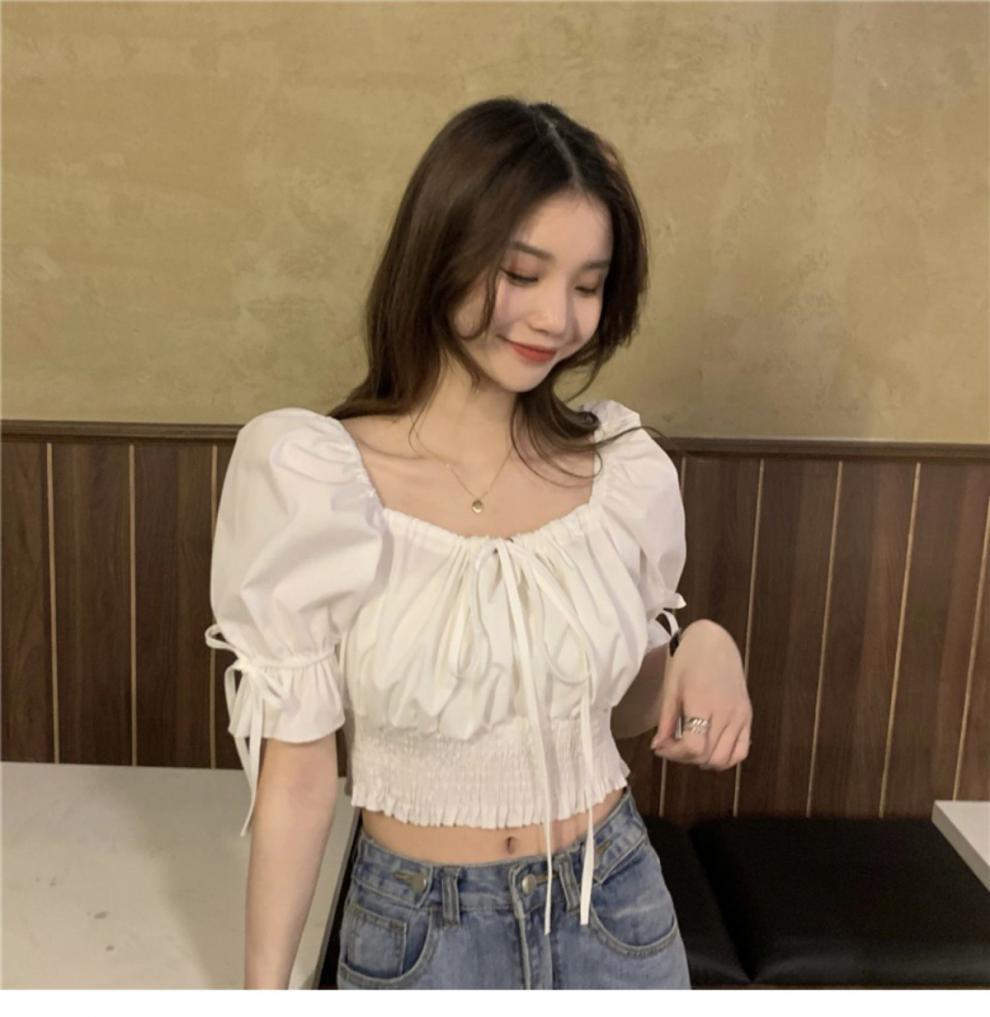 스퀘어 칼라 퍼프 슬리브 셔츠 여성 디자인 센스 틈새 여름 높은 허리 배꼽 노출 짧은 달콤한 쉬폰 짧은 소매 얇은 탑스토어 가기