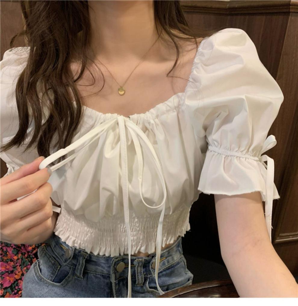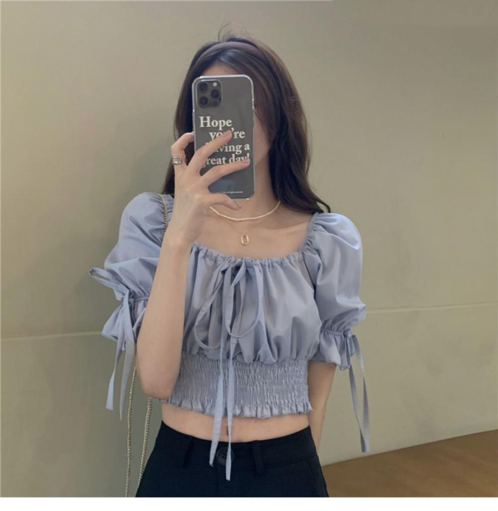 스퀘어 칼라 퍼프 슬리브 셔츠 여성 디자인 센스 틈새 여름 높은 허리 배꼽 노출 짧은 달콤한 쉬폰 짧은 소매 얇은 탑