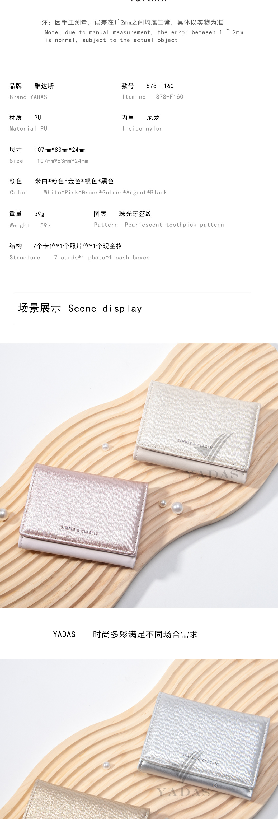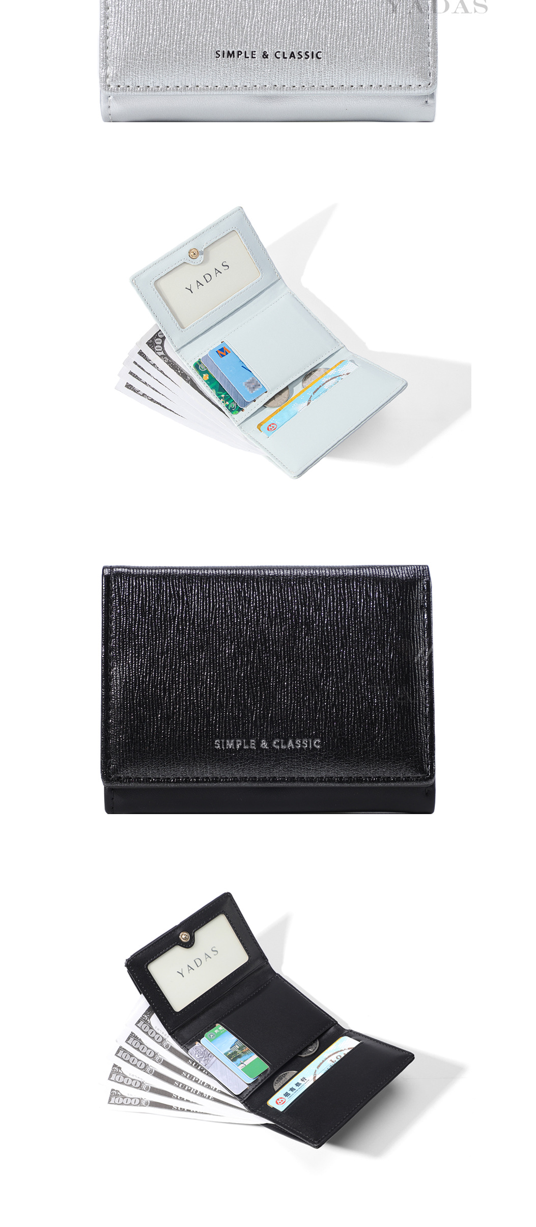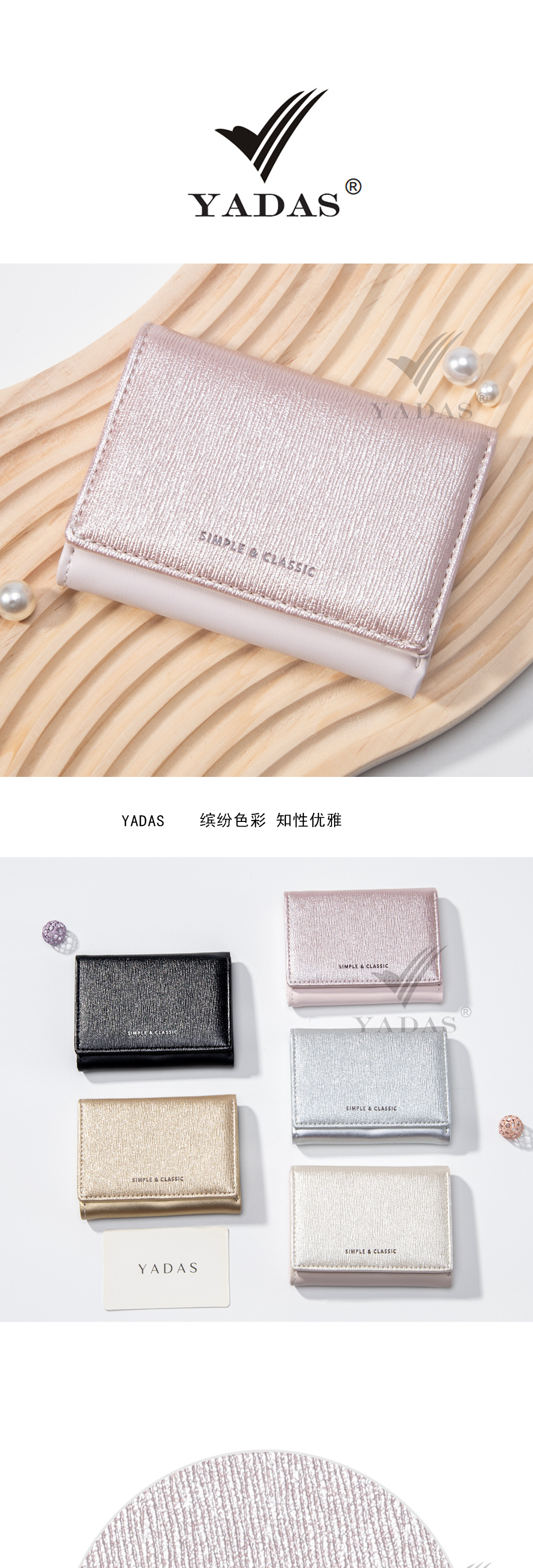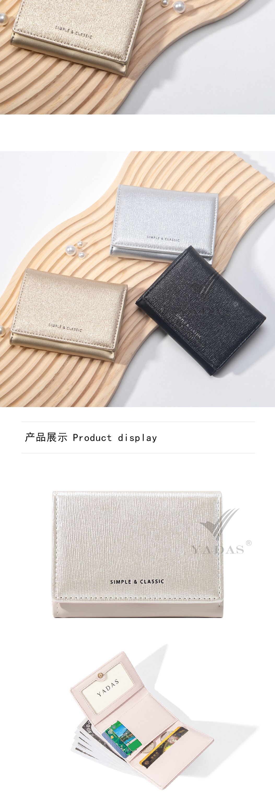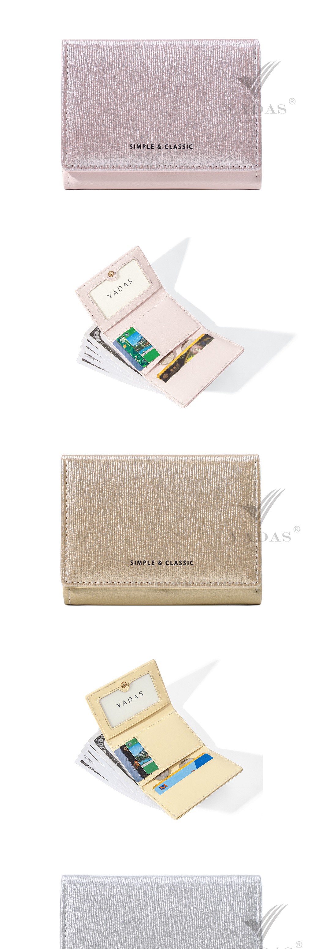 [진주 빛] YADAS 간단한 여성 카드 가방 패션 골드 및 실버 PU 가죽 짧은 트라이 폴드 코인 지갑