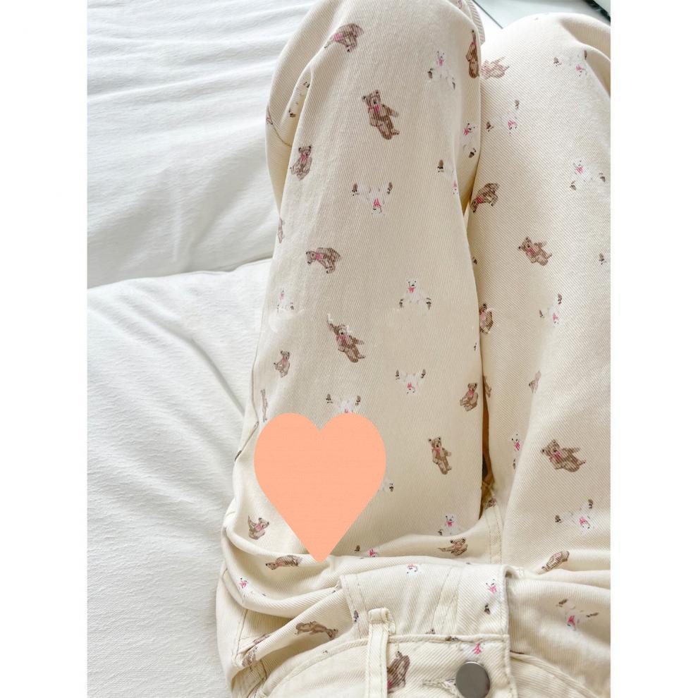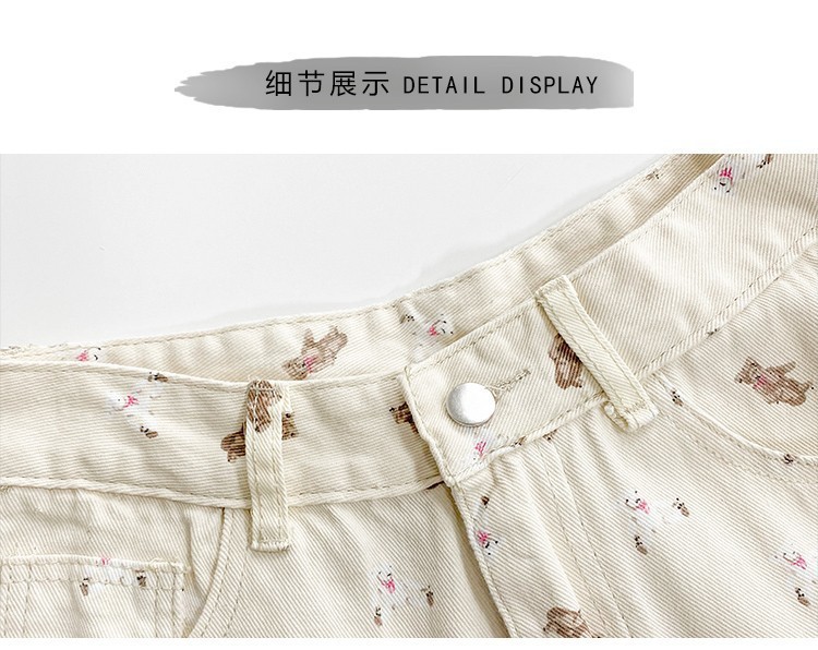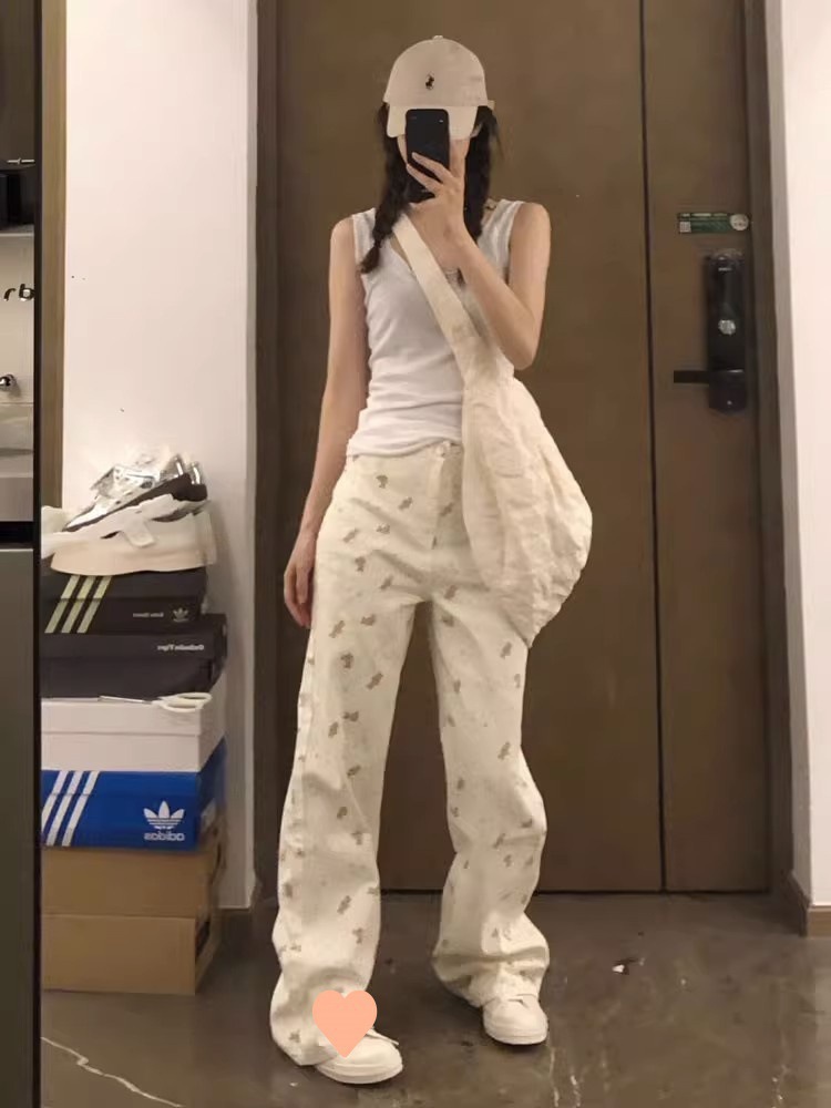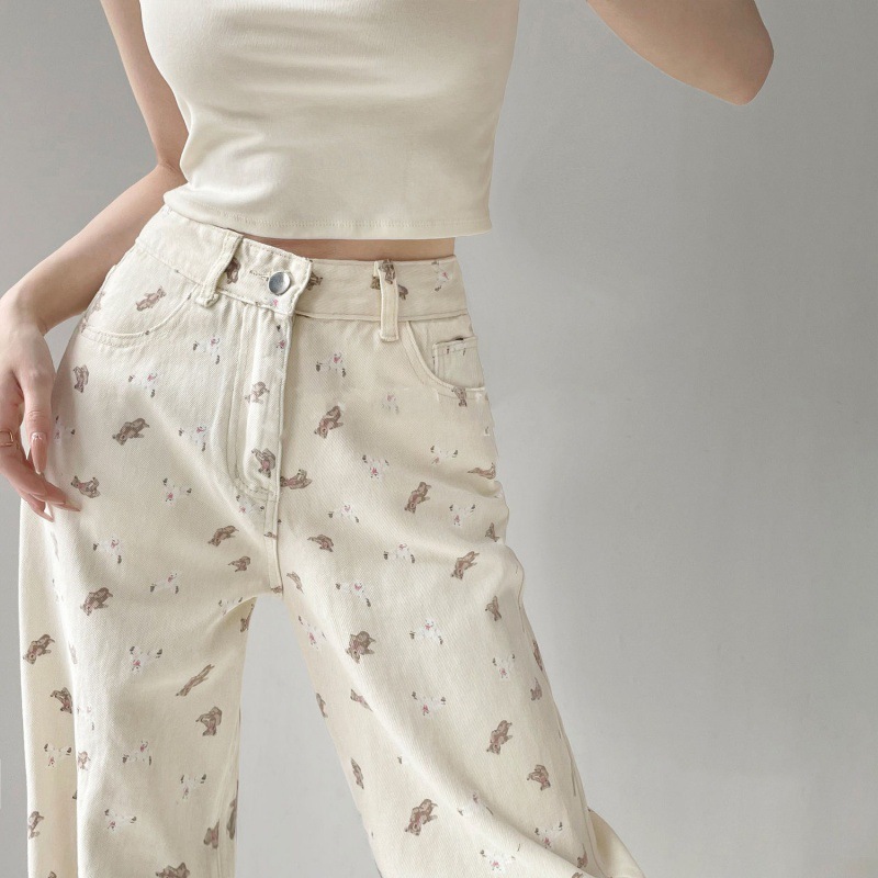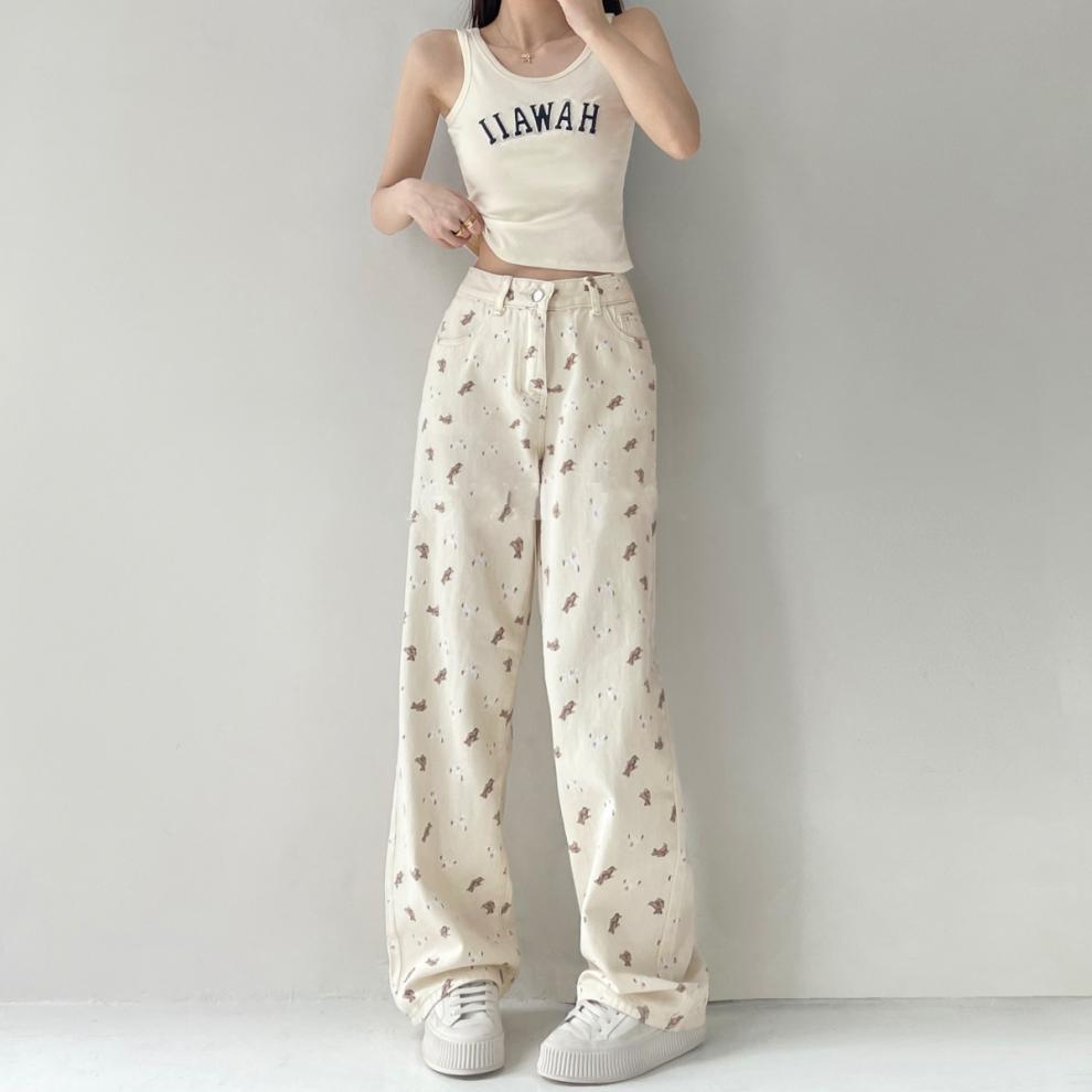 아메리칸 스타일 레트로 하이 스트리트 베어 프린트 청바지 여성 여름 높은 허리 느슨한 캐주얼 스트레이트 와이드 다리 바지스토어 가기