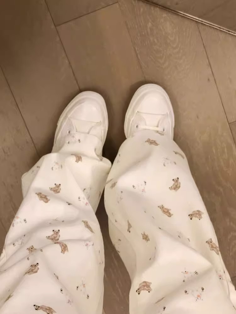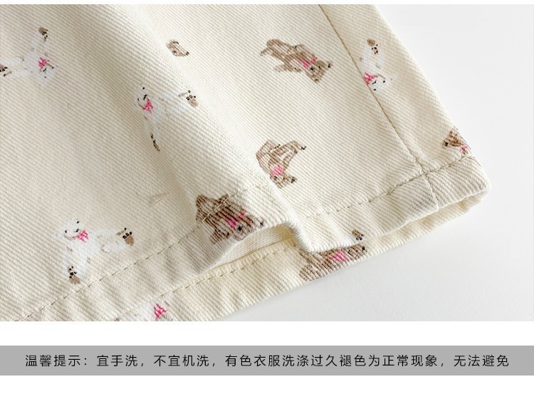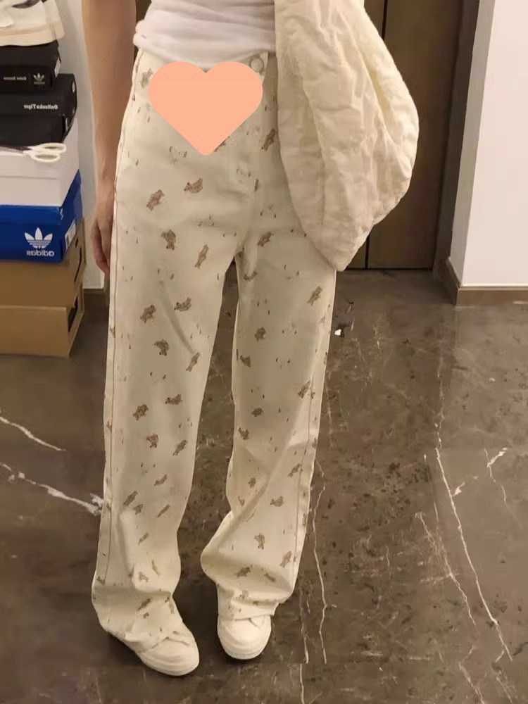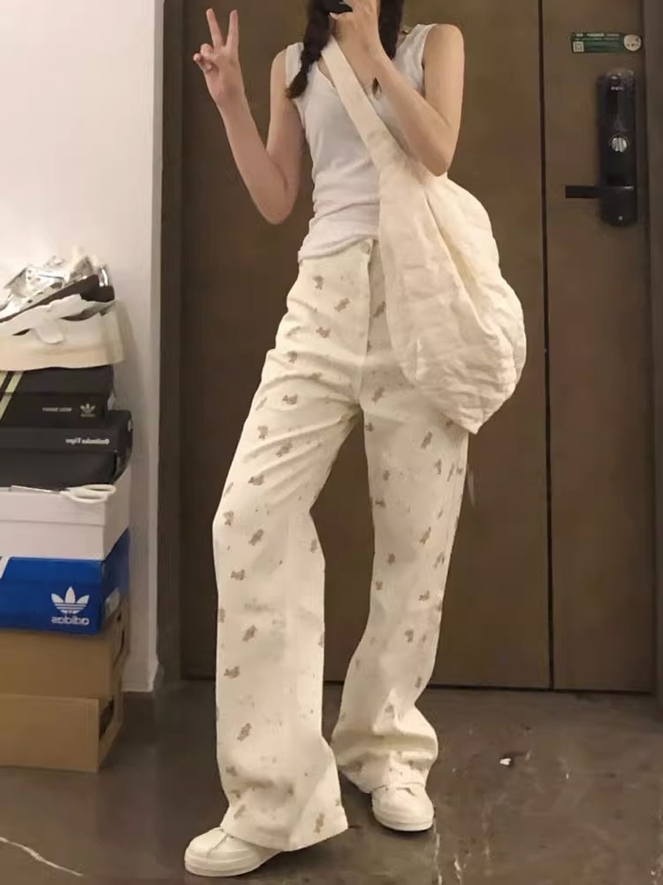 아메리칸 스타일 레트로 하이 스트리트 베어 프린트 청바지 여성 여름 높은 허리 느슨한 캐주얼 스트레이트 와이드 다리 바지