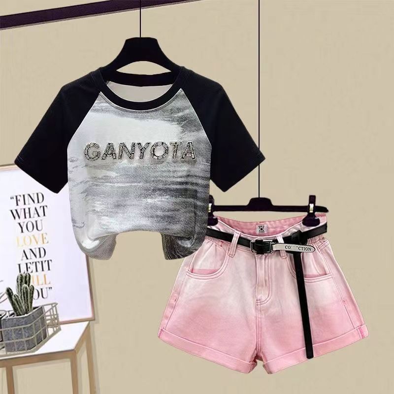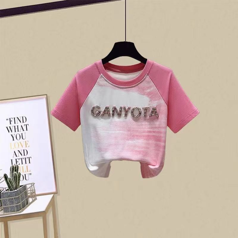 • 핑크 편지 짧은 소매 검은 짧은 소매