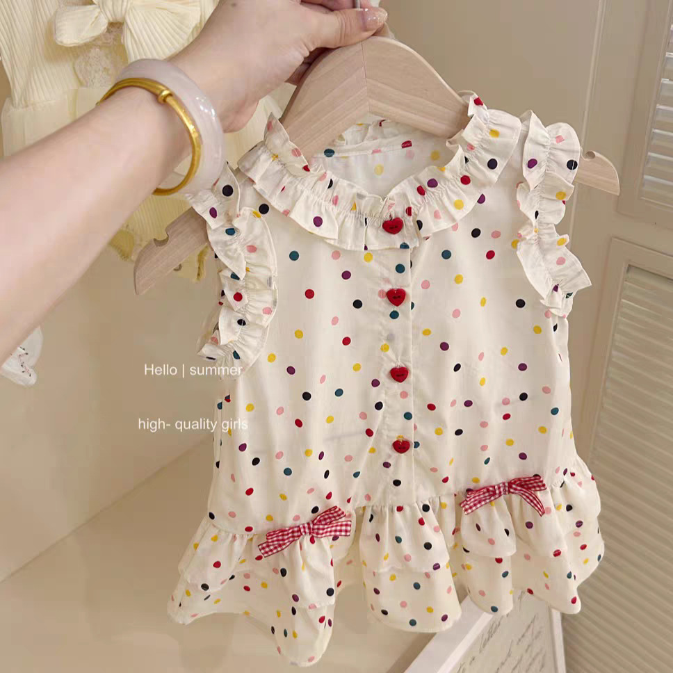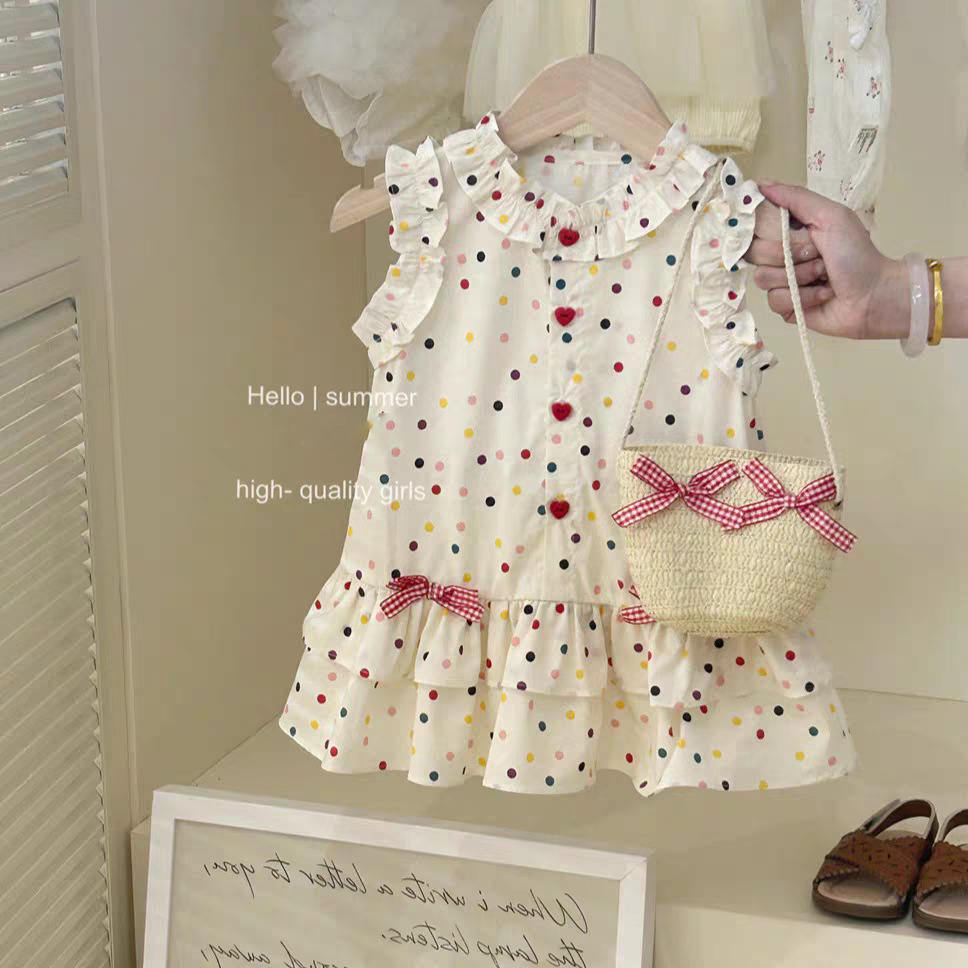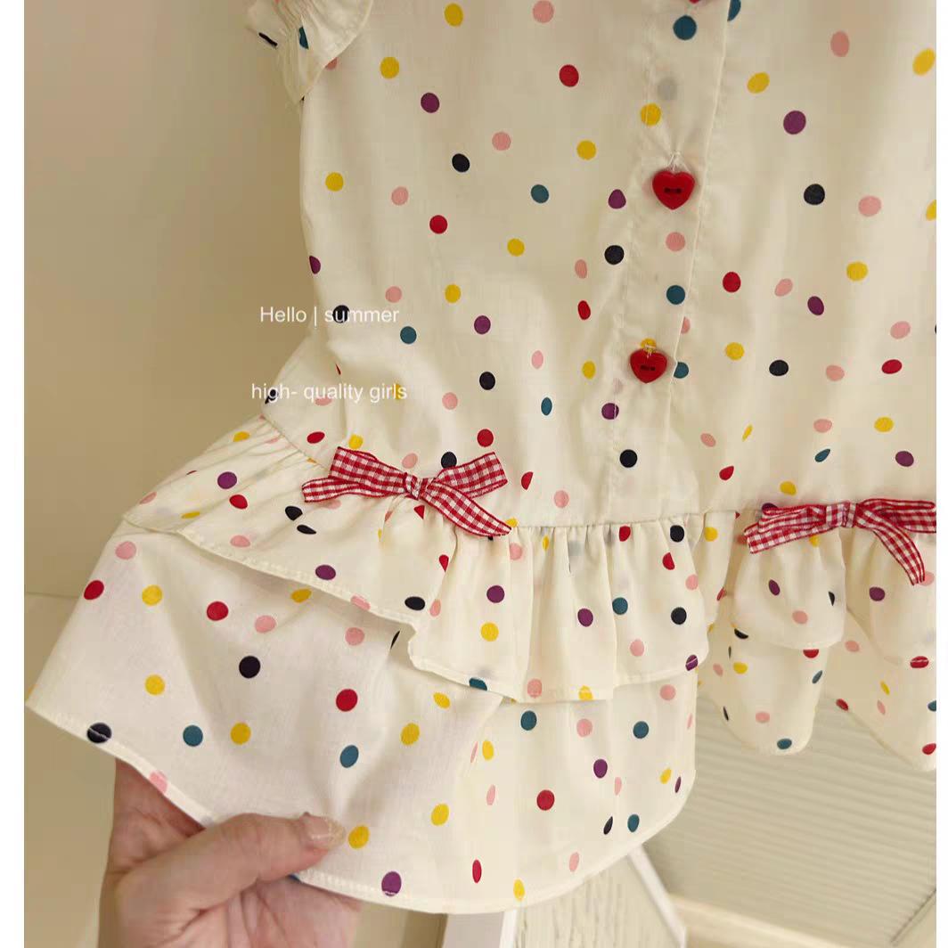 Tong Xingyuan 한국 소녀의 여름 새로운 컬러 웨이브 도트 원피스 아기의 세련된 원피스 레이스 유행 조끼 원피스스토어 가기