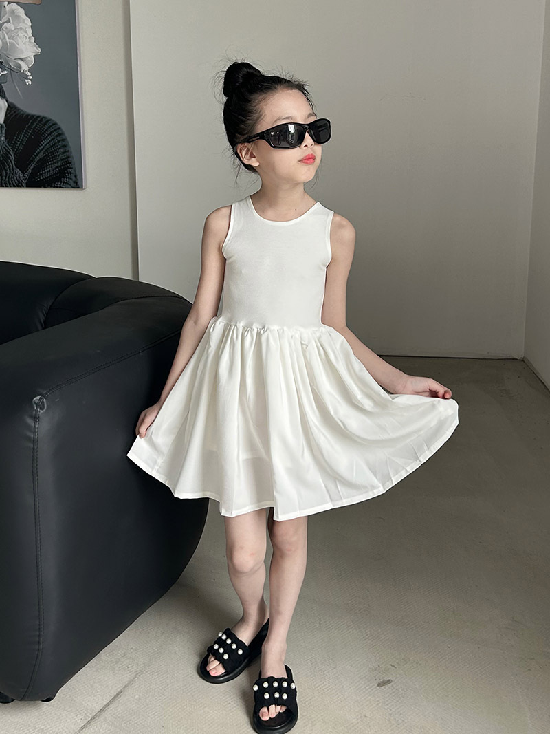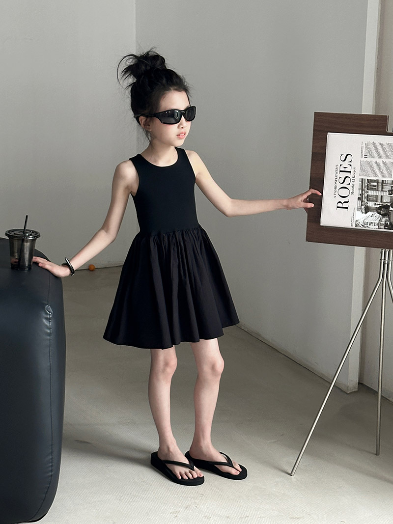 소녀 백리스 원피스 2024 여름 민소매 조끼 공주 원피스 헵번 스타일 바느질 해변 원피스스토어 가기