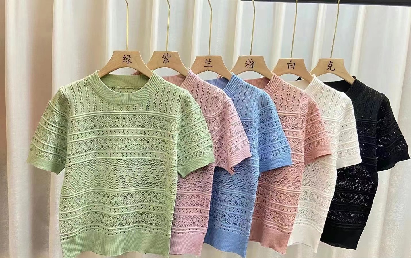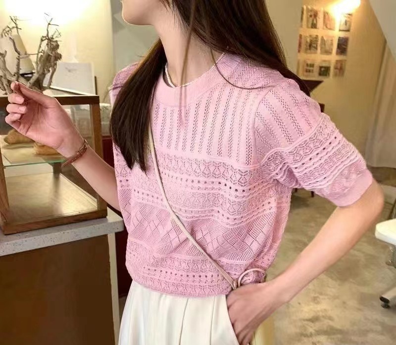 여성을위한 여름 새로운 한국 스타일 달콤한 라운드 넥 스웨터 디자인 중공 자카드 퍼프 슬리브 얇은 탑스토어 가기
