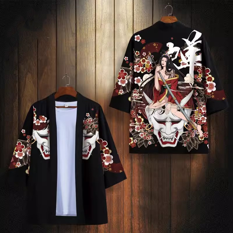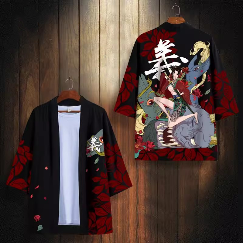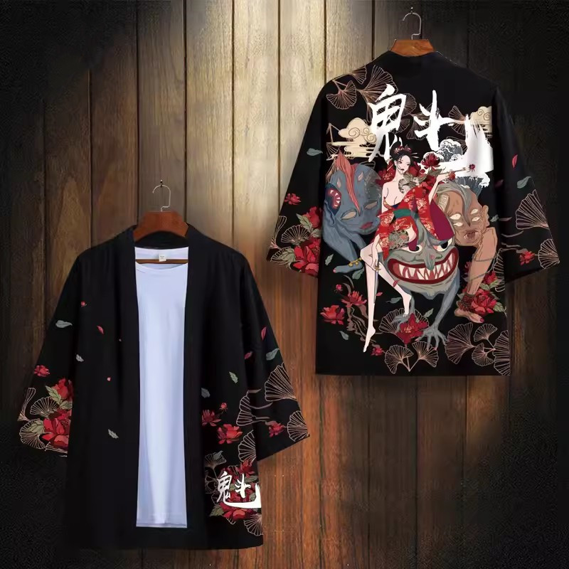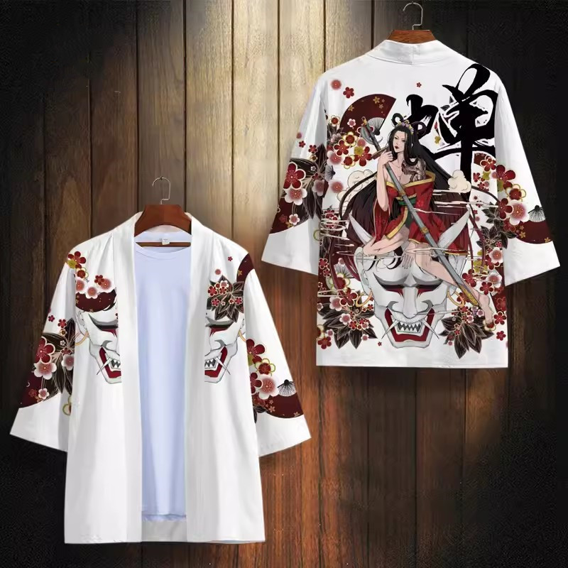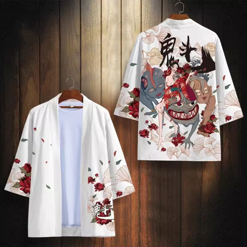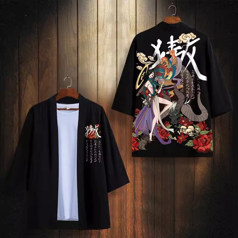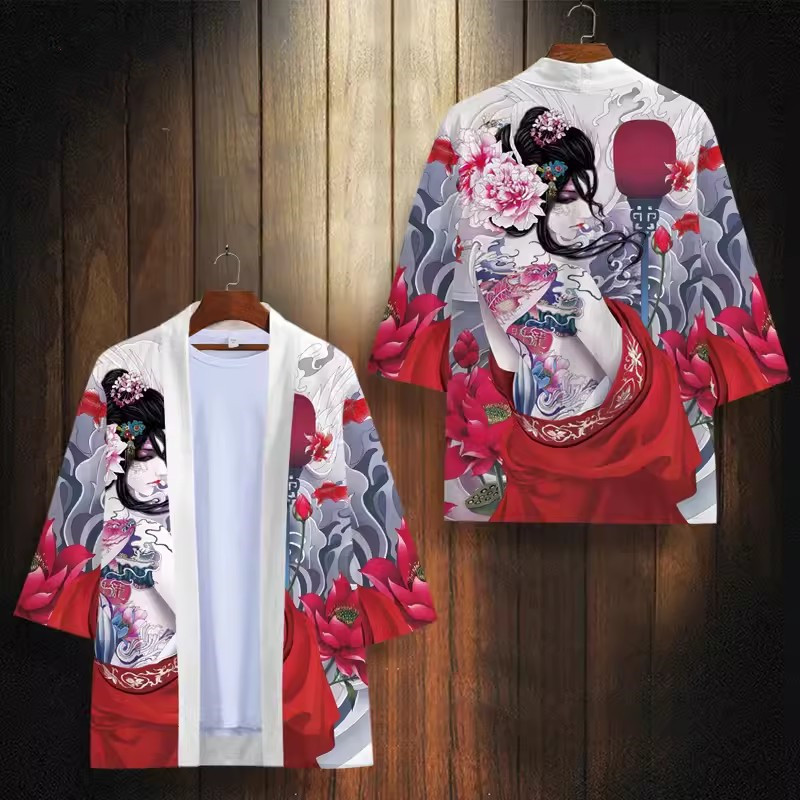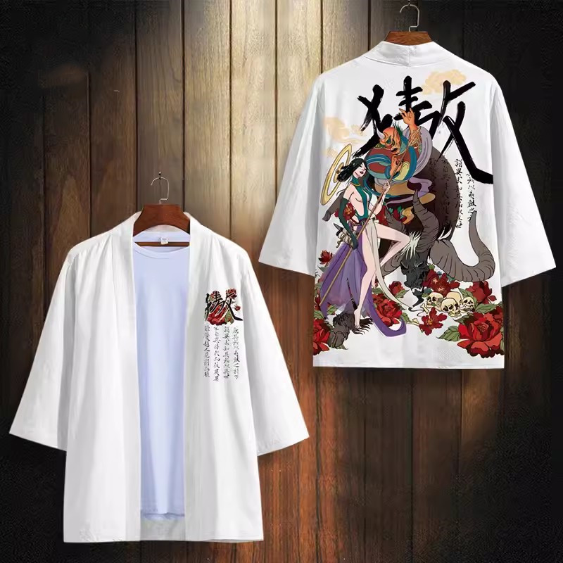 24 여름 새로운 중국 스타일 유행 브랜드 뷰티 시리즈 다오 세트 느슨한 핸섬 인쇄 기모노 목욕 가운