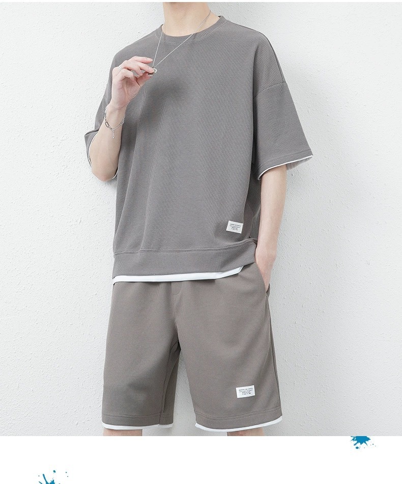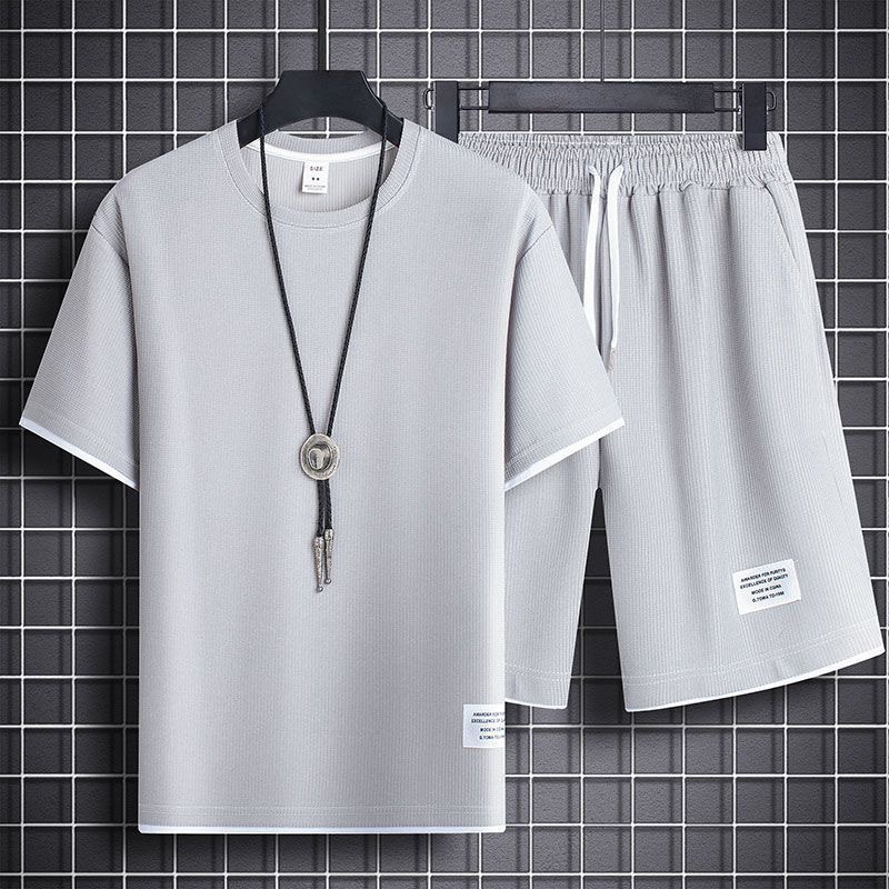 와플 캐주얼 세트 남자 여름 아이스 실크 반팔 티셔츠 남성복 세트 잘 생긴 플러스 사이즈 스포츠 세트
