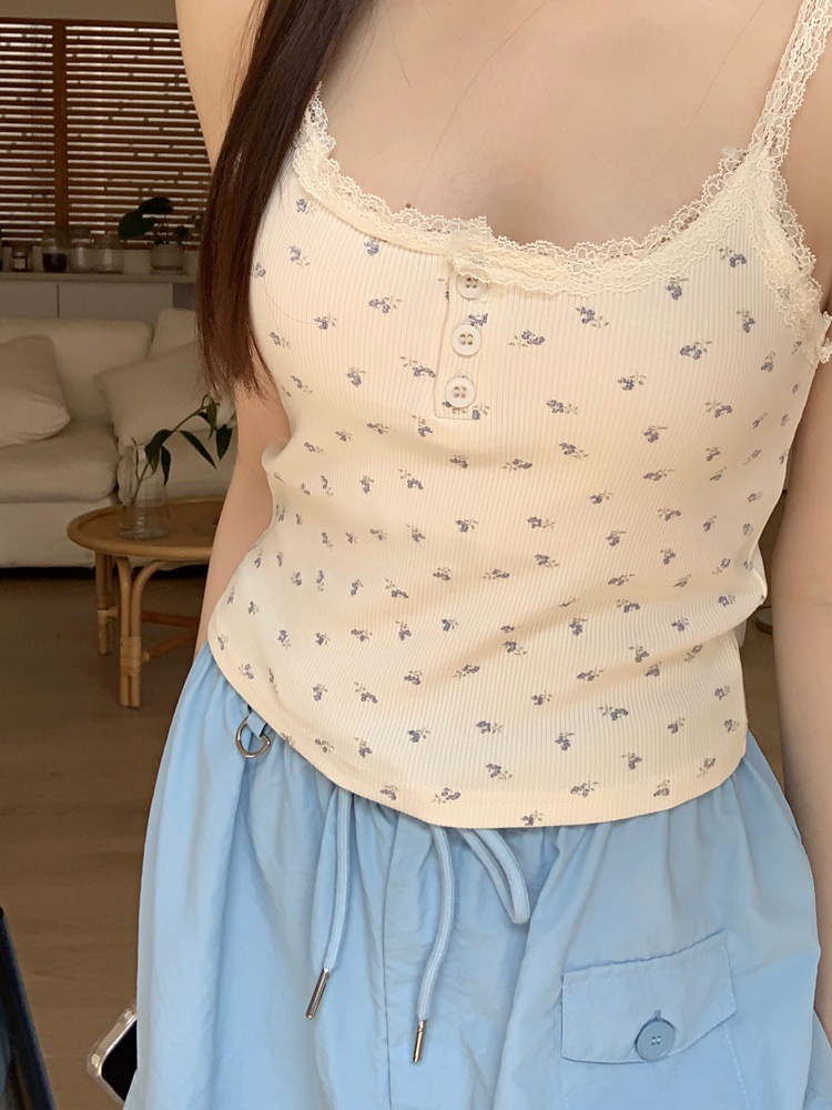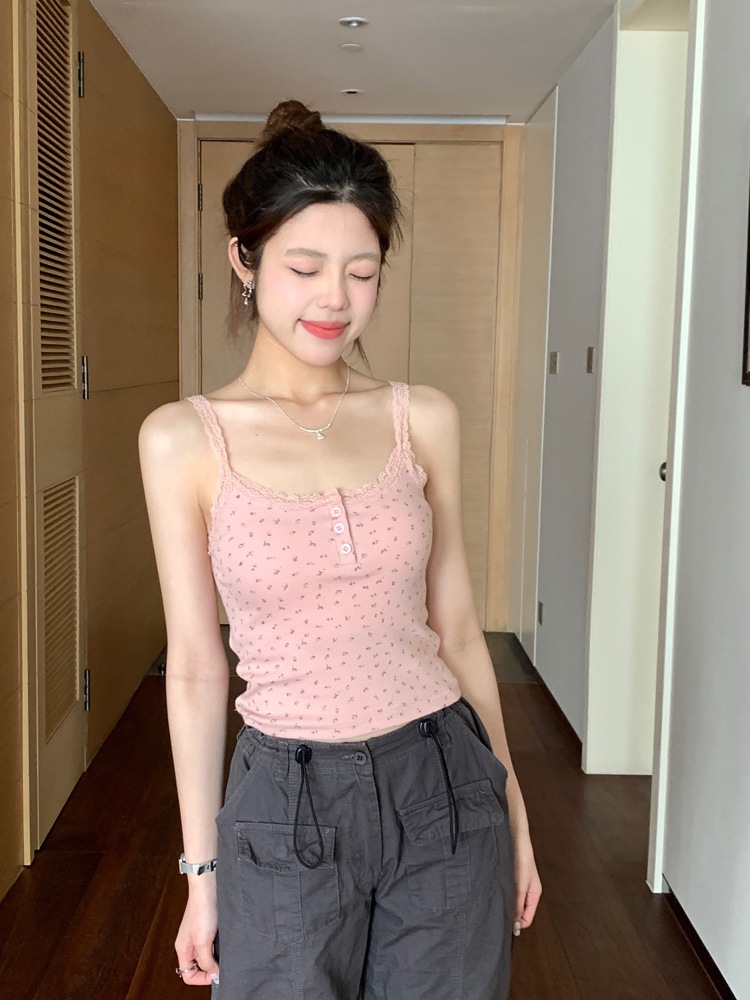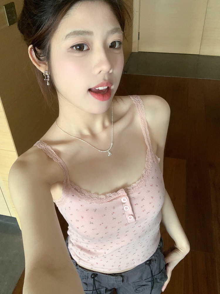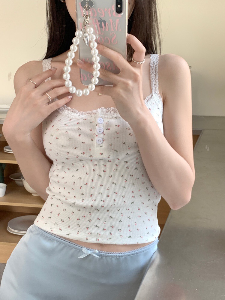 바람과 연령 감소에 대한 순수한 욕망 인테리어 아이스 실크 슬링 프랑스 소녀 레이스 엣지 버튼 꽃베이스 조끼 민소매 탑