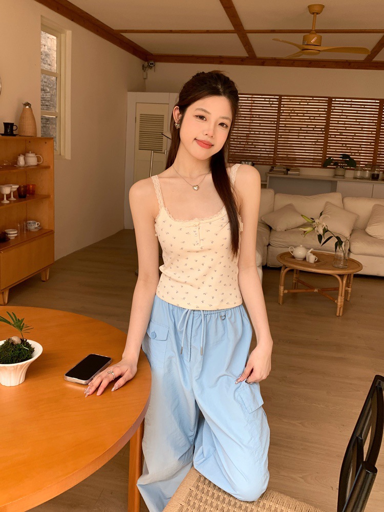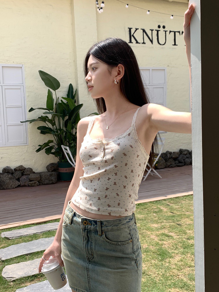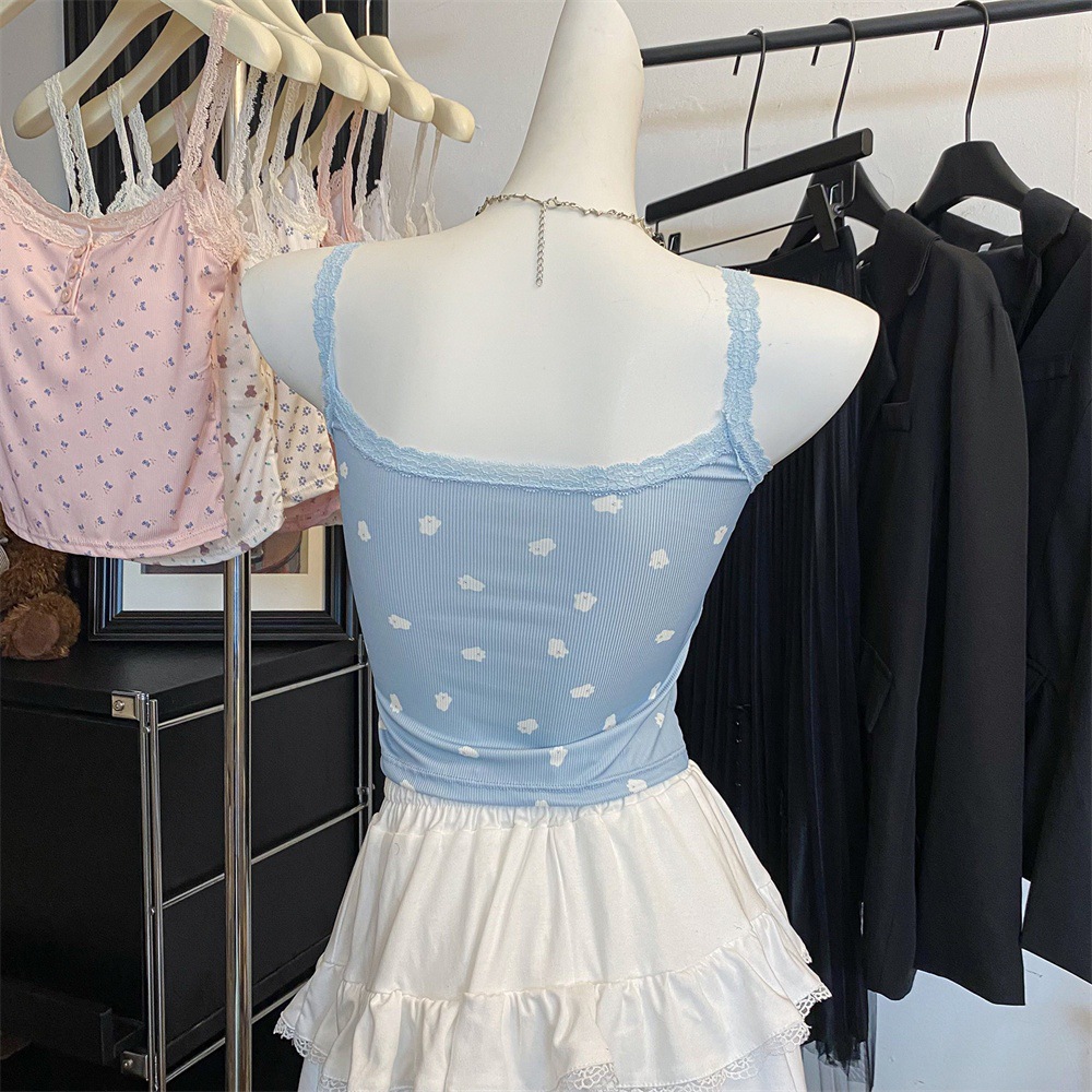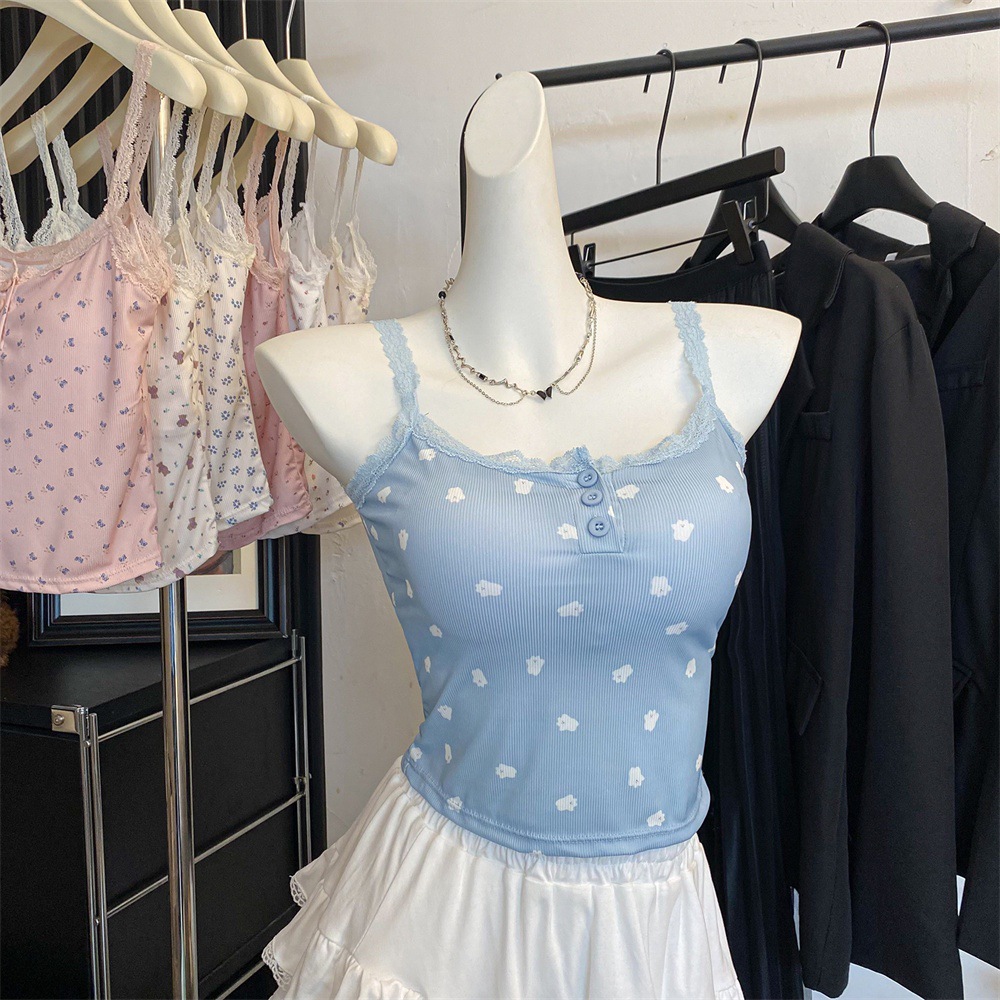 바람과 연령 감소에 대한 순수한 욕망 인테리어 아이스 실크 슬링 프랑스 소녀 레이스 엣지 버튼 꽃베이스 조끼 민소매 탑
