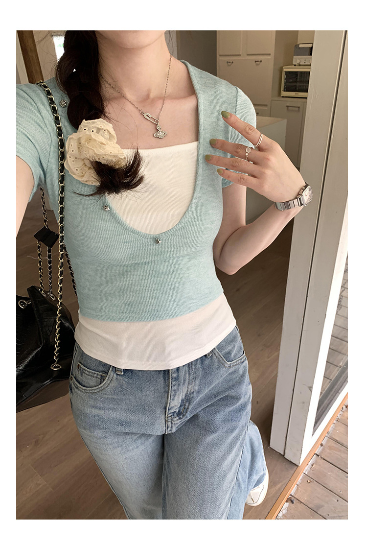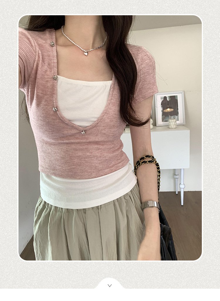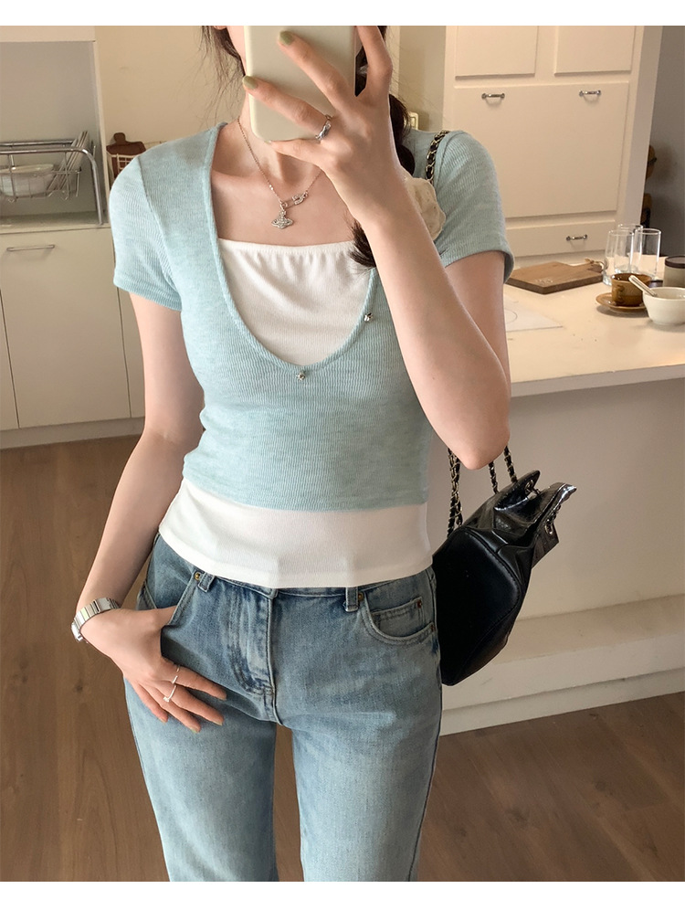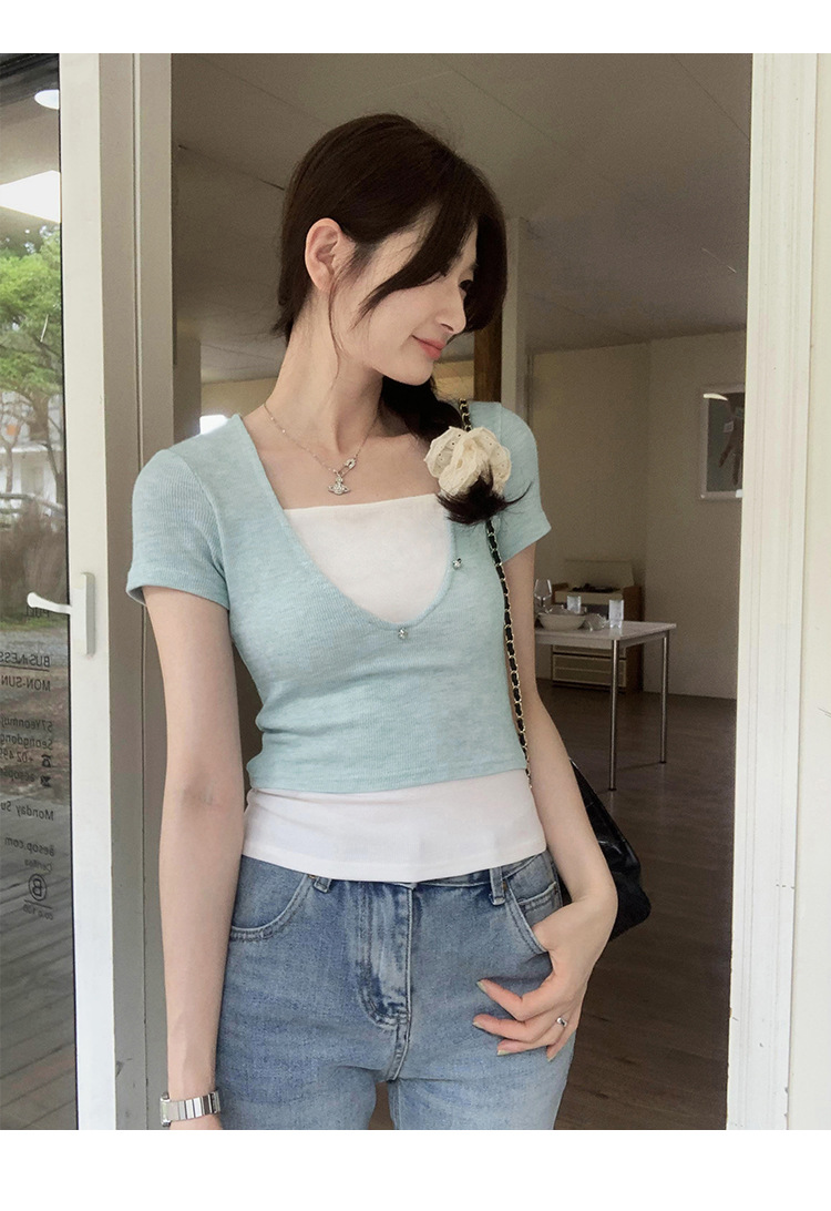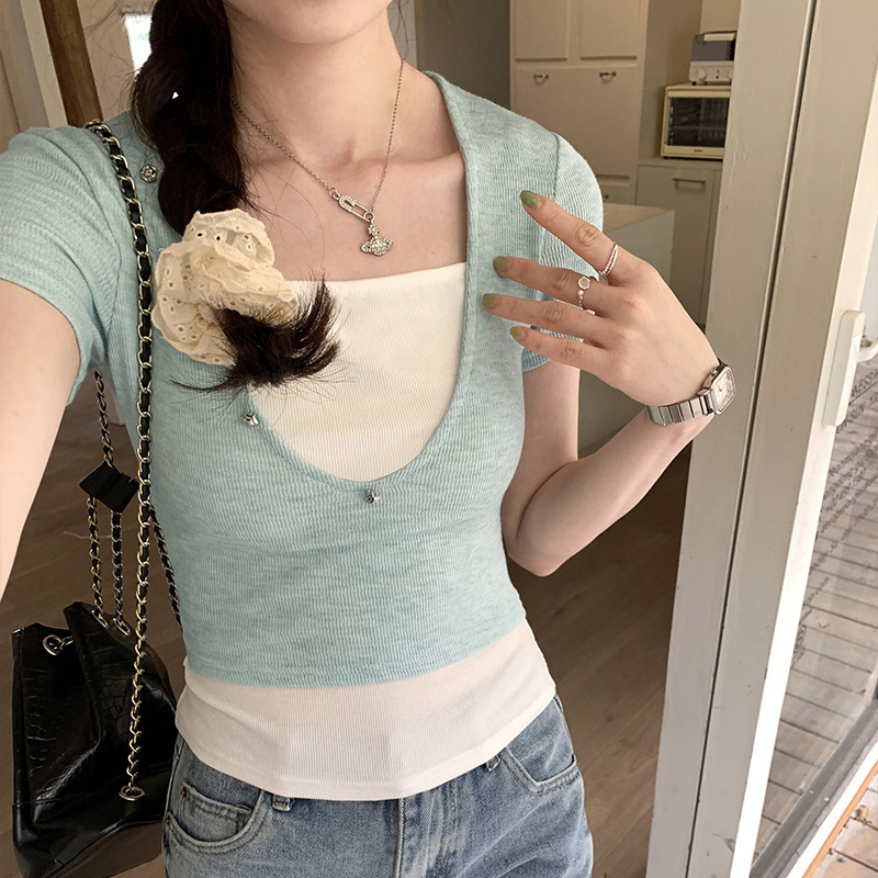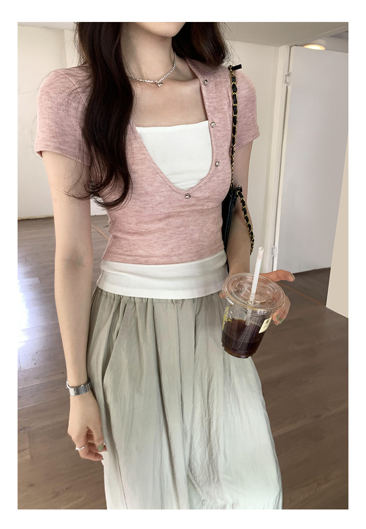 디자인 센스 페이크 두 개의 아름다운 반팔 티셔츠 여성의 2024 여름 새로운 슬림 핏 슬리밍 웨스턴 스타일 올 매치 탑