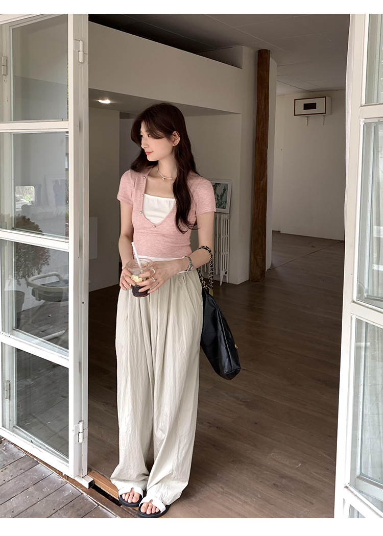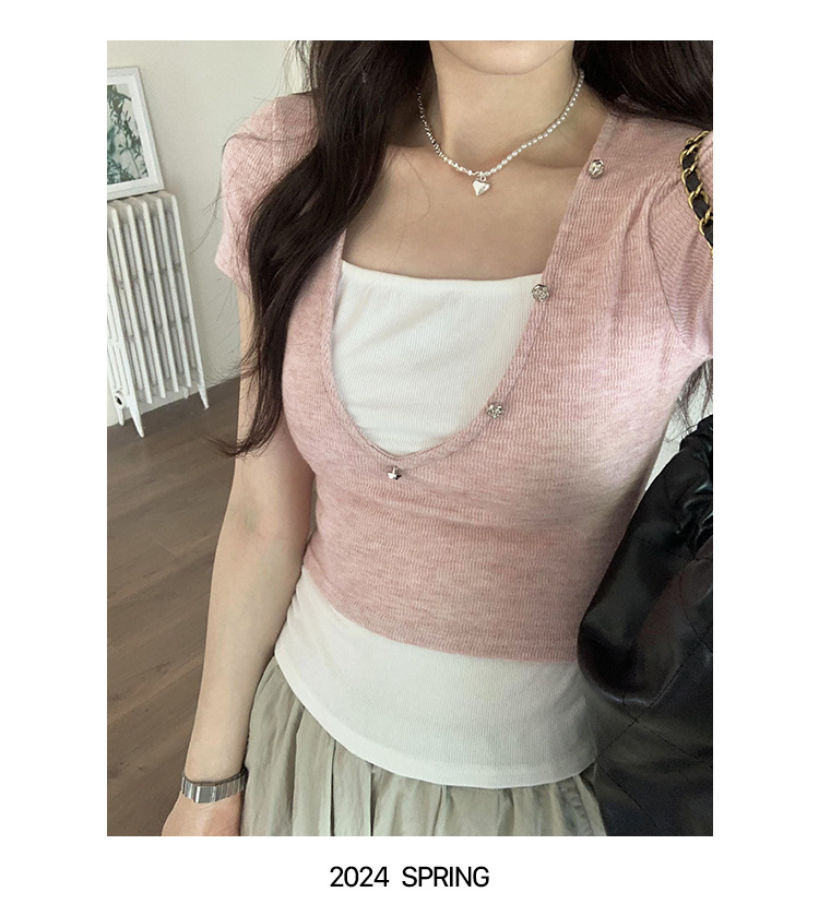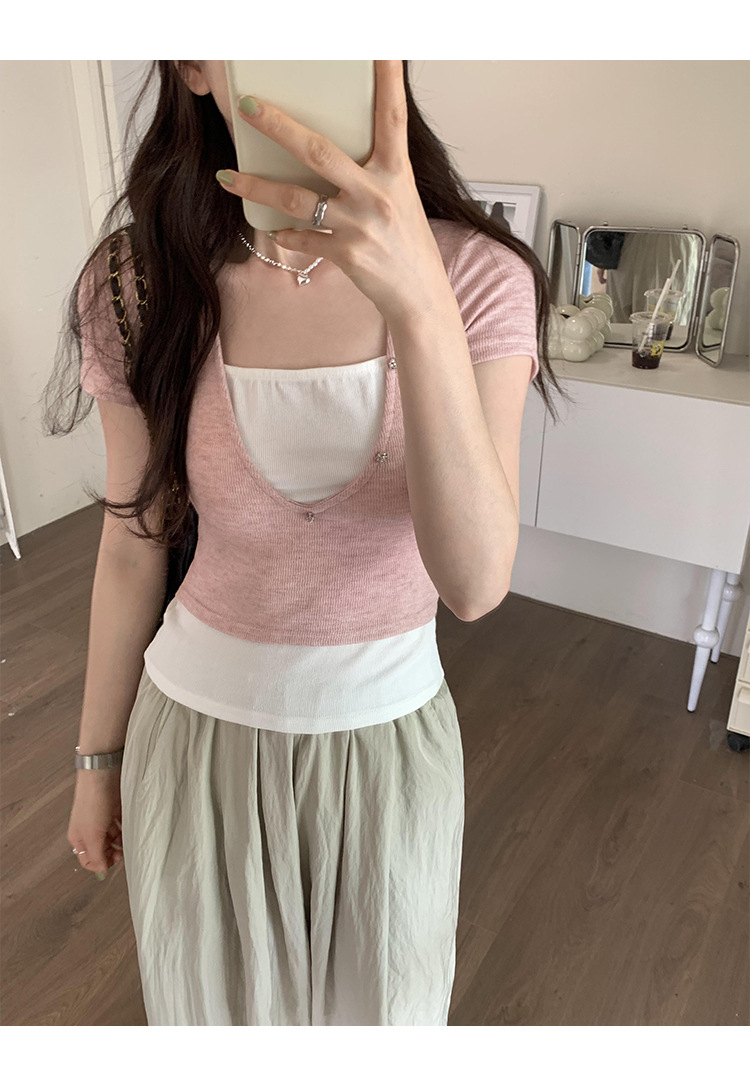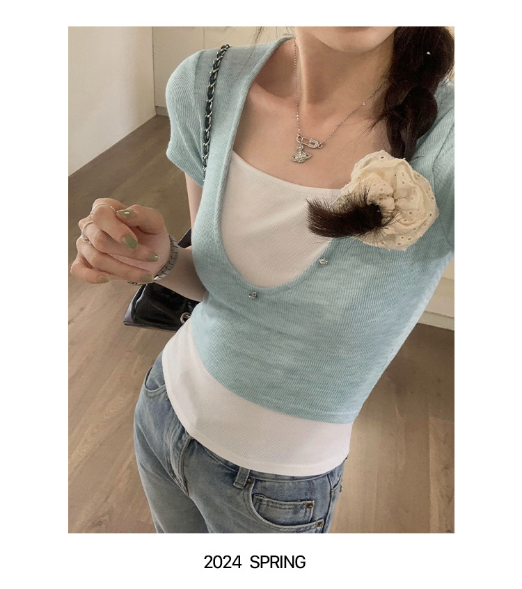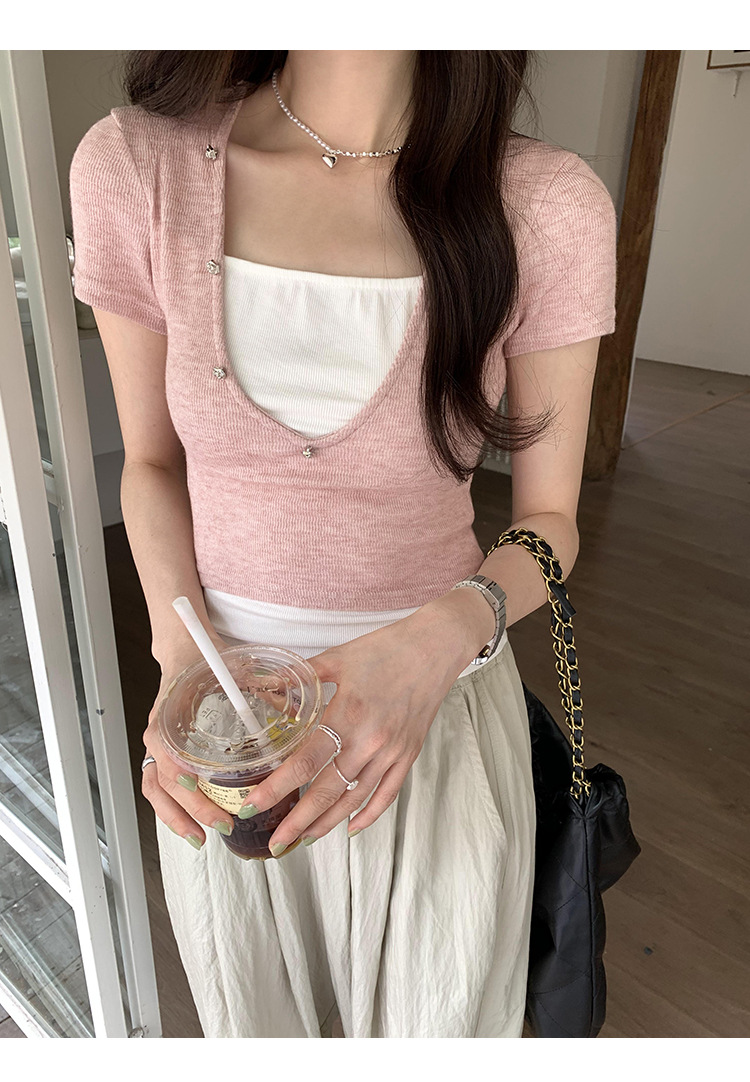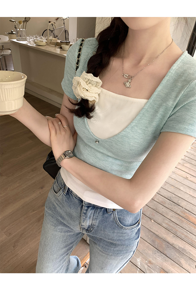 디자인 센스 페이크 두 개의 아름다운 반팔 티셔츠 여성의 2024 여름 새로운 슬림 핏 슬리밍 웨스턴 스타일 올 매치 탑
