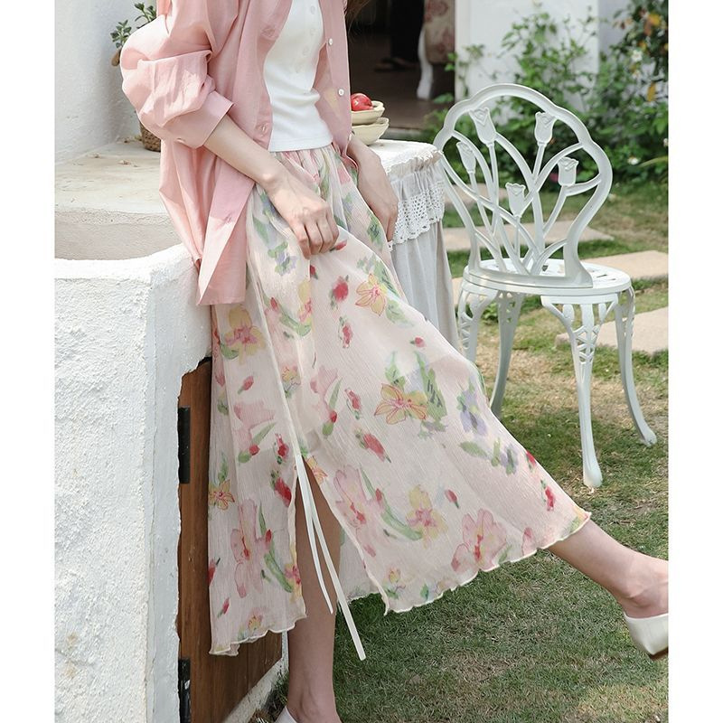 우아한 숙녀 Ruffled 꽃 치마 여자 2024 여름 새로운 육체 덮음 분할 레이스 업 긴 원피스스토어 가기