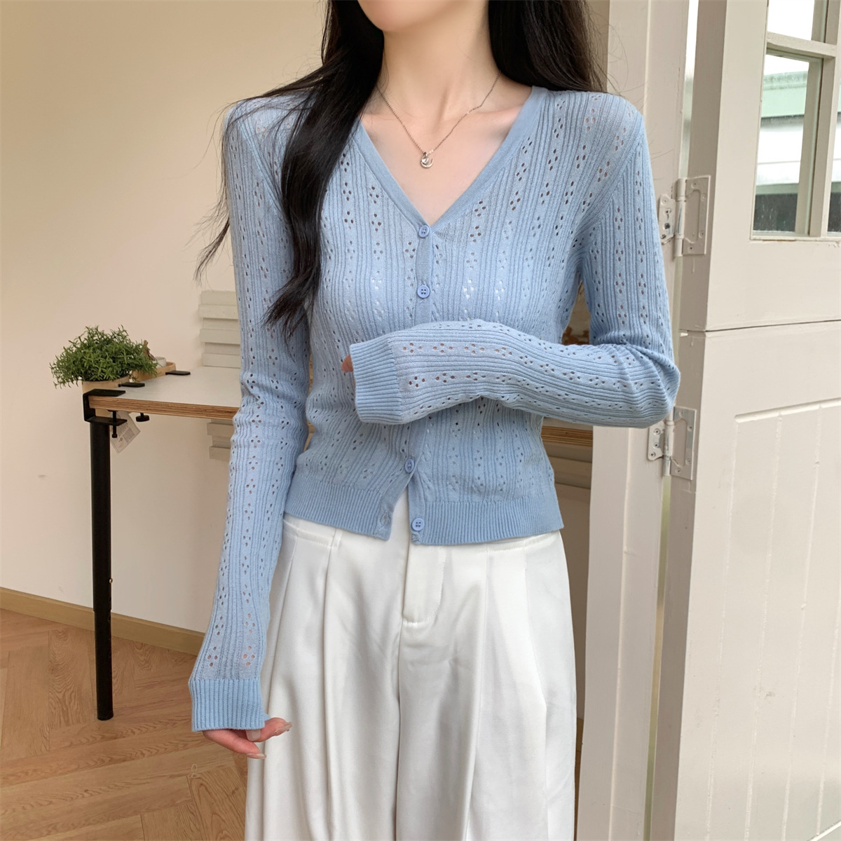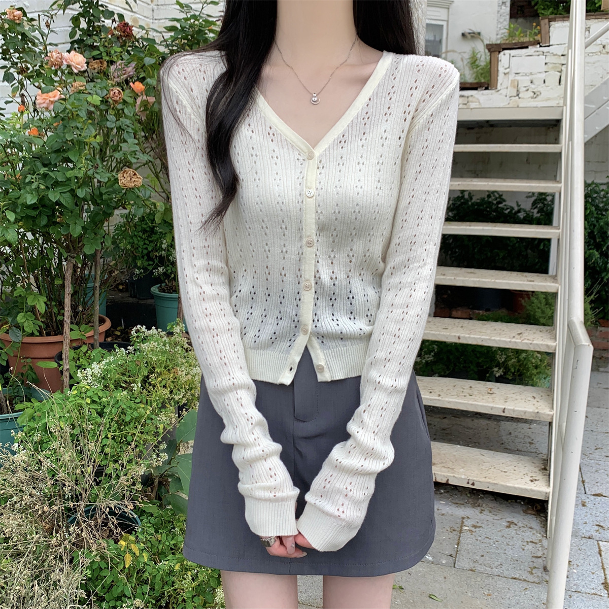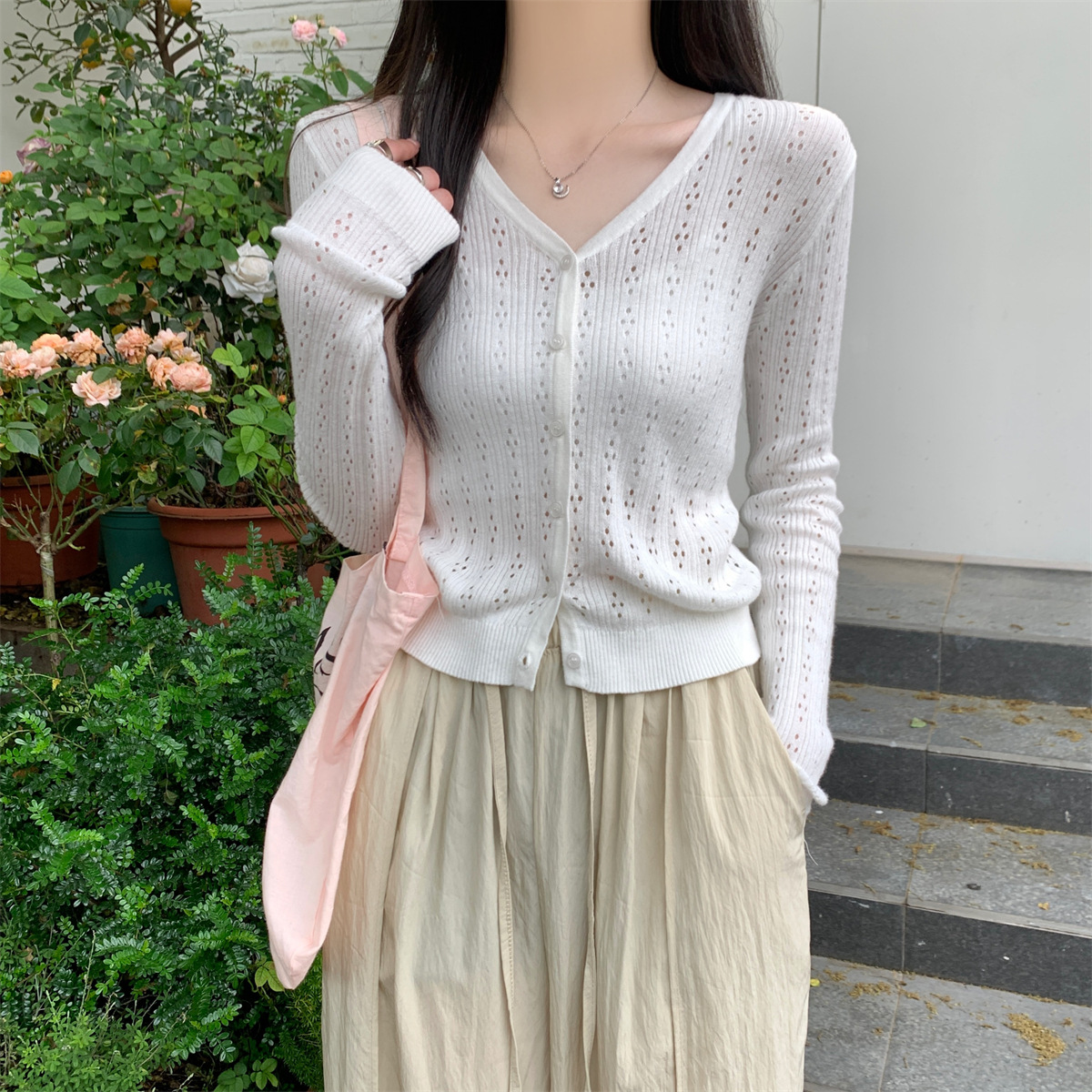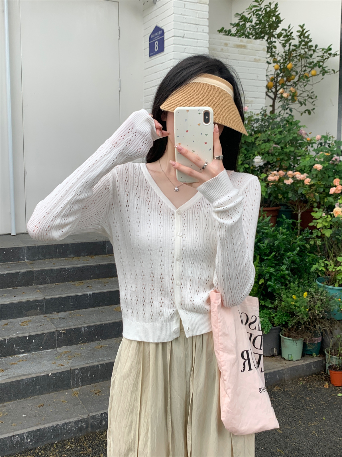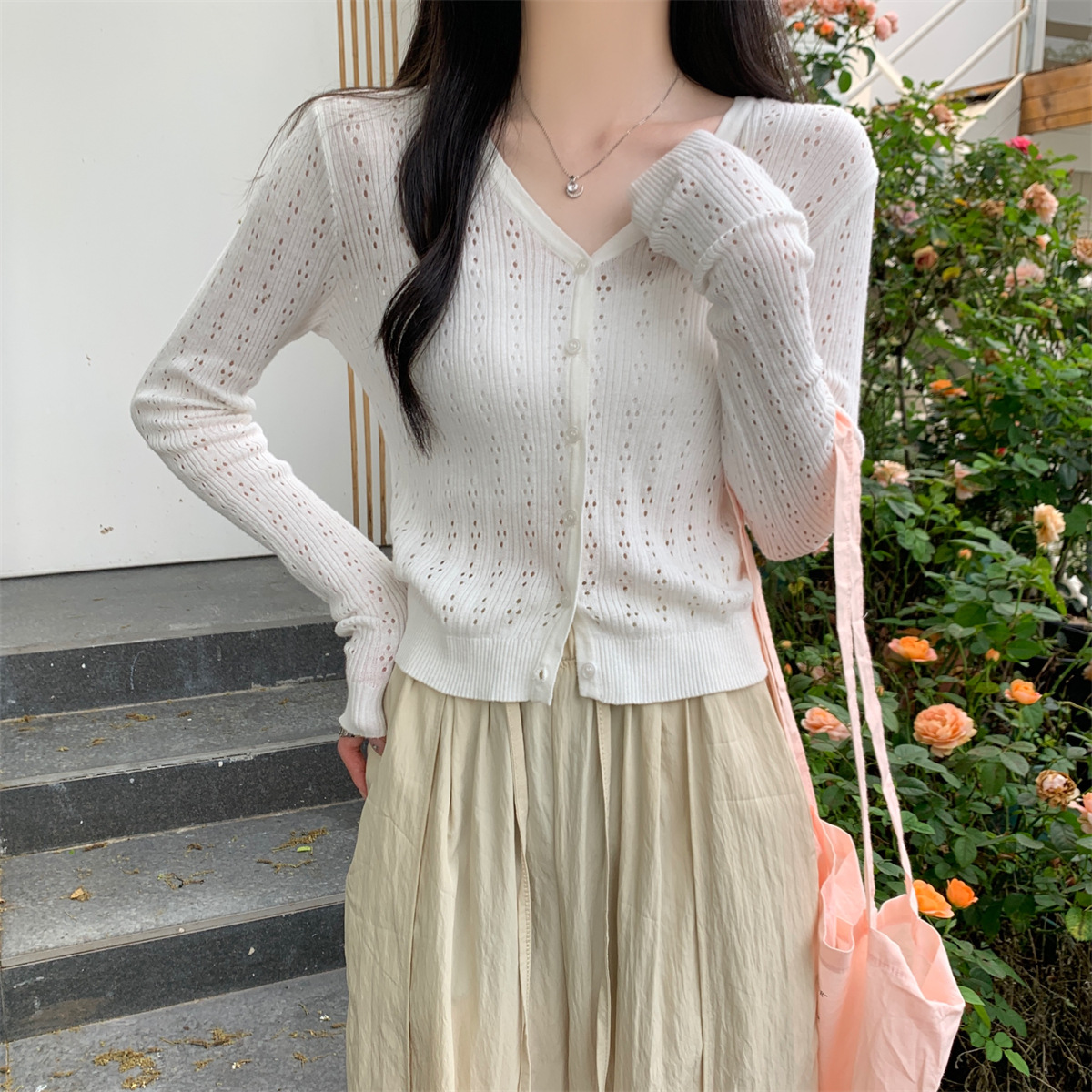 한국 스타일 우아한 V 넥 싱글 브레스트 할로우 아웃 썬 스크린 스웨터 여성 2024 여름 슬림 핏 아우터 카디건 탑