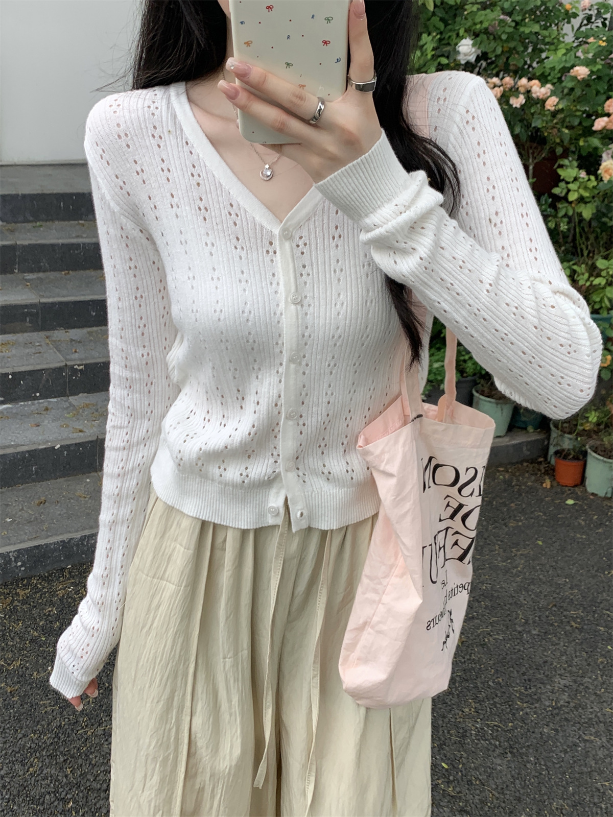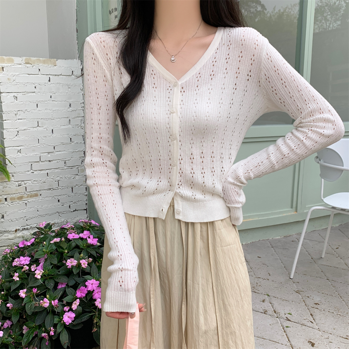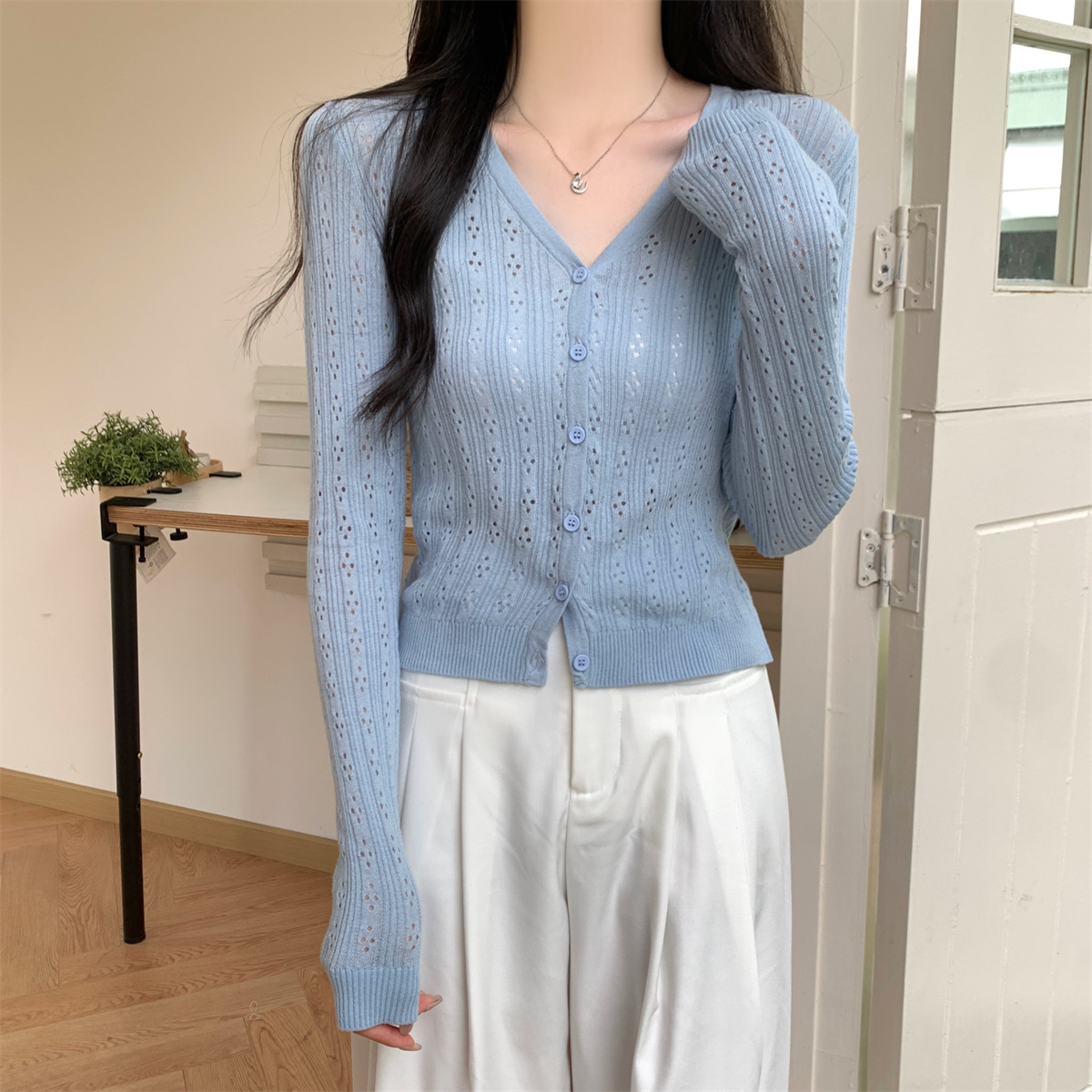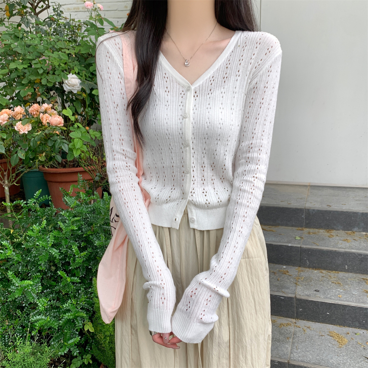 한국 스타일 우아한 V 넥 싱글 브레스트 할로우 아웃 썬 스크린 스웨터 여성 2024 여름 슬림 핏 아우터 카디건 탑