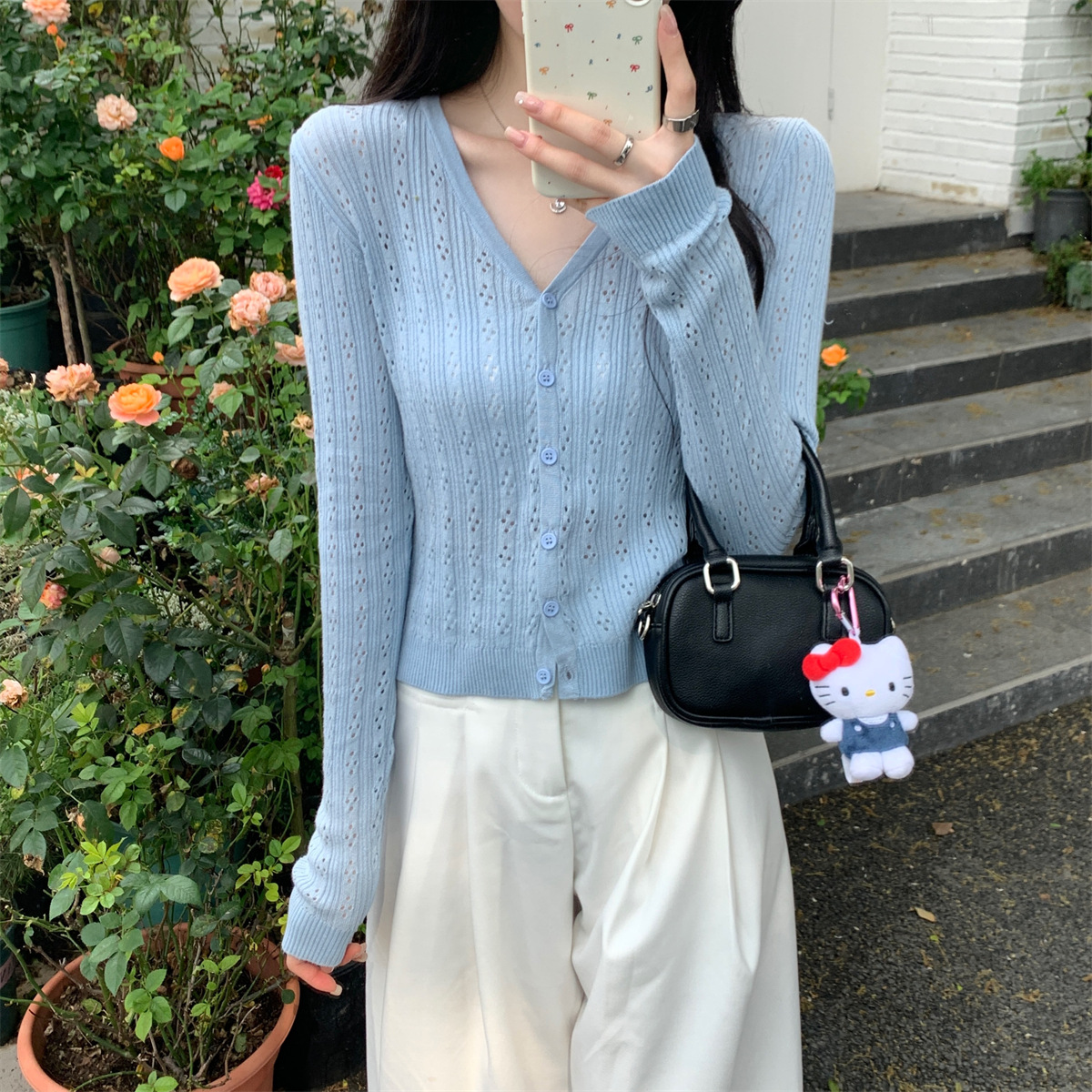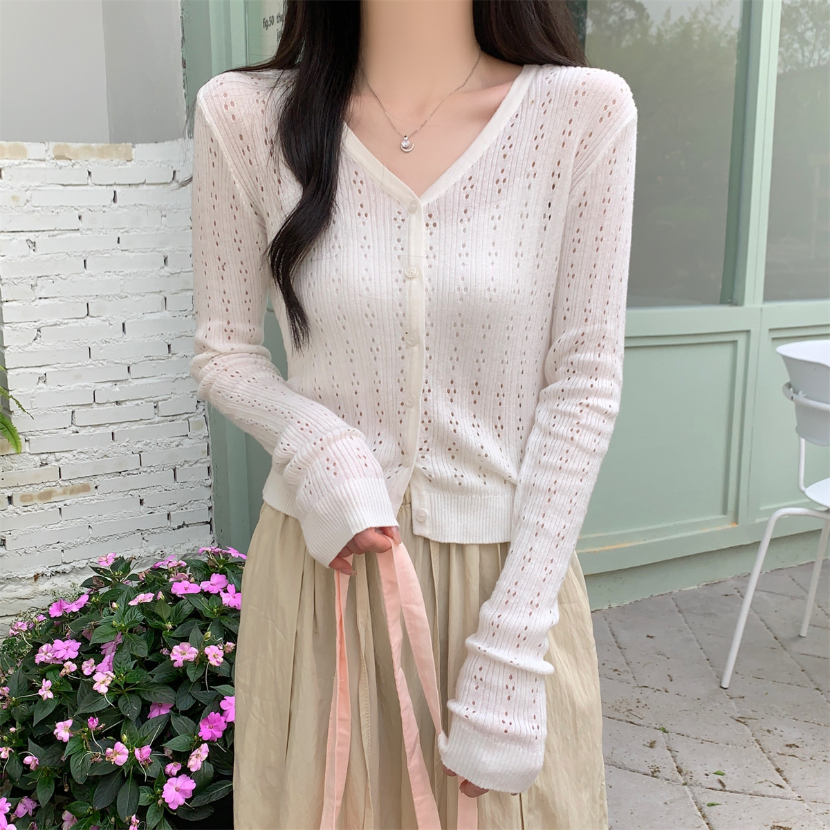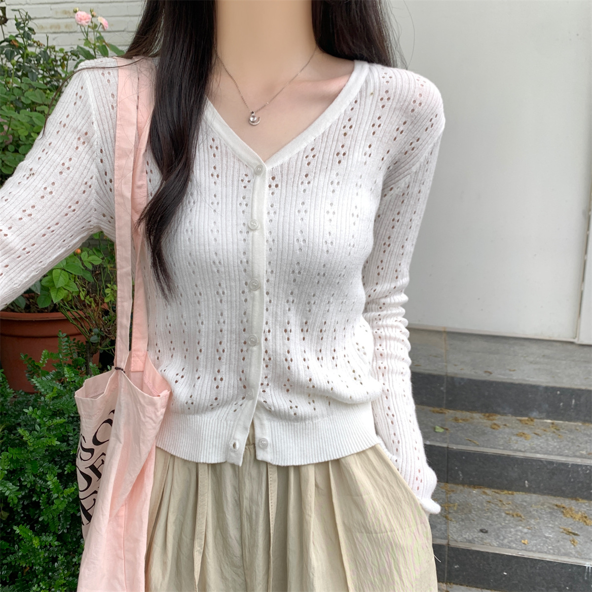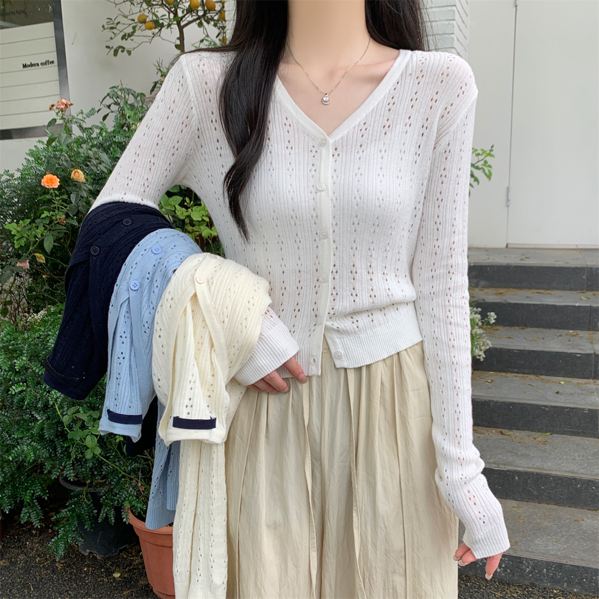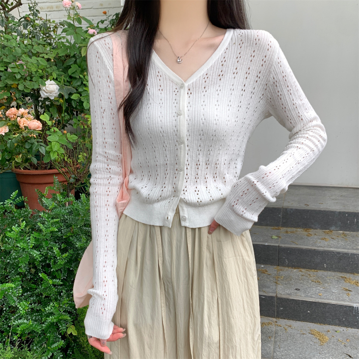 한국 스타일 우아한 V 넥 싱글 브레스트 할로우 아웃 썬 스크린 스웨터 여성 2024 여름 슬림 핏 아우터 카디건 탑