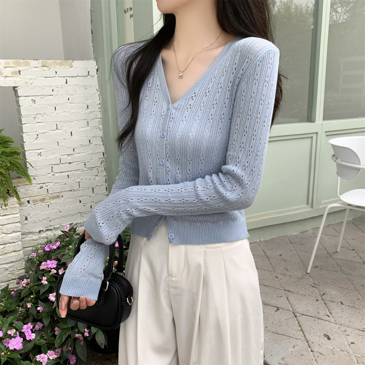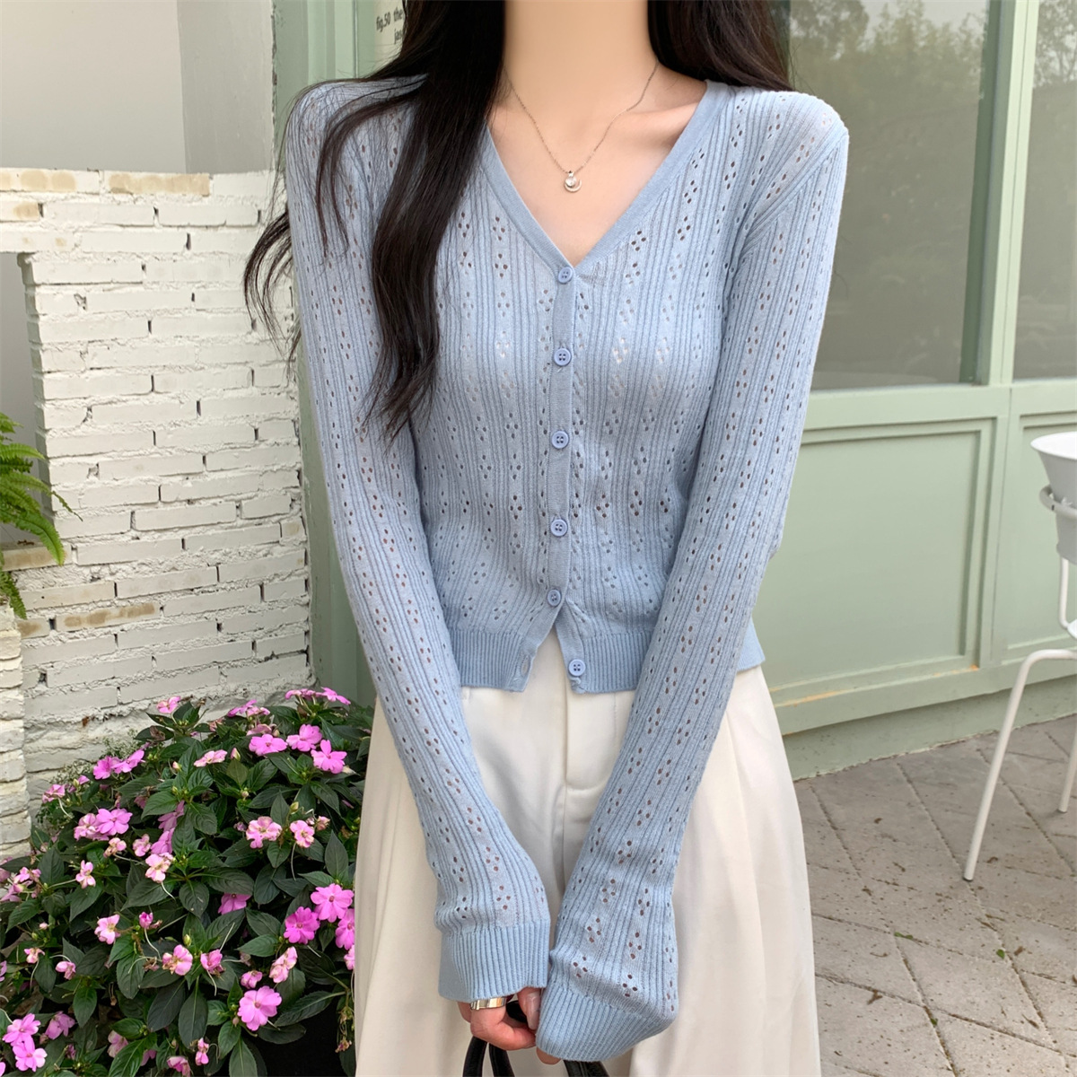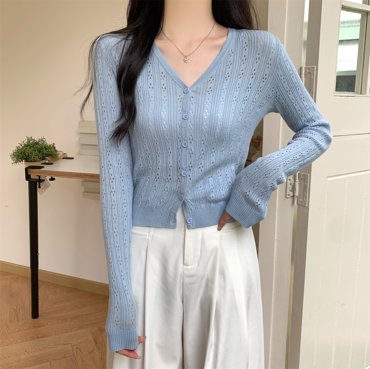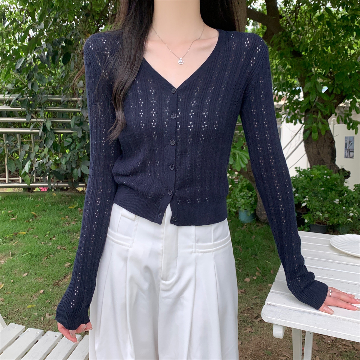한국 스타일 우아한 V 넥 싱글 브레스트 할로우 아웃 썬 스크린 스웨터 여성 2024 여름 슬림 핏 아우터 카디건 탑