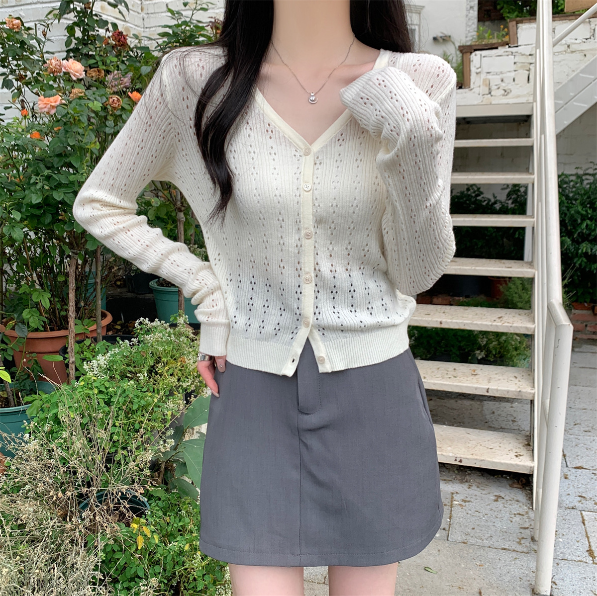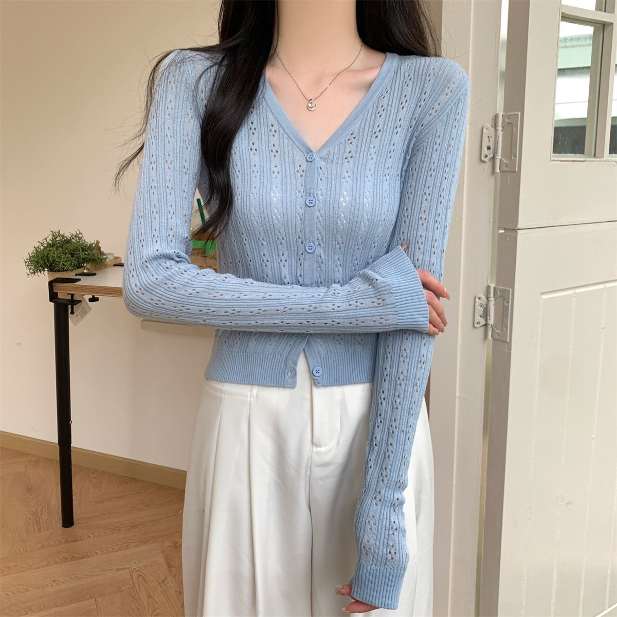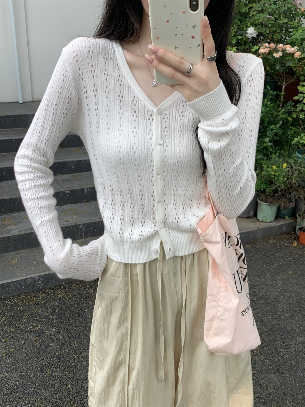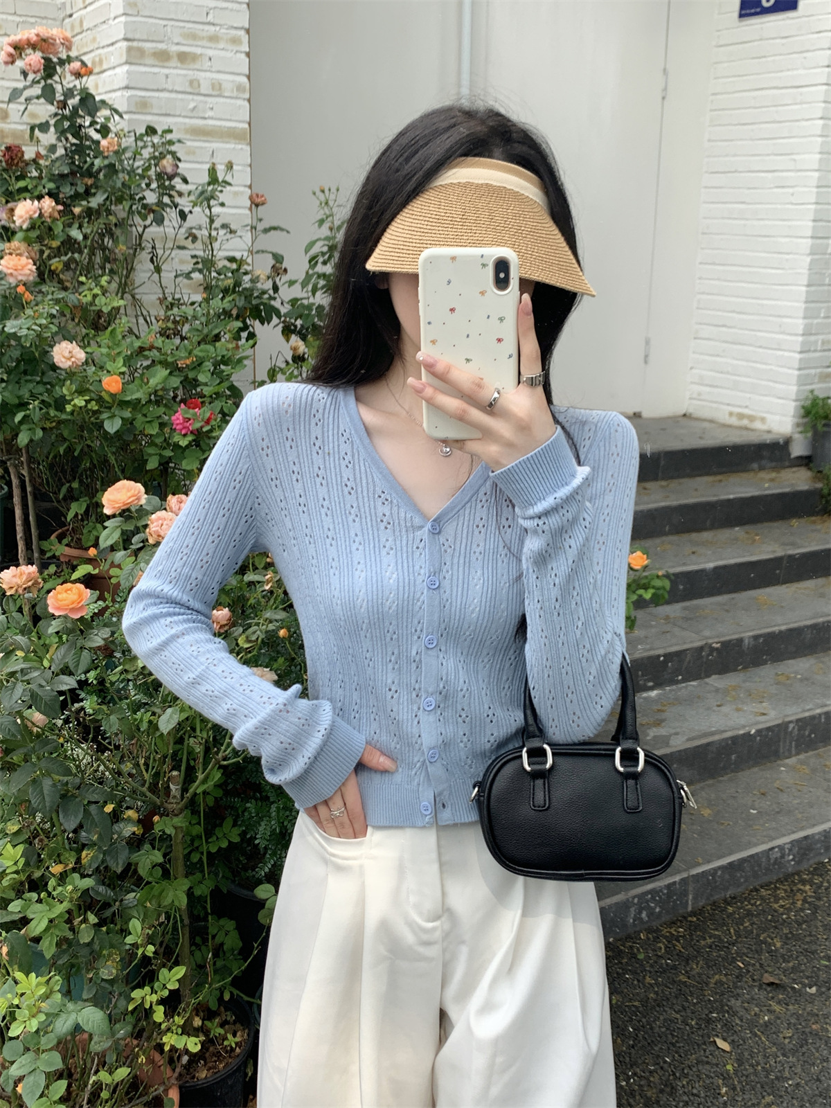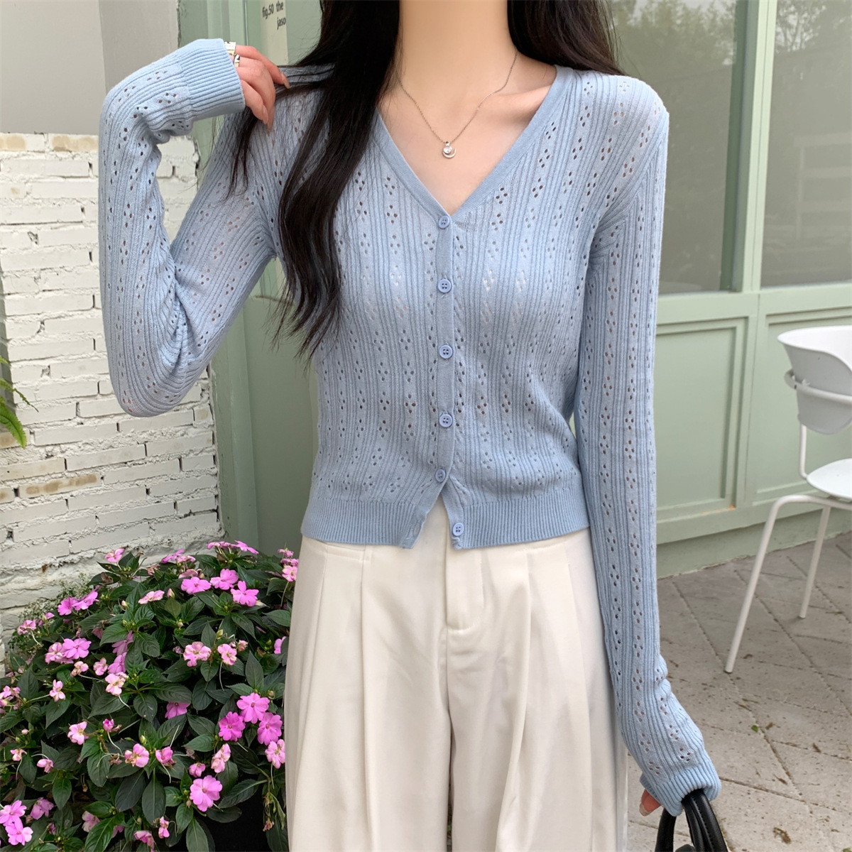 한국 스타일 우아한 V 넥 싱글 브레스트 할로우 아웃 썬 스크린 스웨터 여성 2024 여름 슬림 핏 아우터 카디건 탑