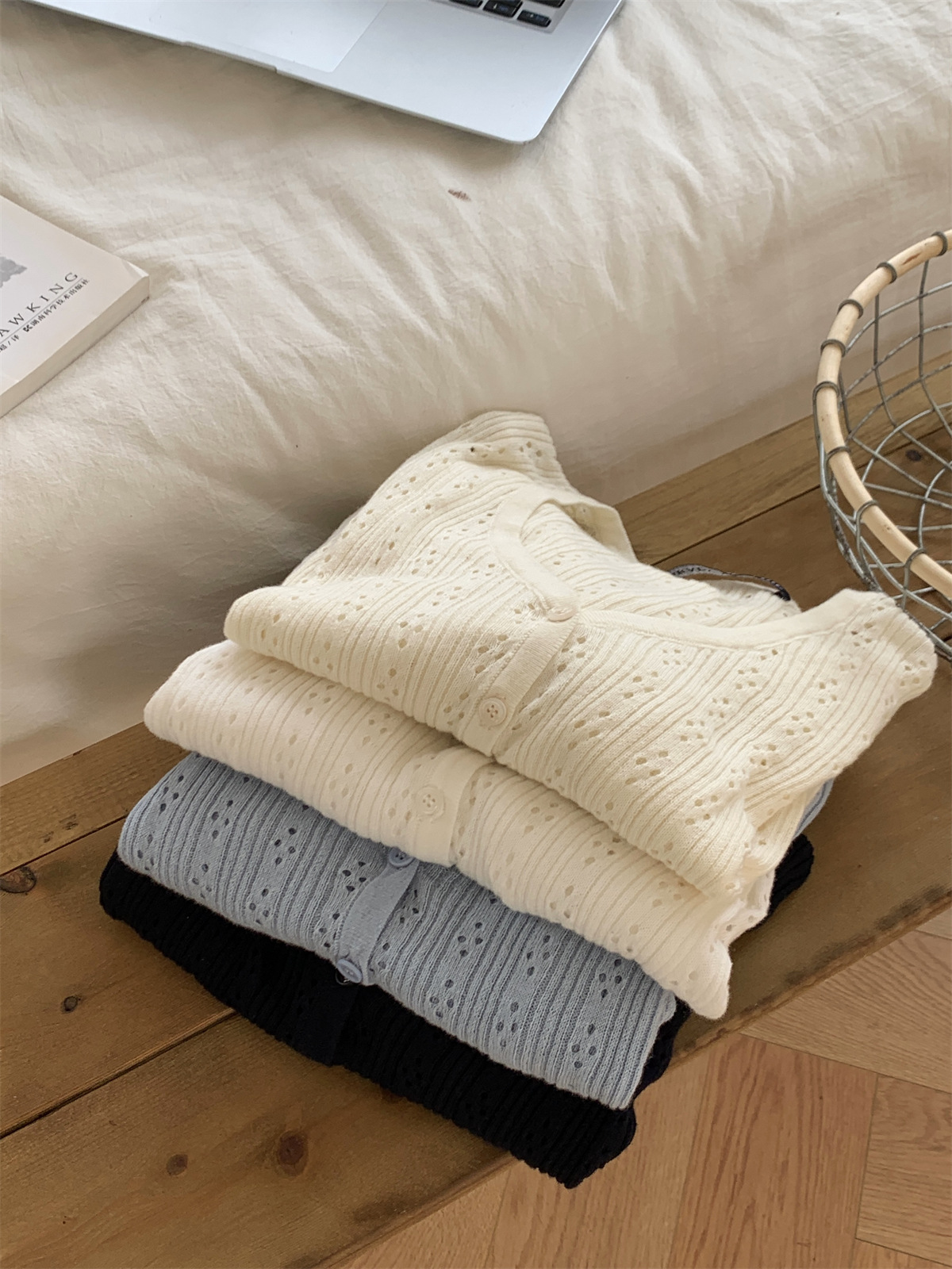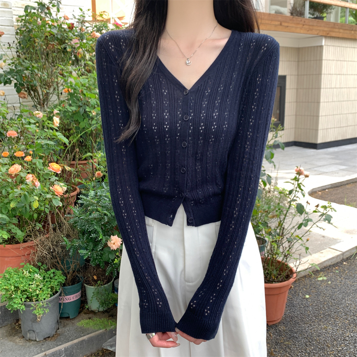 한국 스타일 우아한 V 넥 싱글 브레스트 할로우 아웃 썬 스크린 스웨터 여성 2024 여름 슬림 핏 아우터 카디건 탑스토어 가기