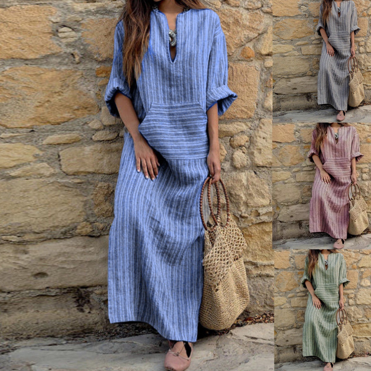 대량의 현물 국경 간 독립 스테이션 대외 무역 여성 의류 유럽과 미국의 면 및 린넨 원사 염색 줄무늬 느슨한 포켓 드레스스토어 가기