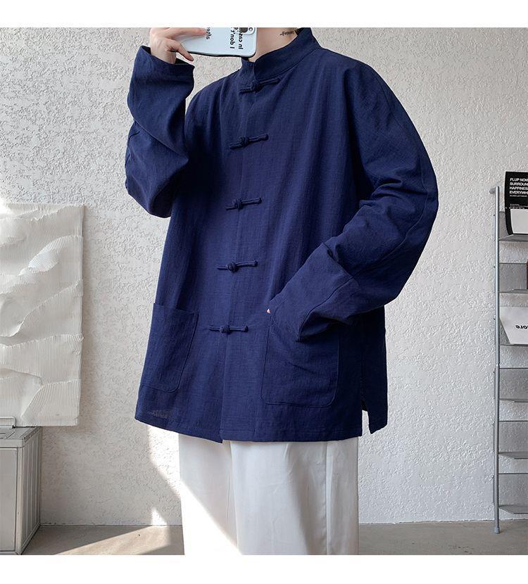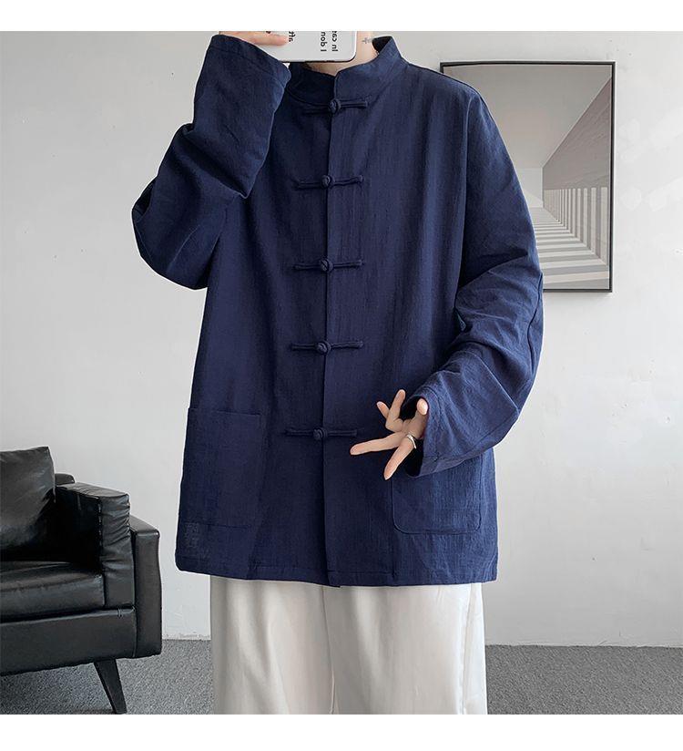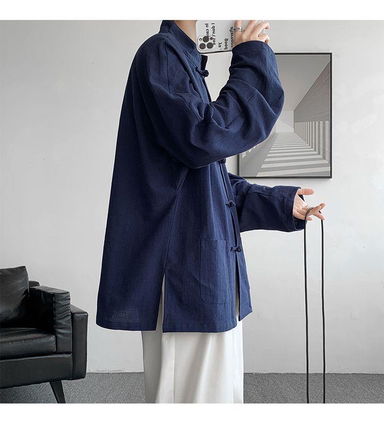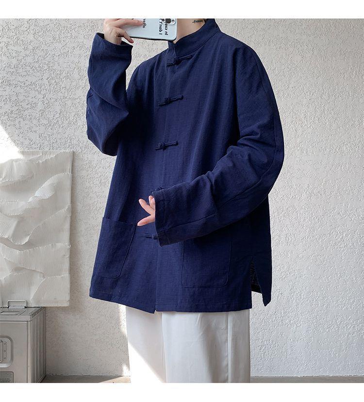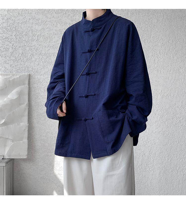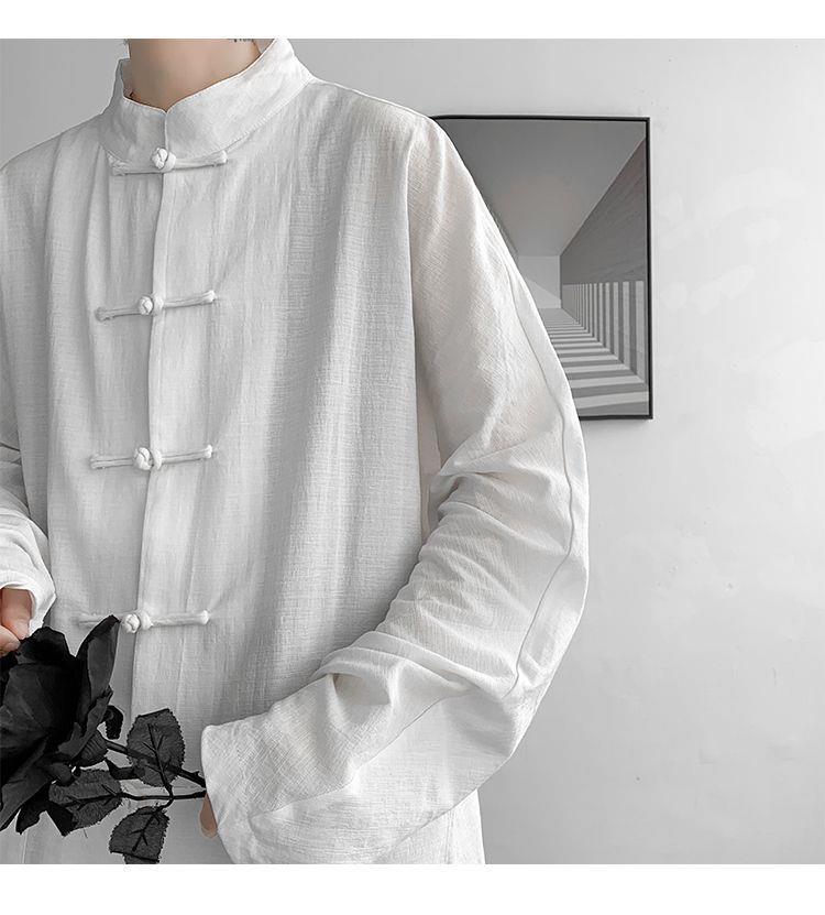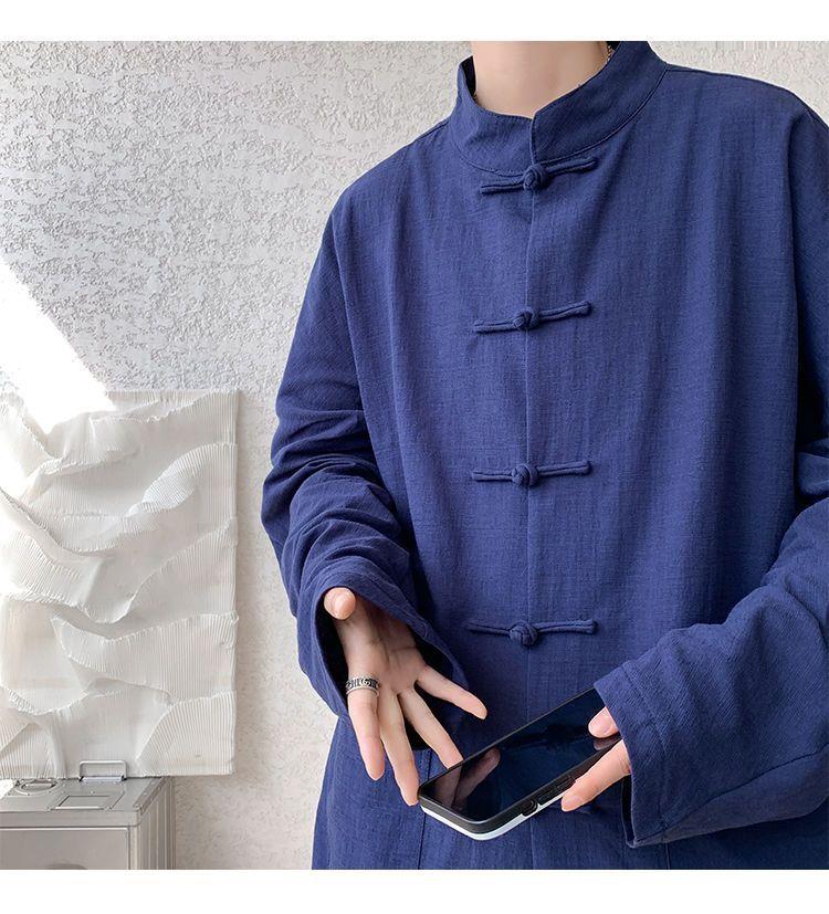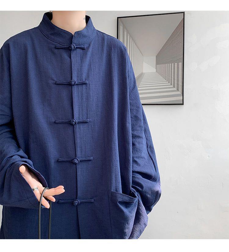 리넨 컬러 버클 플랩 버클 셔츠 남자의 느슨한 플러스 사이즈 리넨 다오 로브 재킷 코튼 리넨 탕 세트 한푸 탑스토어 가기