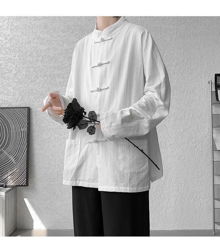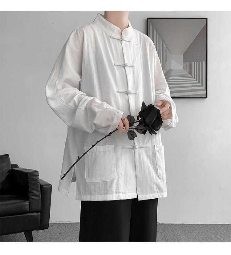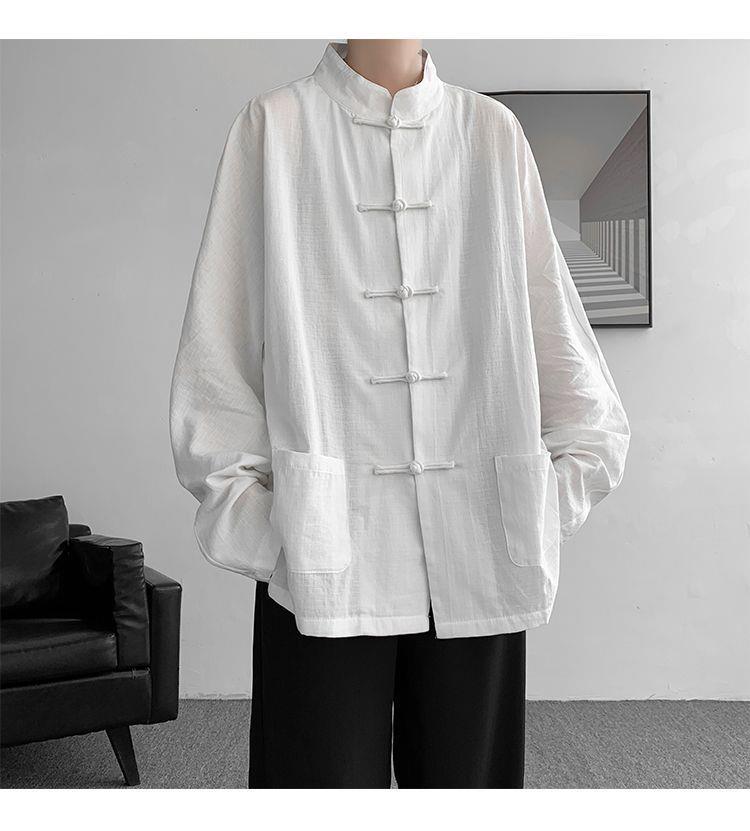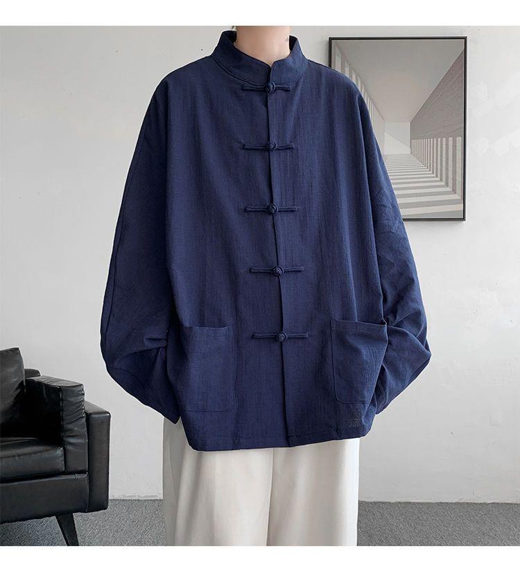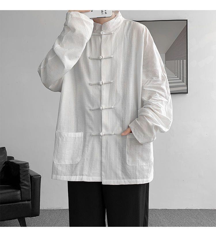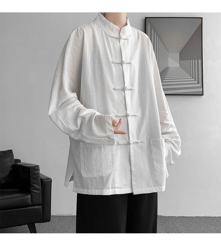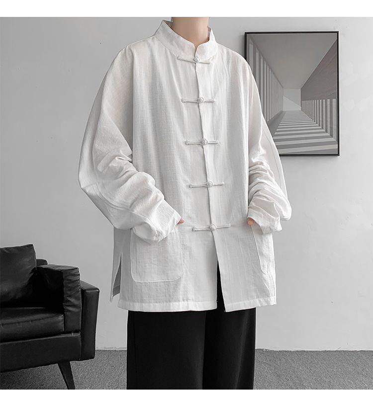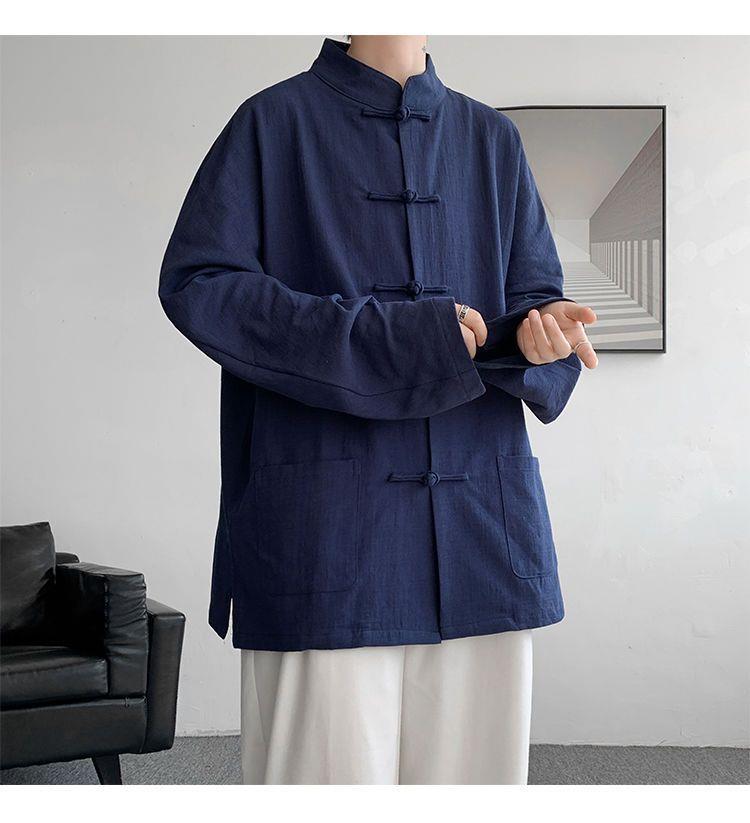 리넨 컬러 버클 플랩 버클 셔츠 남자의 느슨한 플러스 사이즈 리넨 다오 로브 재킷 코튼 리넨 탕 세트 한푸 탑스토어 가기