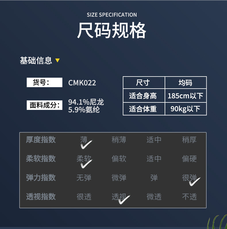 材质:网眼(94.1%尼龙+5.9%氨纶)