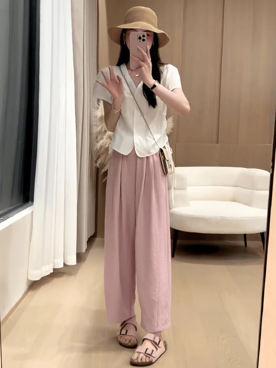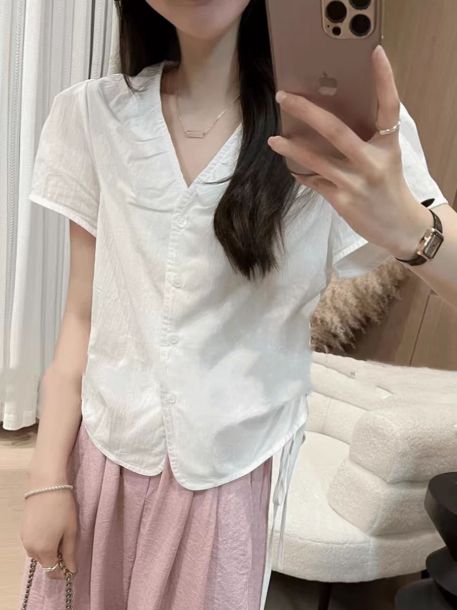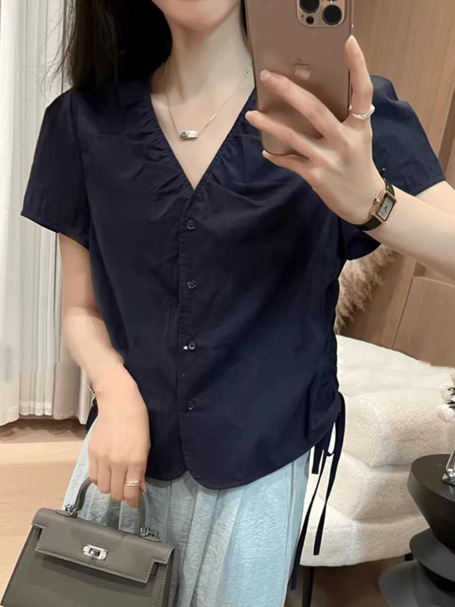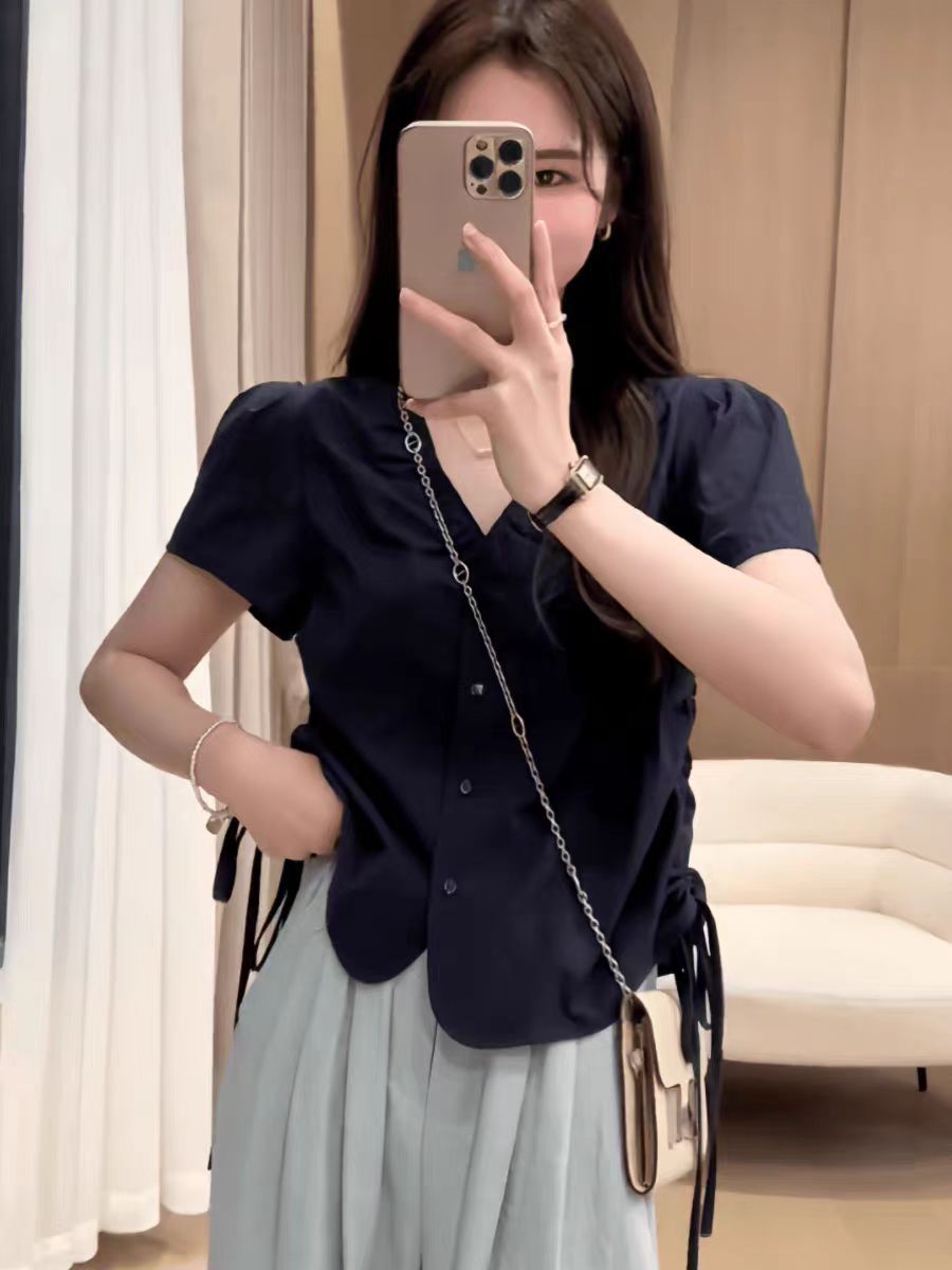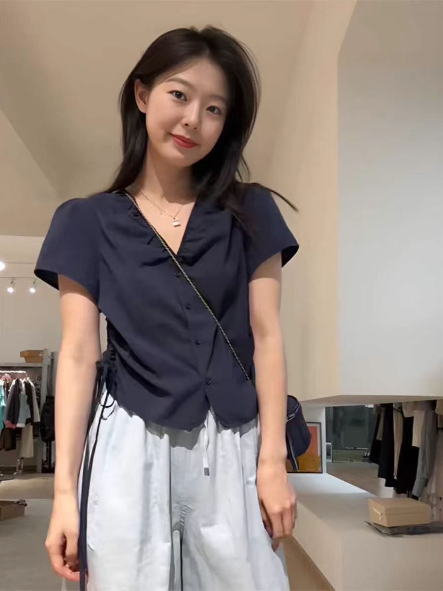 한국 스타일 단색 V 넥 반팔 셔츠 여성의 여름 새로운 패션 디자인 센스 드로우 스트링 주름 짧은 셔츠 탑스토어 가기