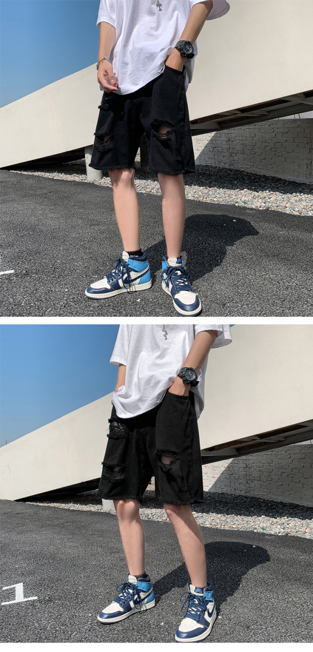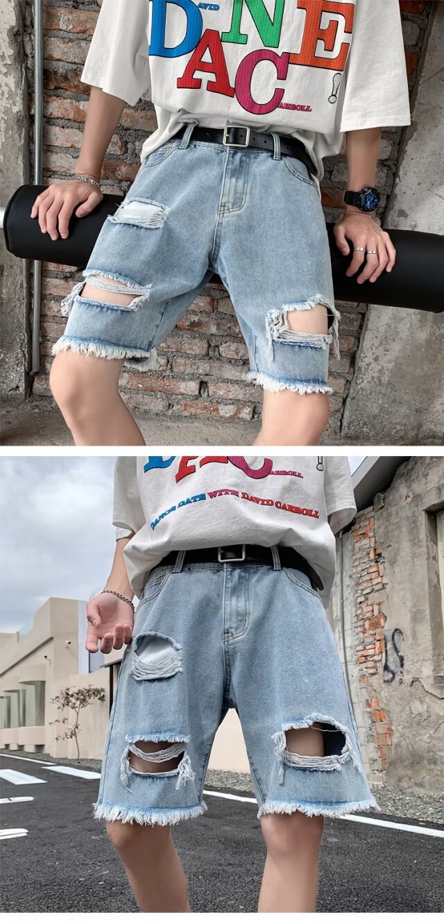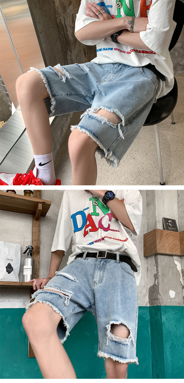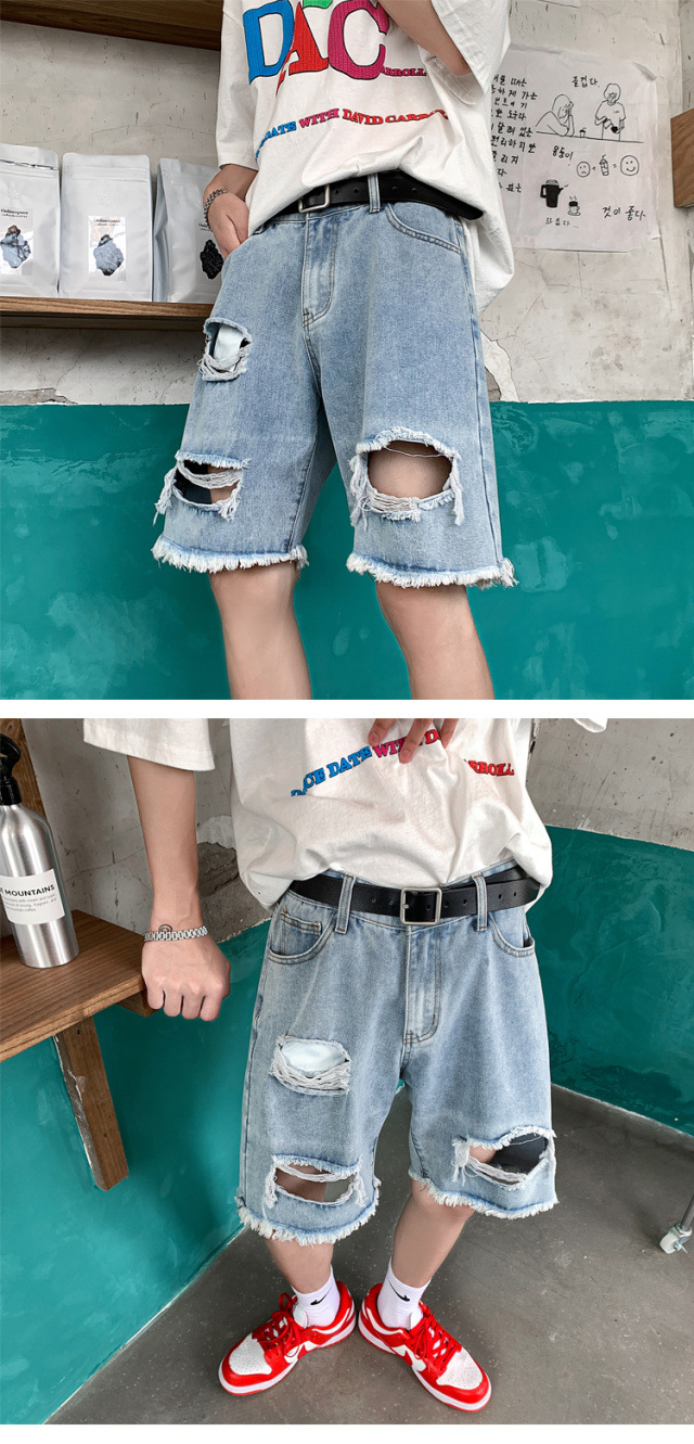 찢어진 데님 반바지 남자 여름 얇은 미국 스타일 하이 스트리트 트렌디 브랜드 아우터 스트레이트 레그 바지스토어 가기