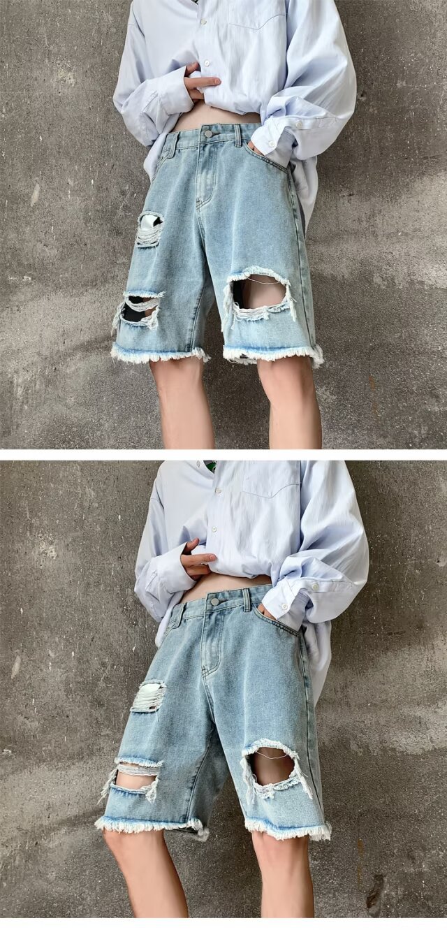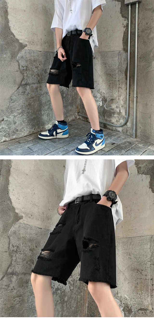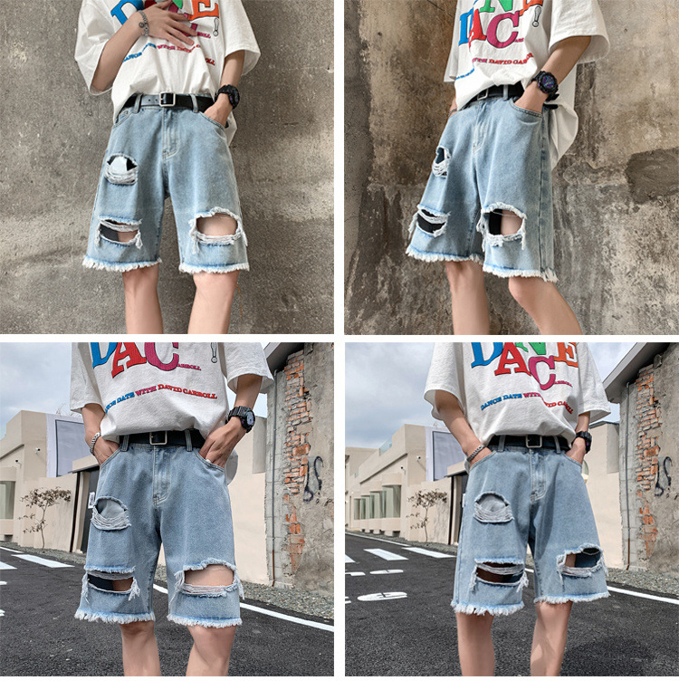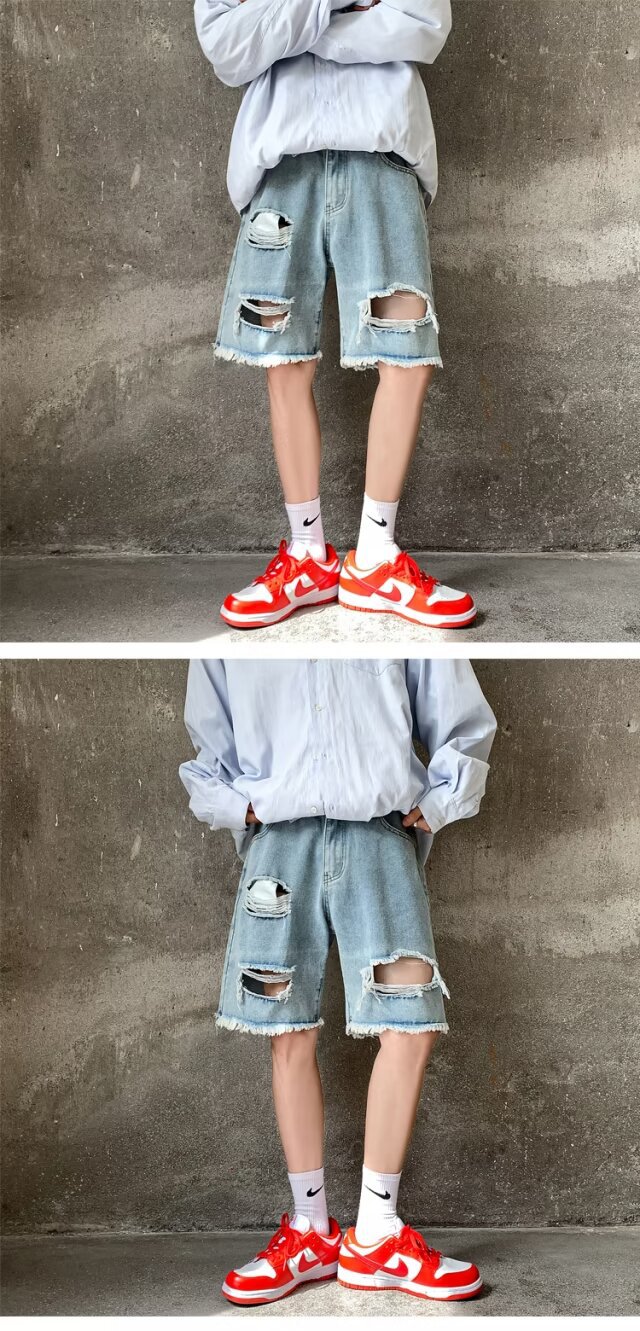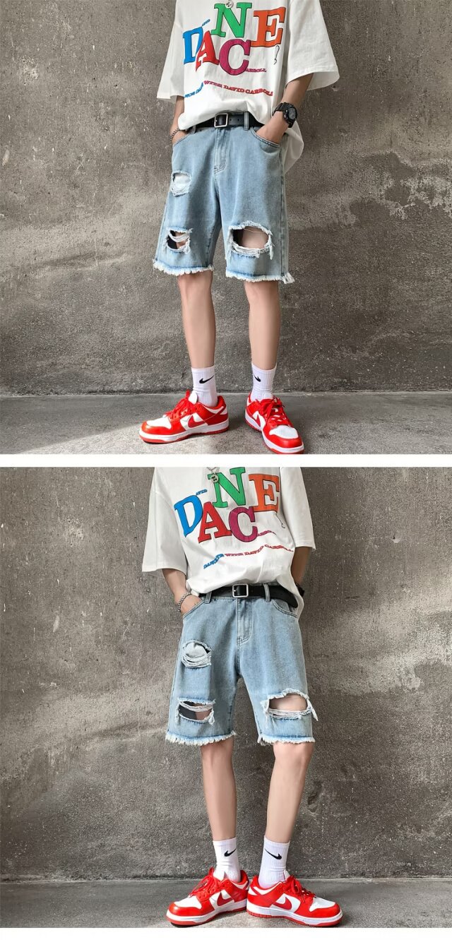 찢어진 데님 반바지 남자 여름 얇은 미국 스타일 하이 스트리트 트렌디 브랜드 아우터 스트레이트 레그 바지스토어 가기