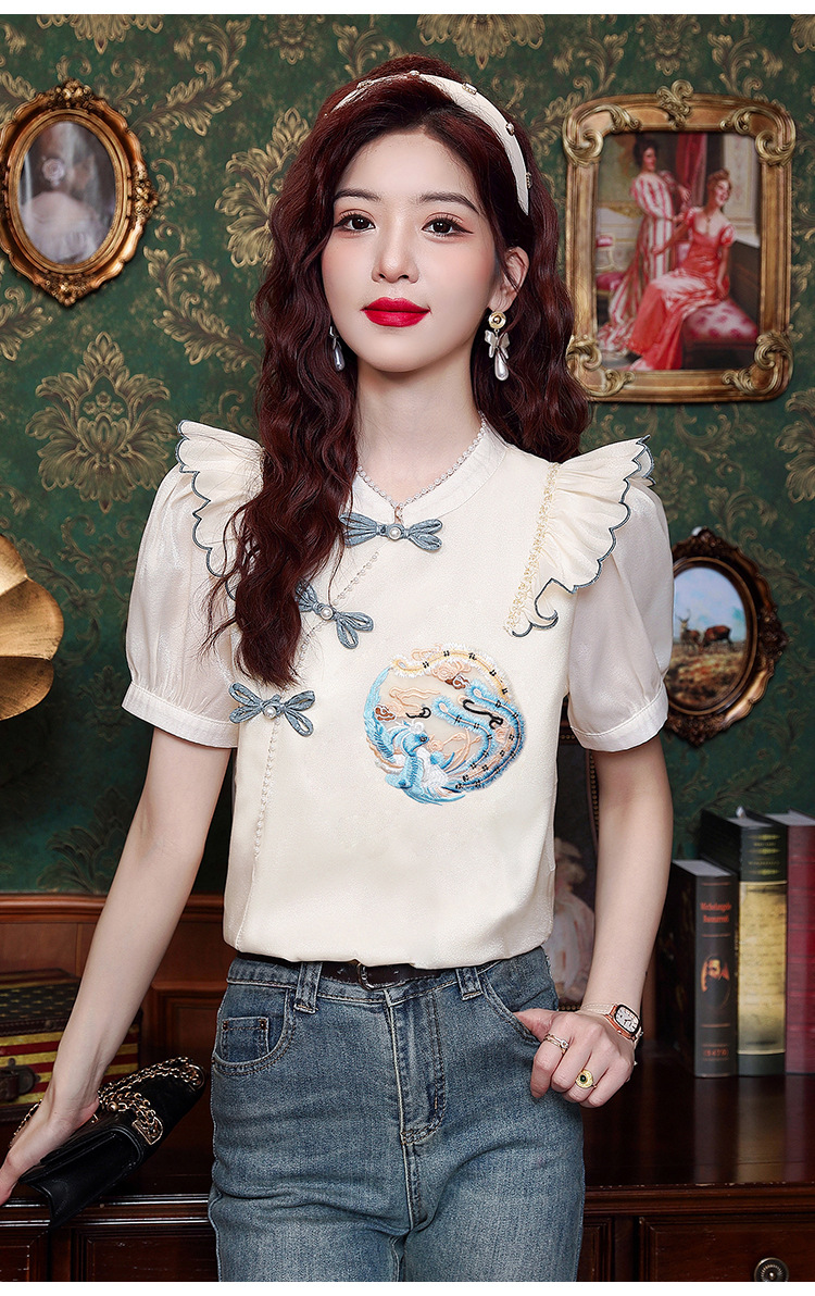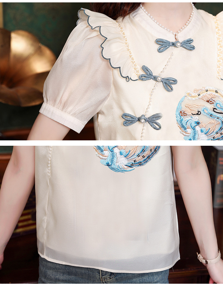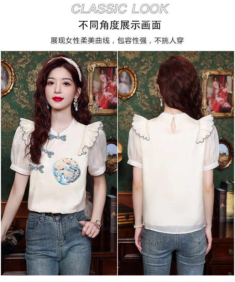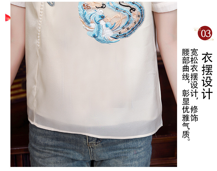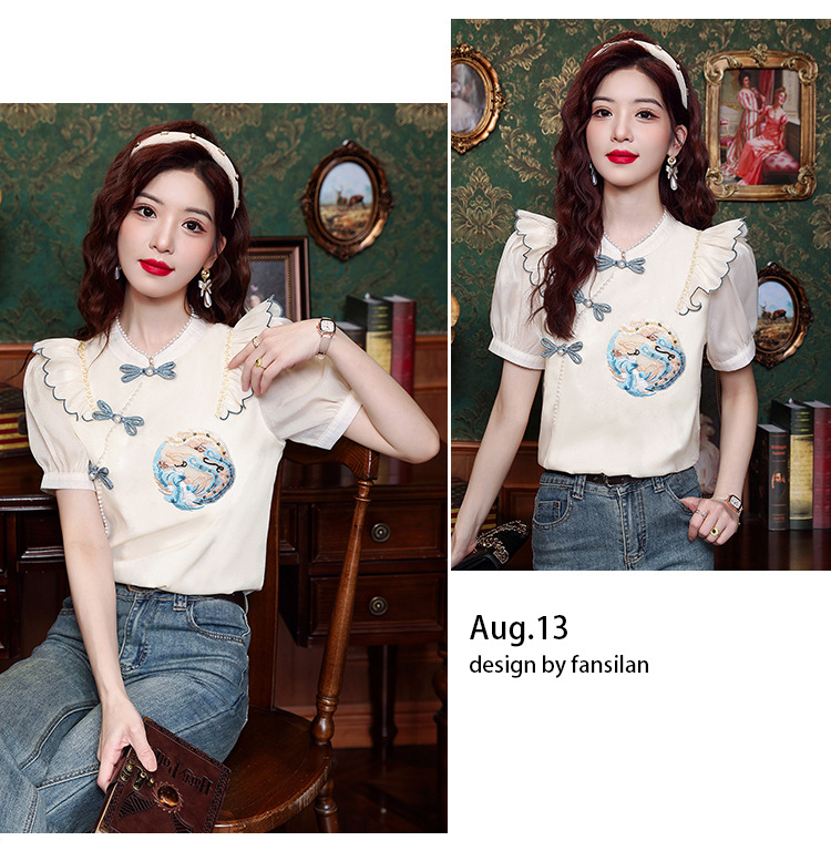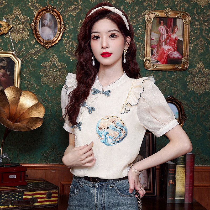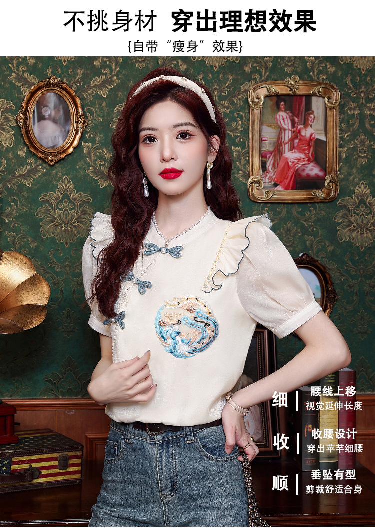 여성을위한 국가 스타일 복고풍 중공업 탑 수 놓은 반팔 셔츠 여름 새로운 패션 새로운 중국 스타일 쉬폰 셔츠