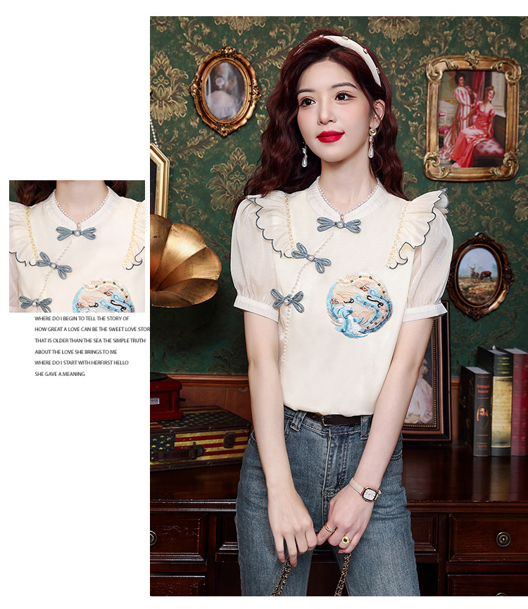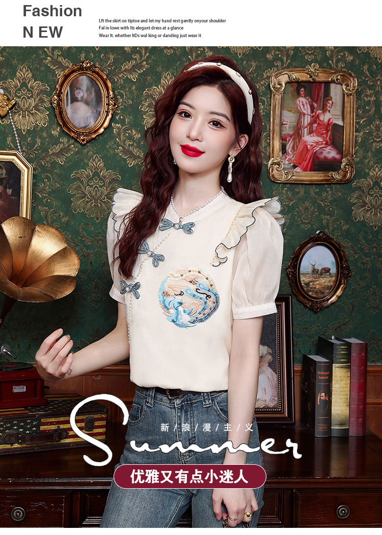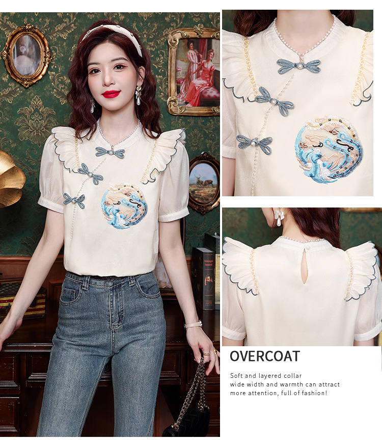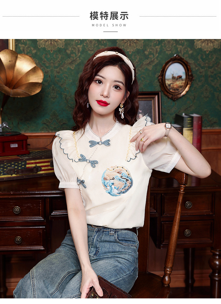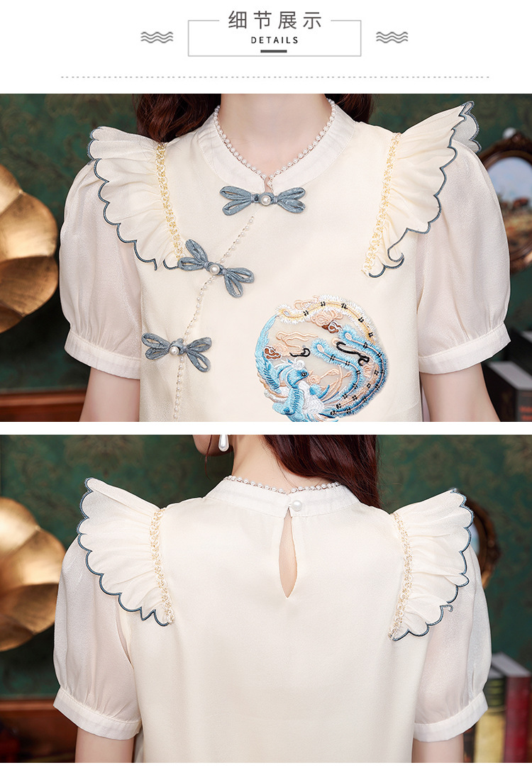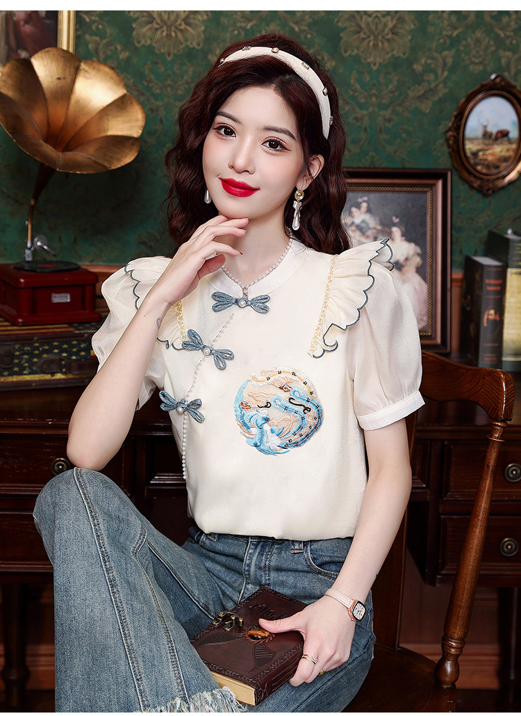 여성을위한 국가 스타일 복고풍 중공업 탑 수 놓은 반팔 셔츠 여름 새로운 패션 새로운 중국 스타일 쉬폰 셔츠
