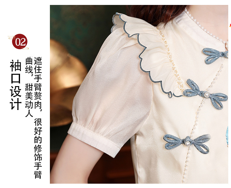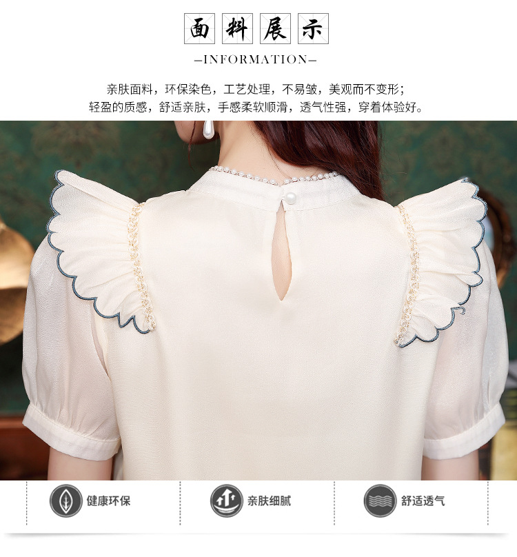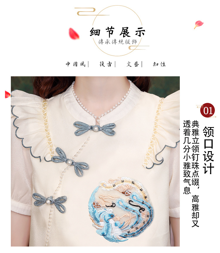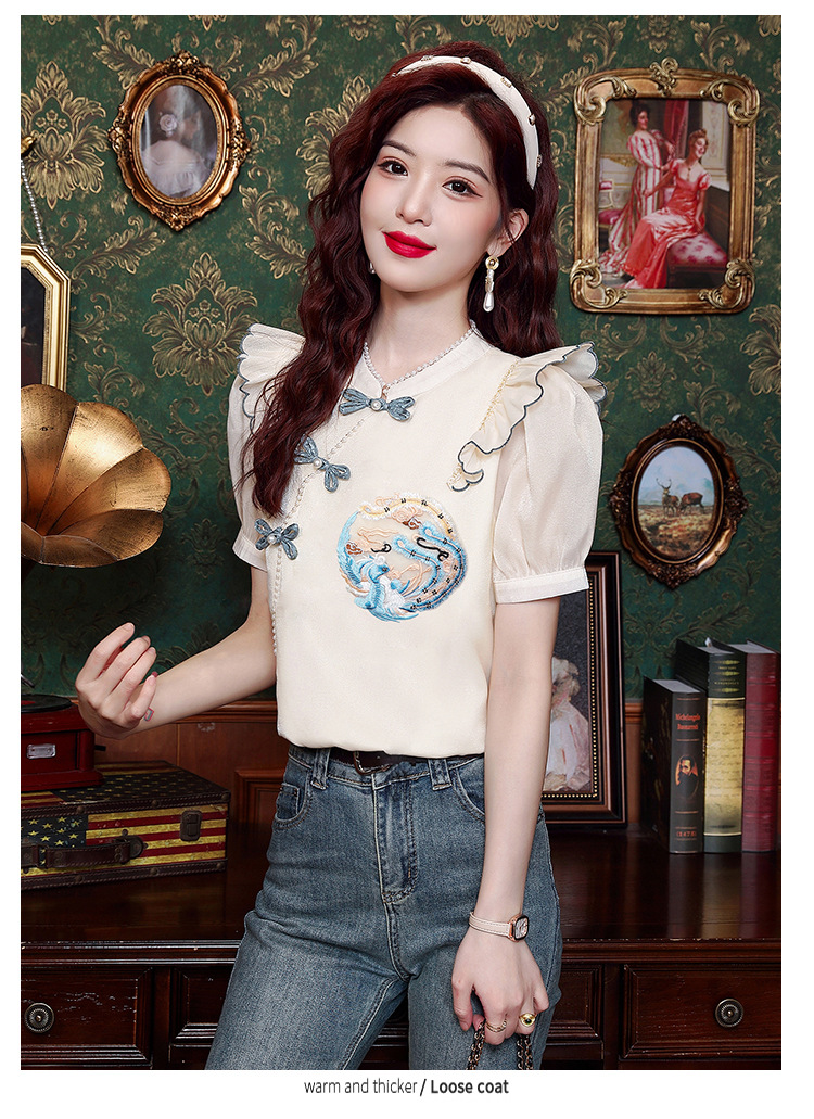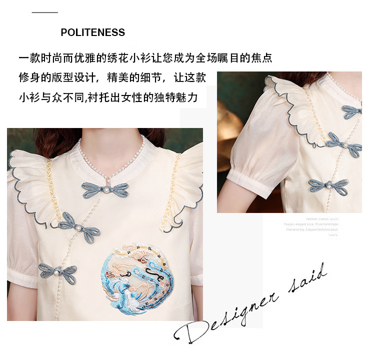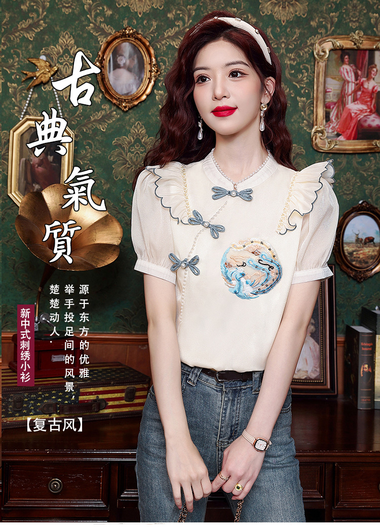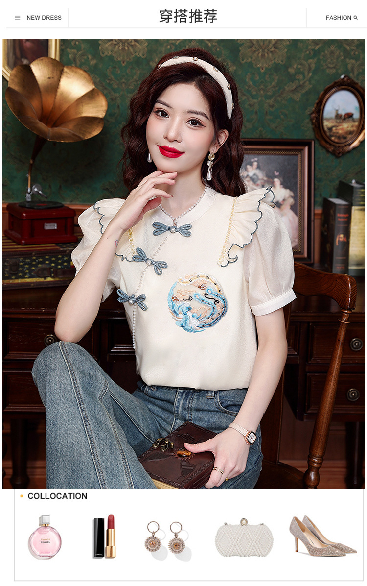 여성을위한 국가 스타일 복고풍 중공업 탑 수 놓은 반팔 셔츠 여름 새로운 패션 새로운 중국 스타일 쉬폰 셔츠