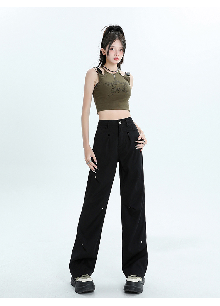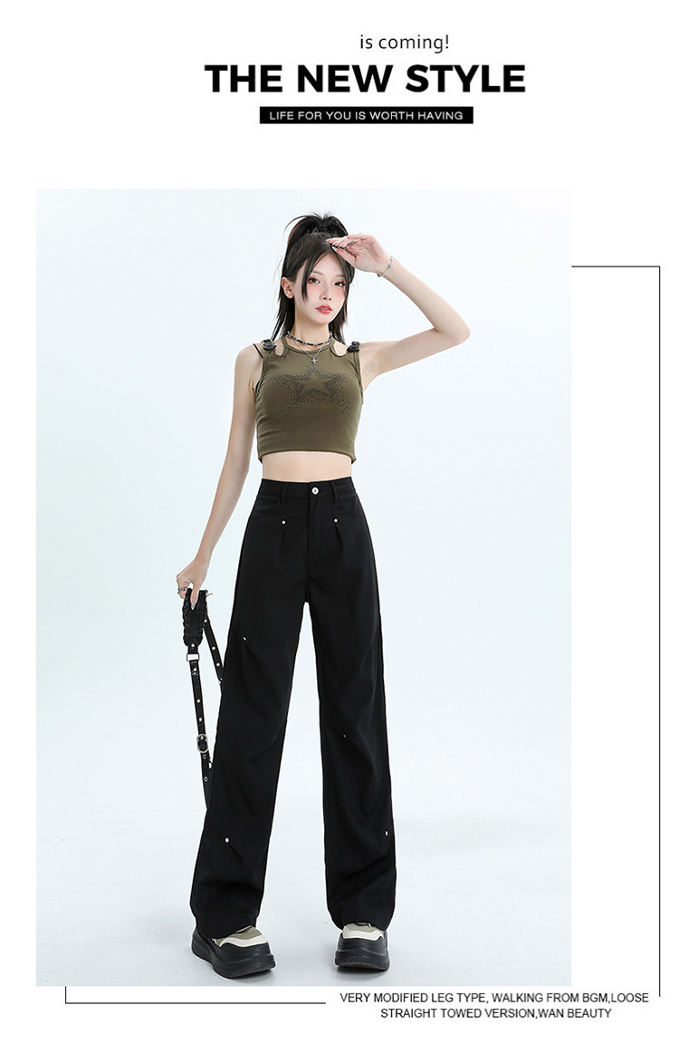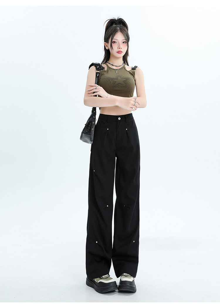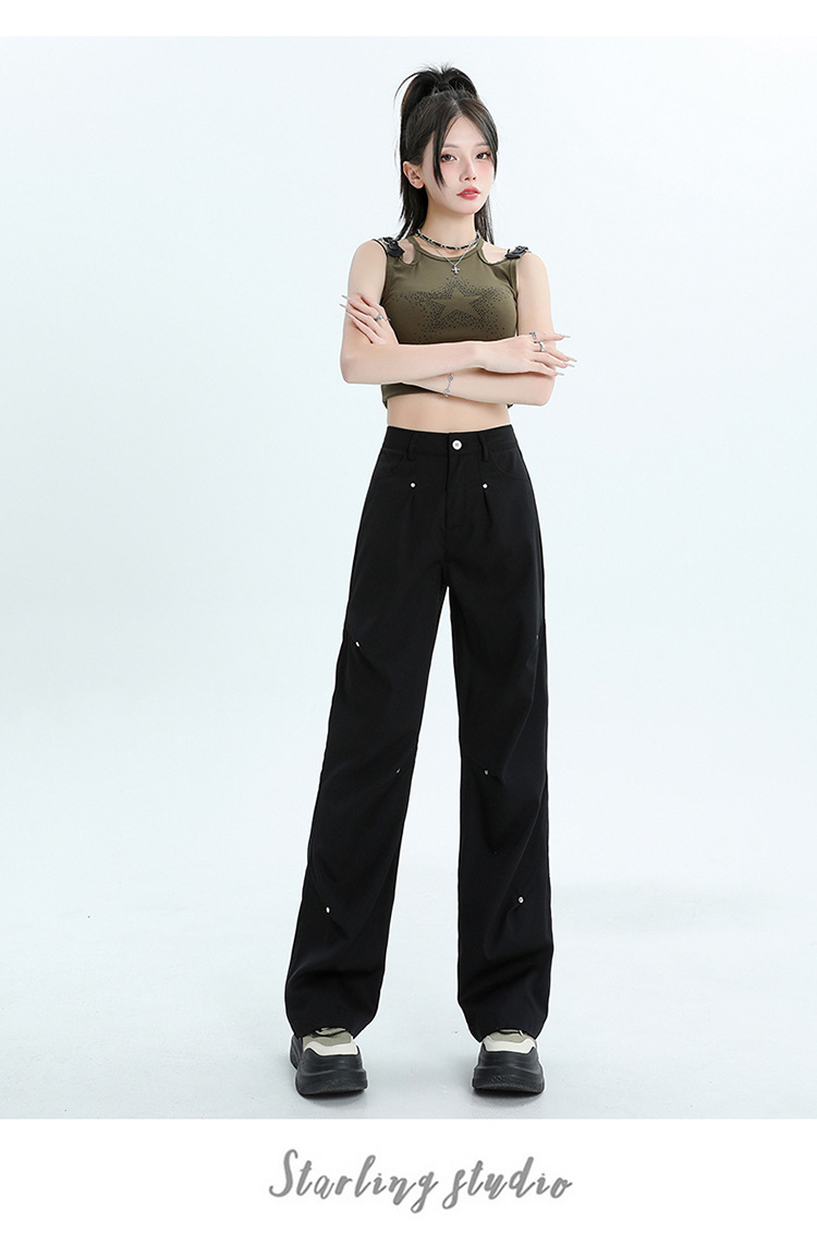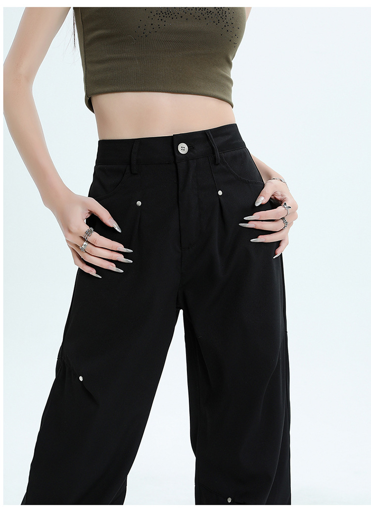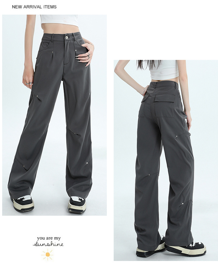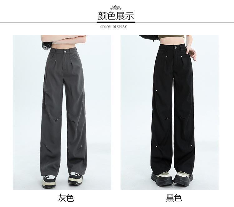 미국 스타일 높은 허리 잡힌 바지 여성용 2024 새로운 틈새 디자인 센스 리벳 레트로 캐주얼 올 매치 스트레이트 와이드 레그 바지스토어 가기