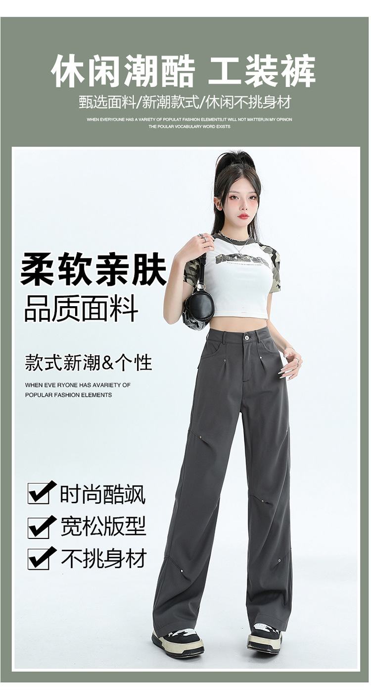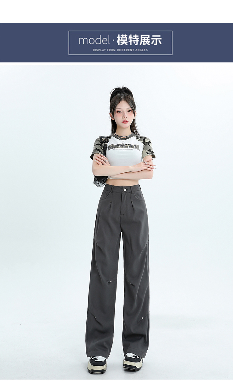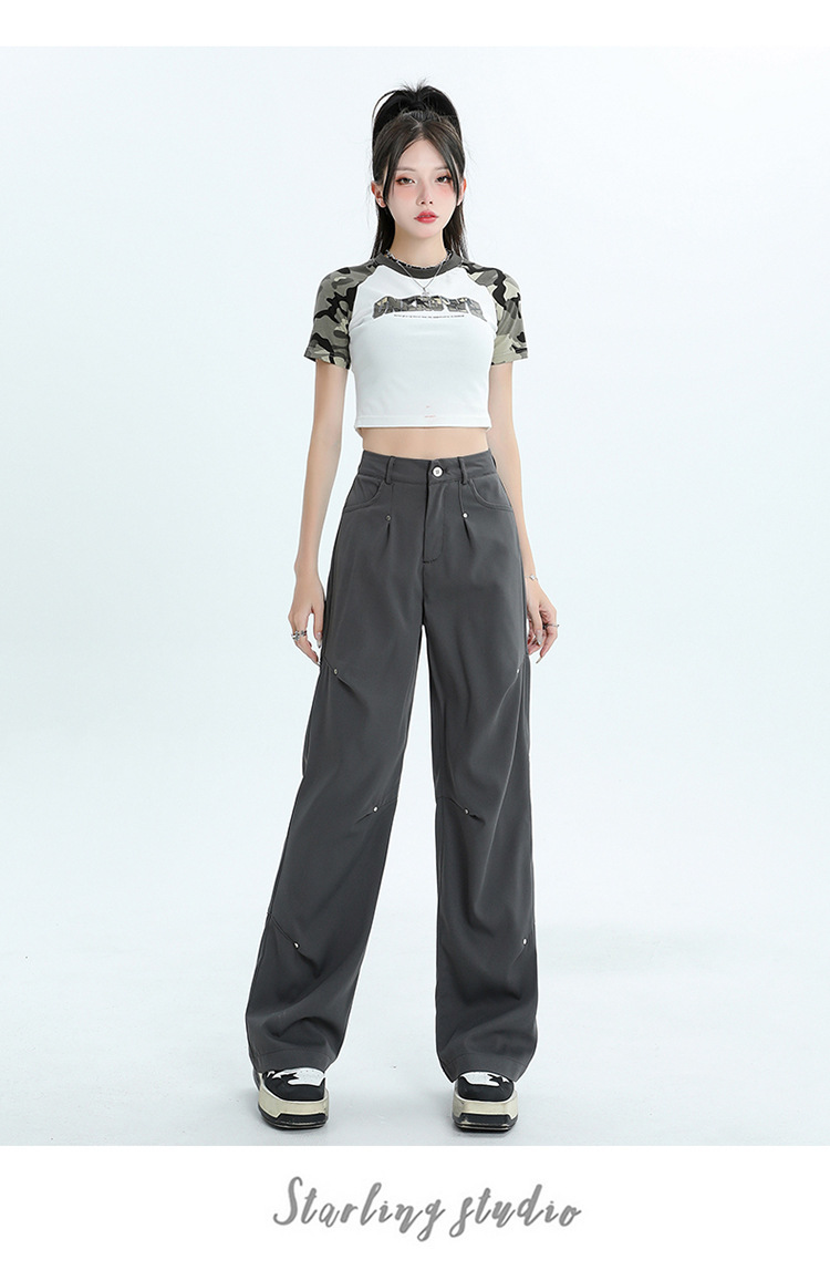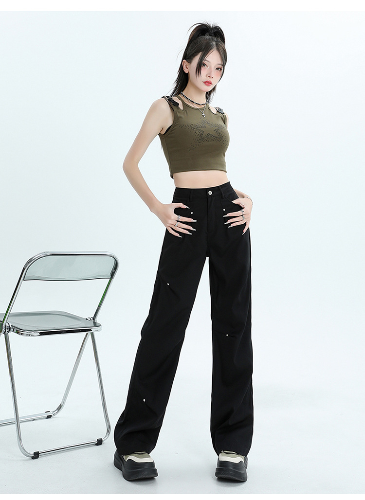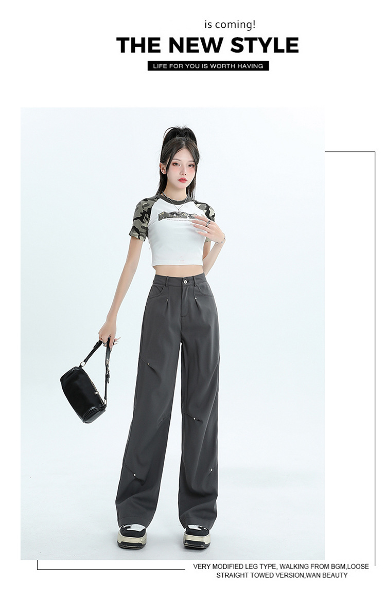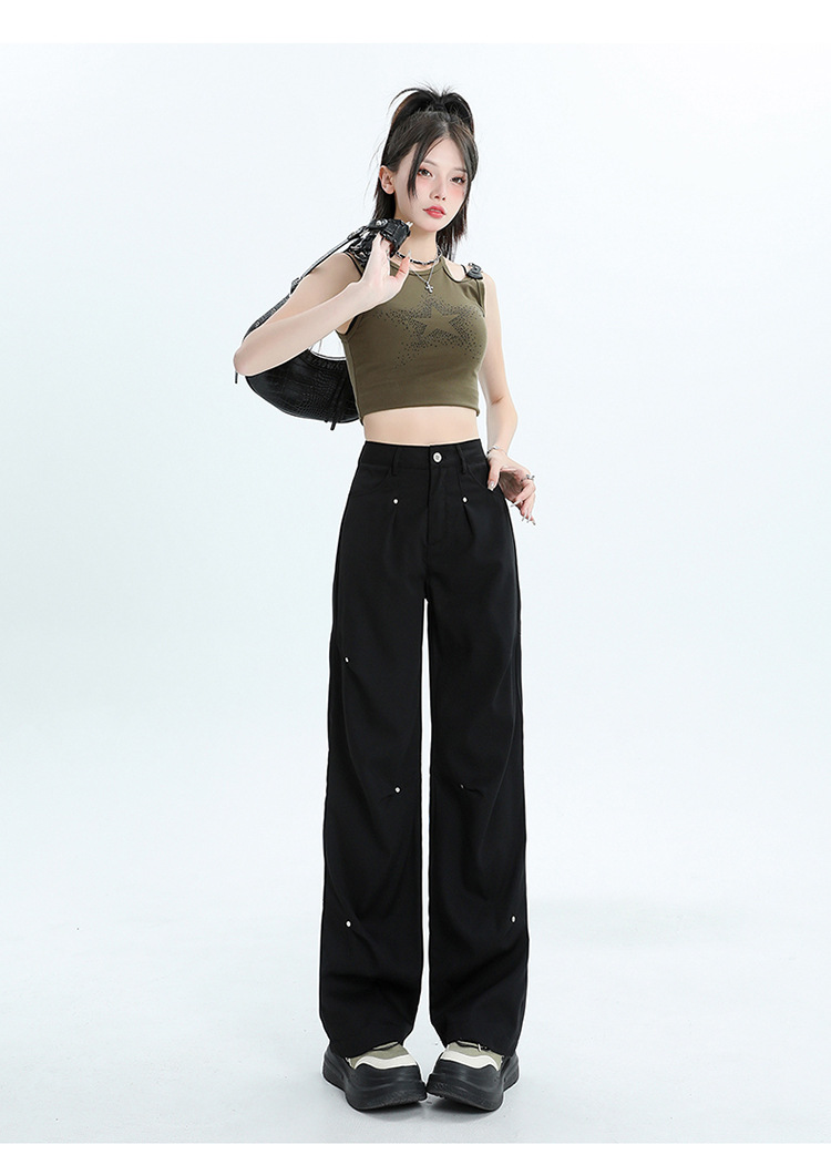 미국 스타일 높은 허리 잡힌 바지 여성용 2024 새로운 틈새 디자인 센스 리벳 레트로 캐주얼 올 매치 스트레이트 와이드 레그 바지스토어 가기