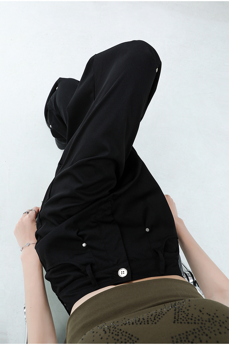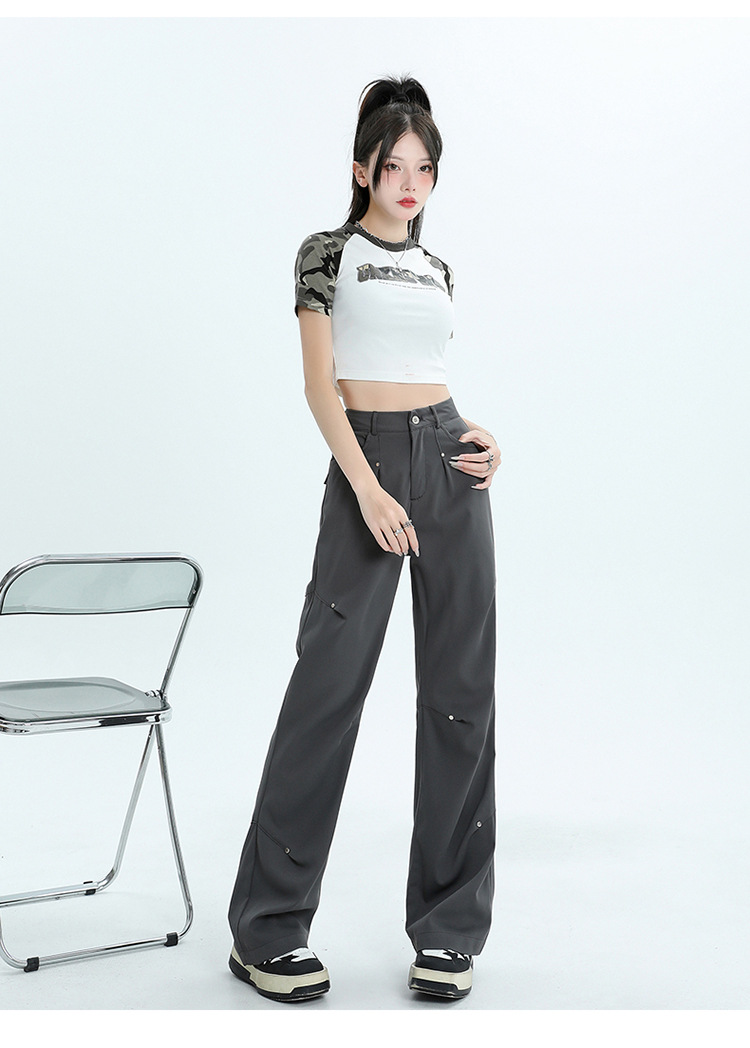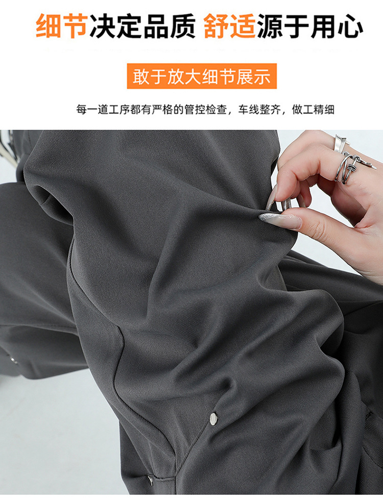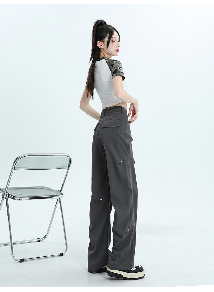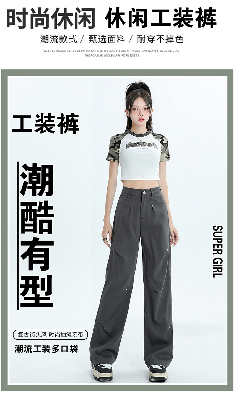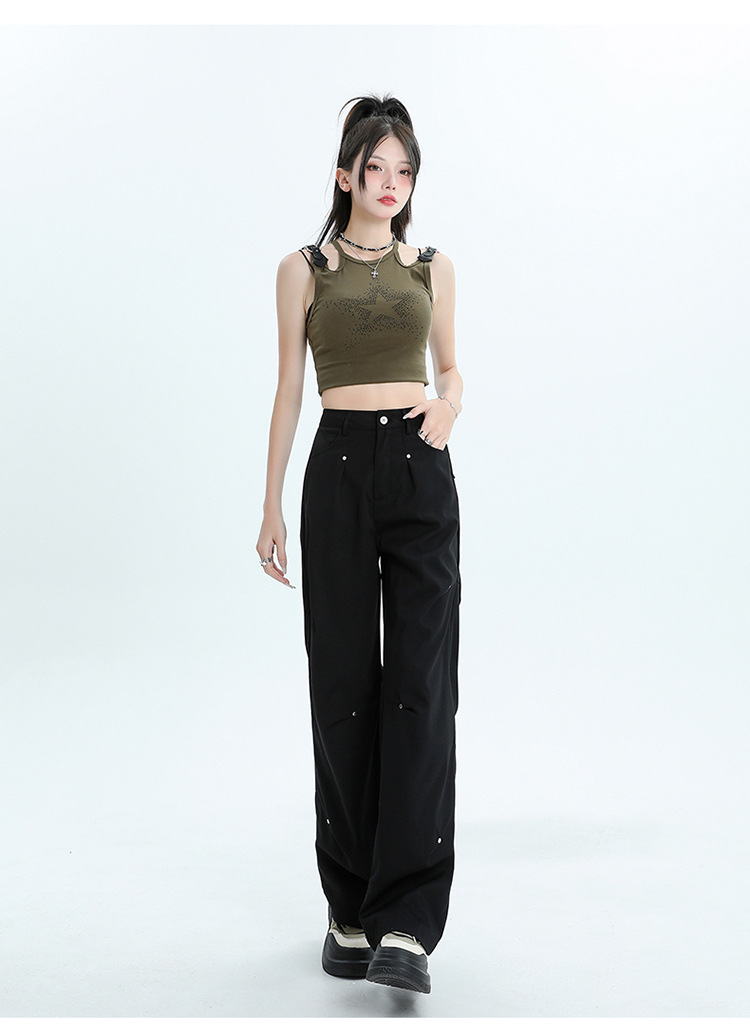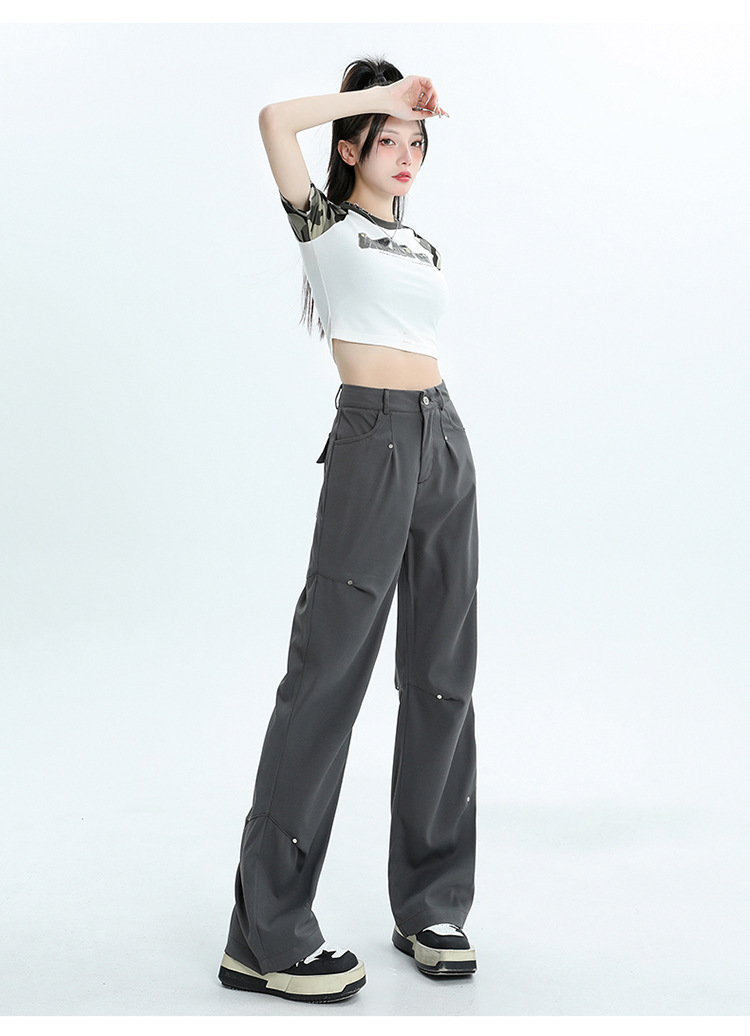 미국 스타일 높은 허리 잡힌 바지 여성용 2024 새로운 틈새 디자인 센스 리벳 레트로 캐주얼 올 매치 스트레이트 와이드 레그 바지스토어 가기
