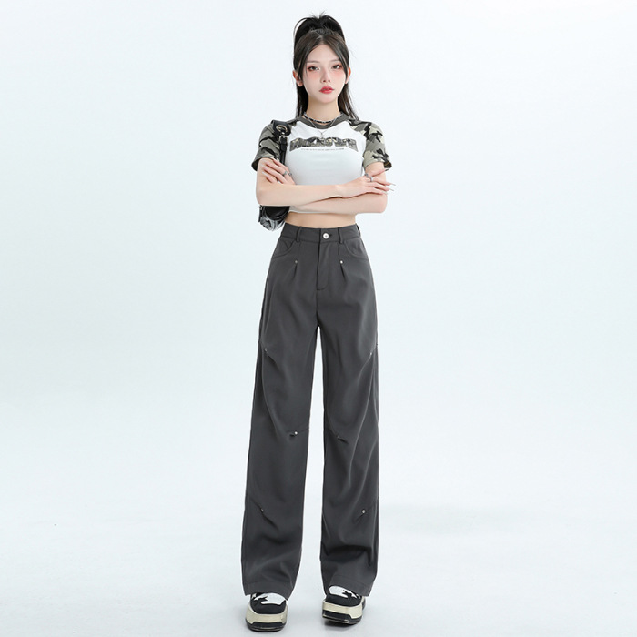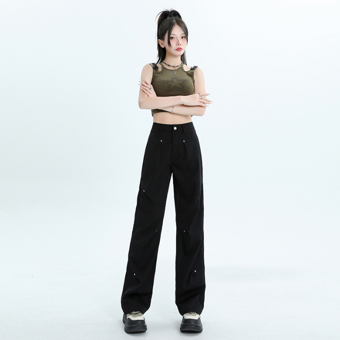 미국 스타일 높은 허리 잡힌 바지 여성용 2024 새로운 틈새 디자인 센스 리벳 레트로 캐주얼 올 매치 스트레이트 와이드 레그 바지