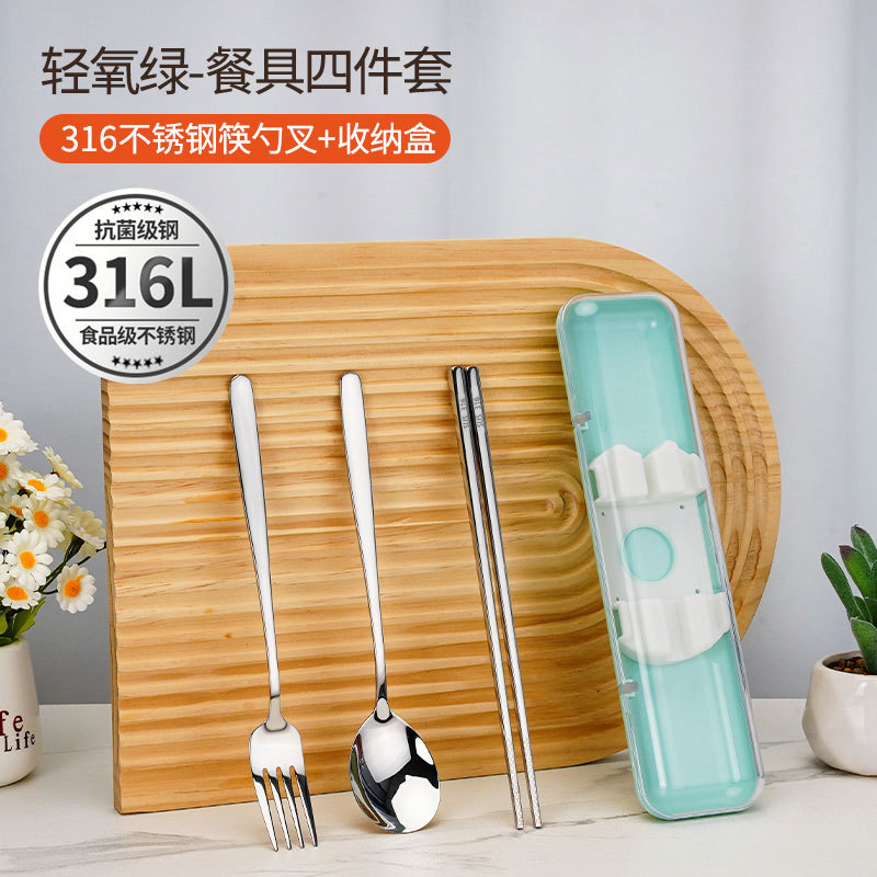 • [316L 스테인레스 스틸 | 항균 99.9%] 빛 산소 녹색-젓가락 숟가락 포크 세트 4