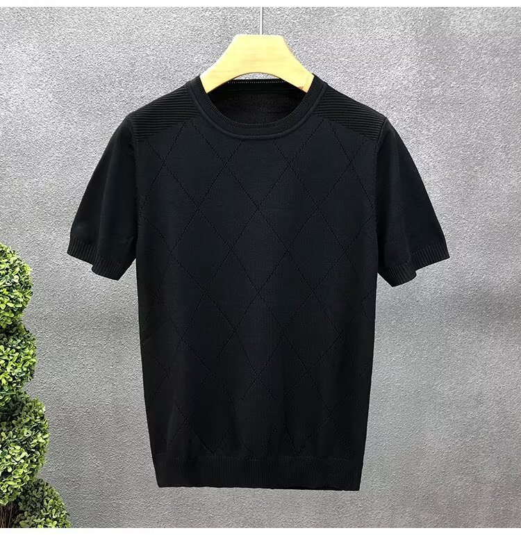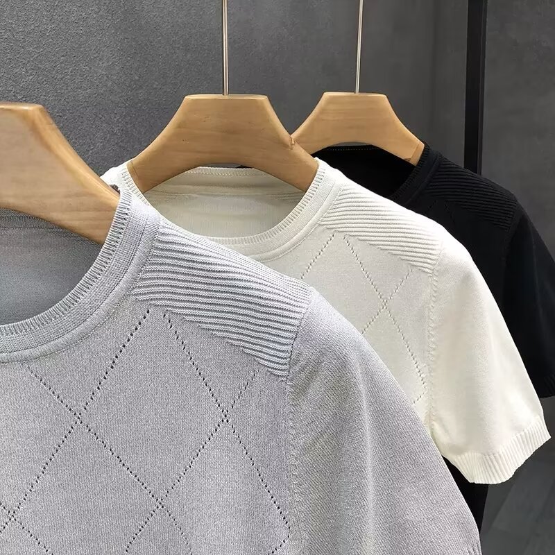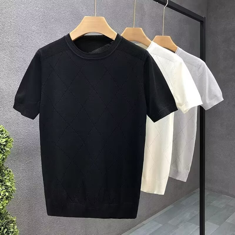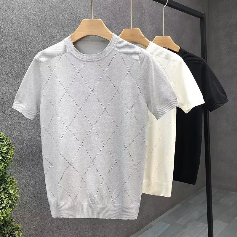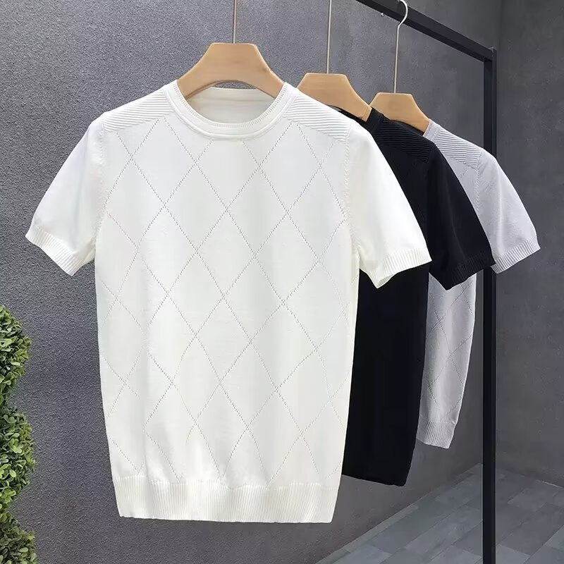 티셔츠 남성용 반팔 여름 얇은 아이스 실크 통기성 할로우 니트 라운드 넥 티셔츠 슬림 핏 스트레치 라이트 럭셔리