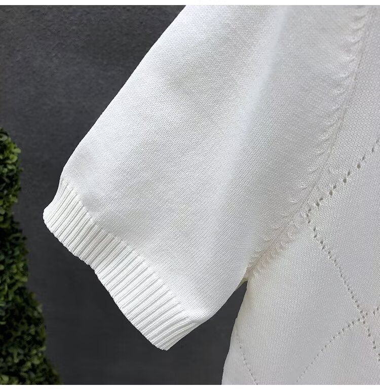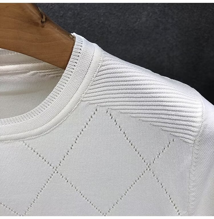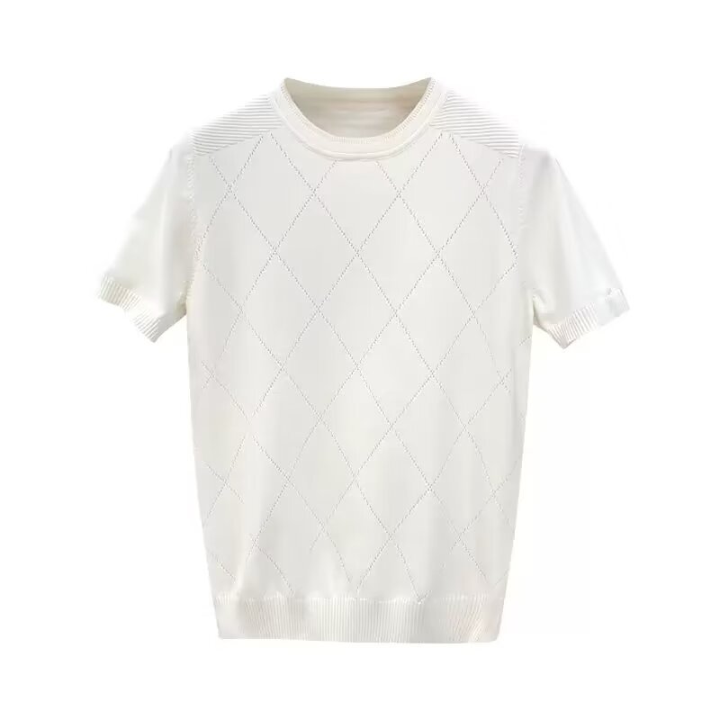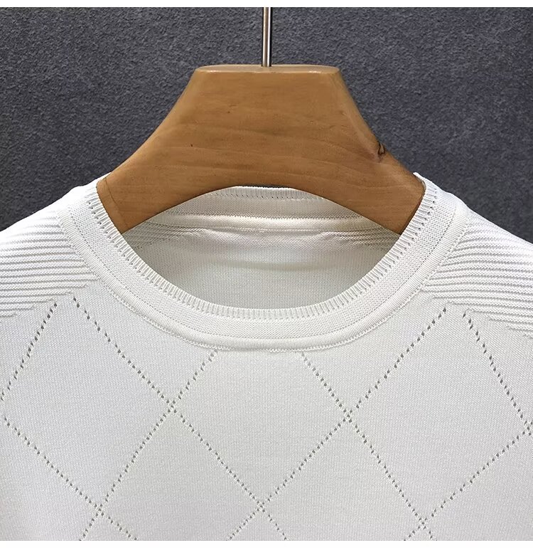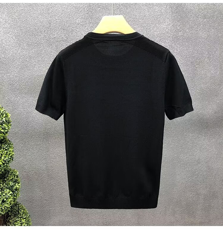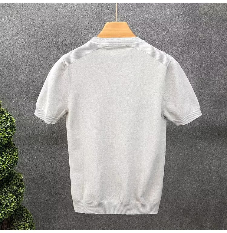 티셔츠 남성용 반팔 여름 얇은 아이스 실크 통기성 할로우 니트 라운드 넥 티셔츠 슬림 핏 스트레치 라이트 럭셔리