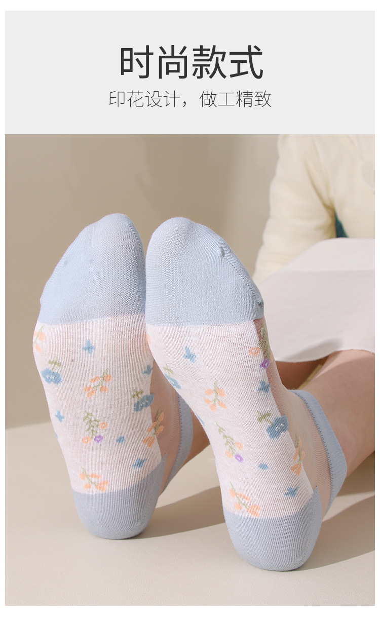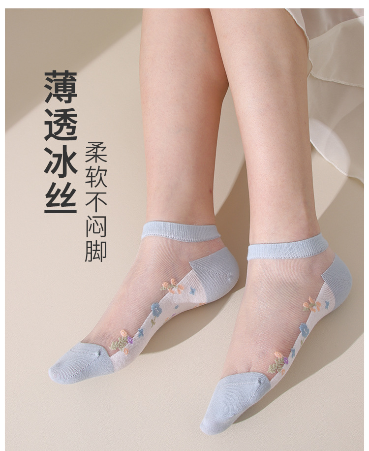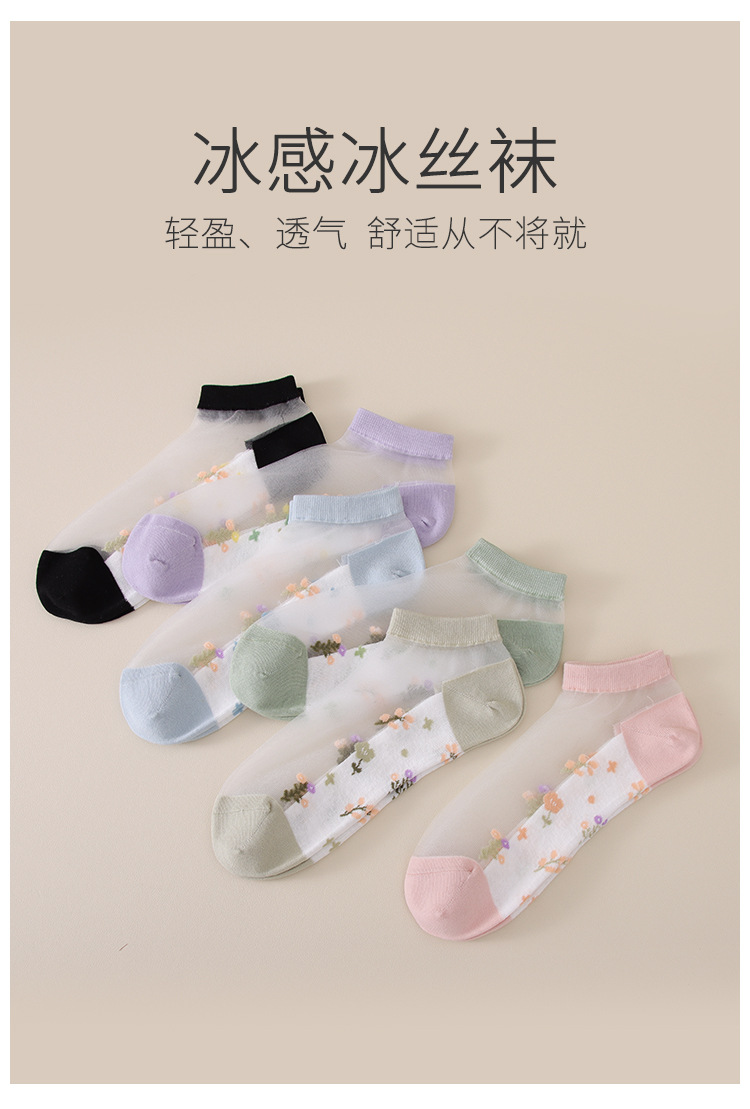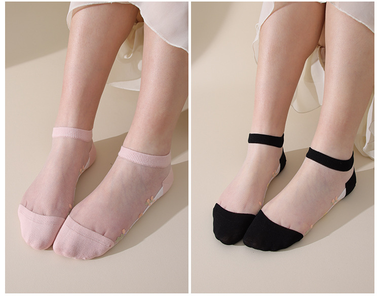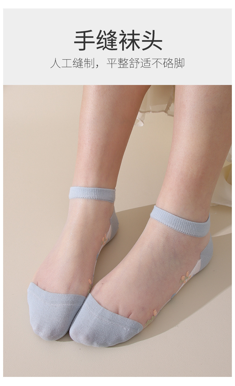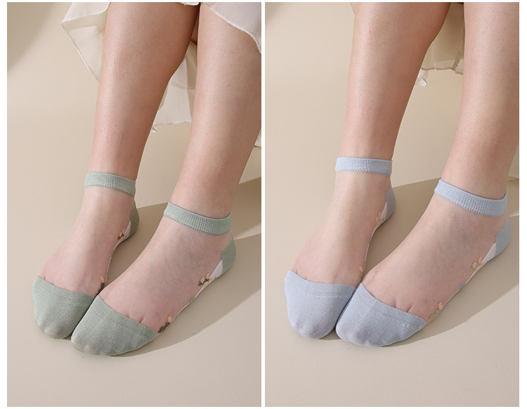 양말 여성의 봄과 여름 새로운 작은 꽃 크리스탈 실크 보트 양말 패션 뼈없는 손 바느질 유리 실크 여성 보트 양말 제조 업체 도매스토어 가기