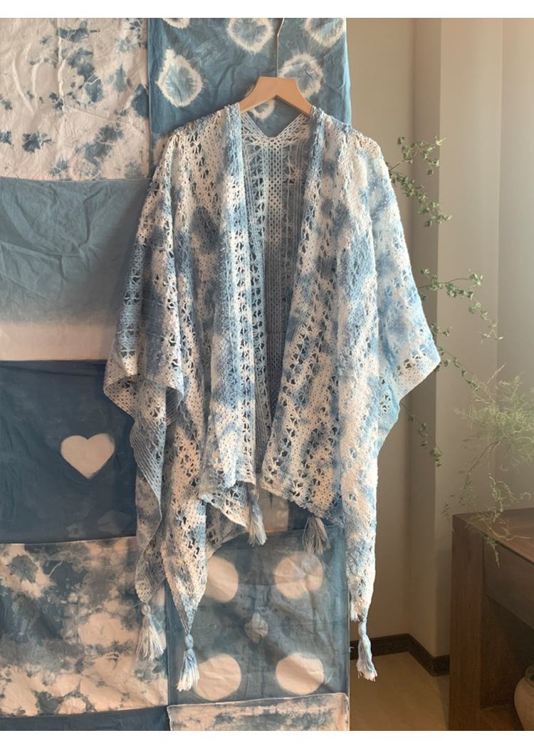 2024 니트 할로우 외국 스타일 패션 블루 다이 목도리 여성 외부 케이프 올 매치 여행 윈난 달리 봄과 여름 얇은스토어 가기