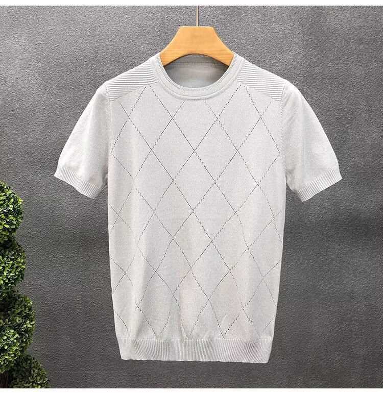 티셔츠 남성용 반팔 여름 얇은 아이스 실크 통기성 할로우 니트 라운드 넥 티셔츠 슬림 핏 스트레치 라이트 럭셔리