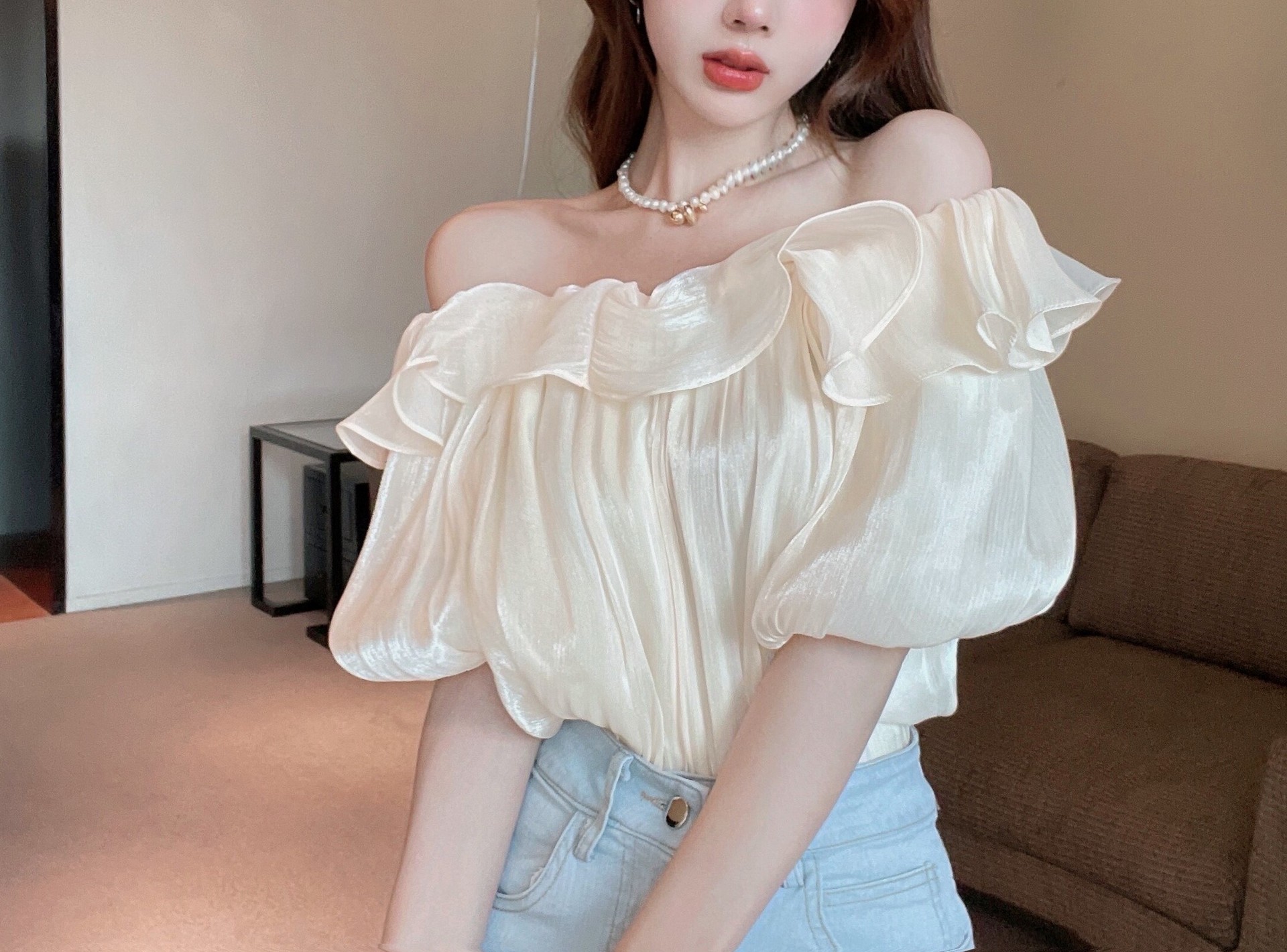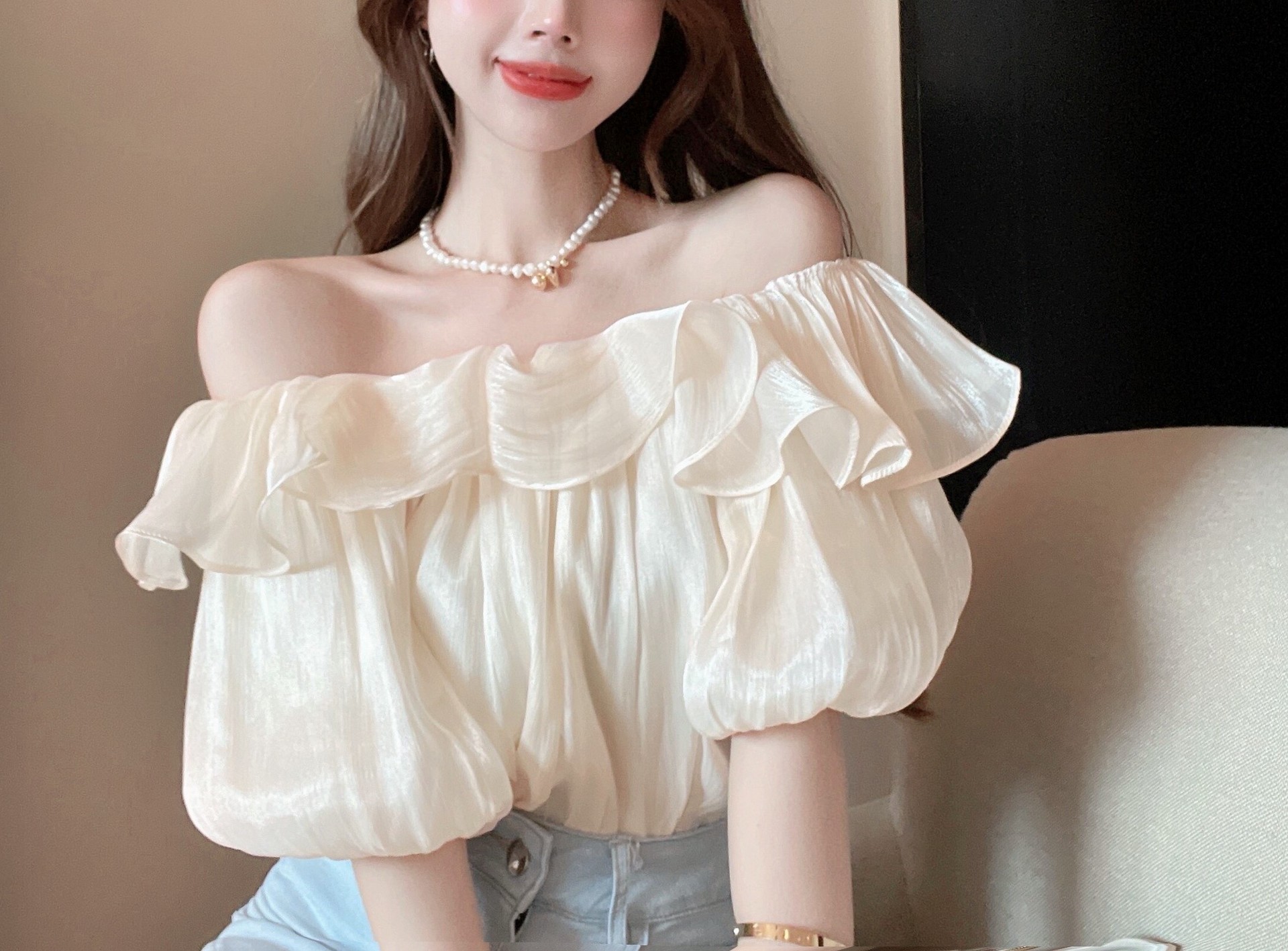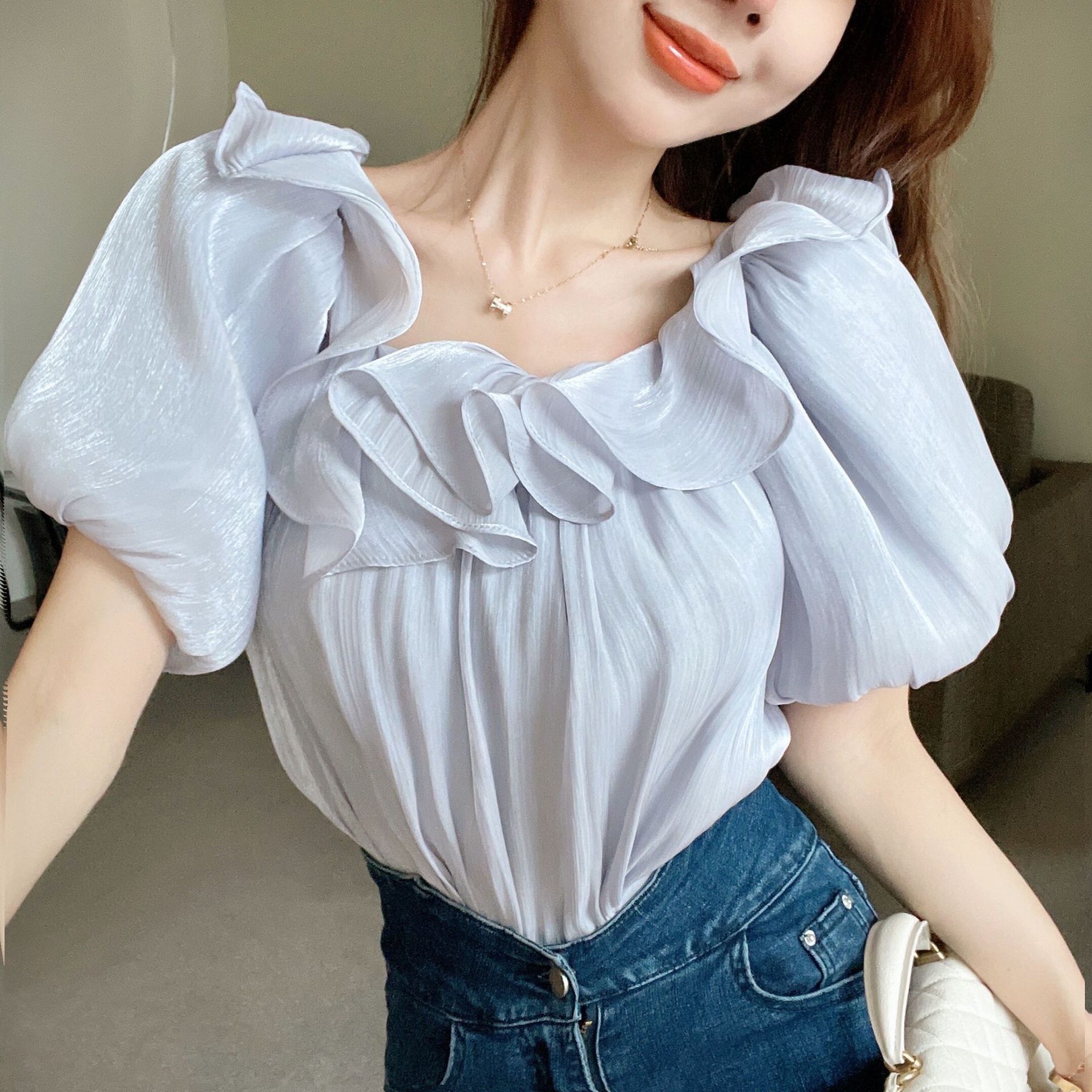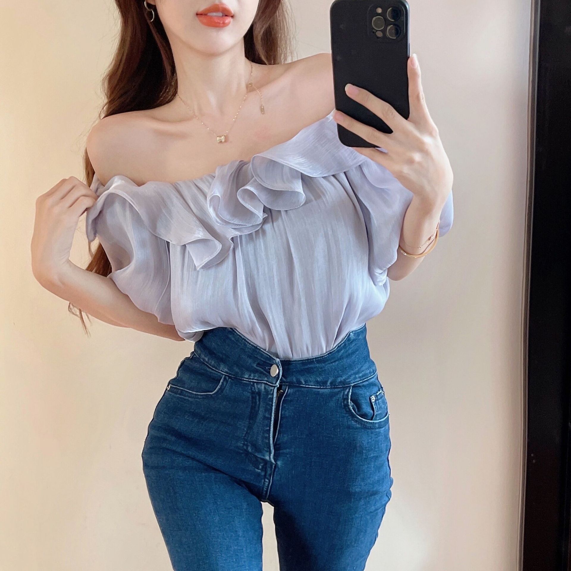 패션 우아한 어깨 셔츠 여성 디자인 센스 여름 틈새 탑 러플 세련된 어깨 쉬폰 셔츠 트렌디스토어 가기